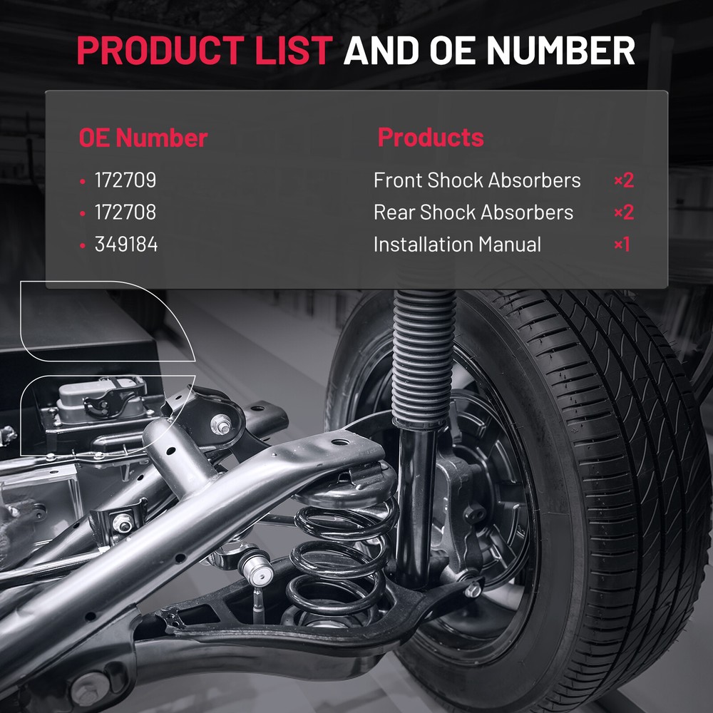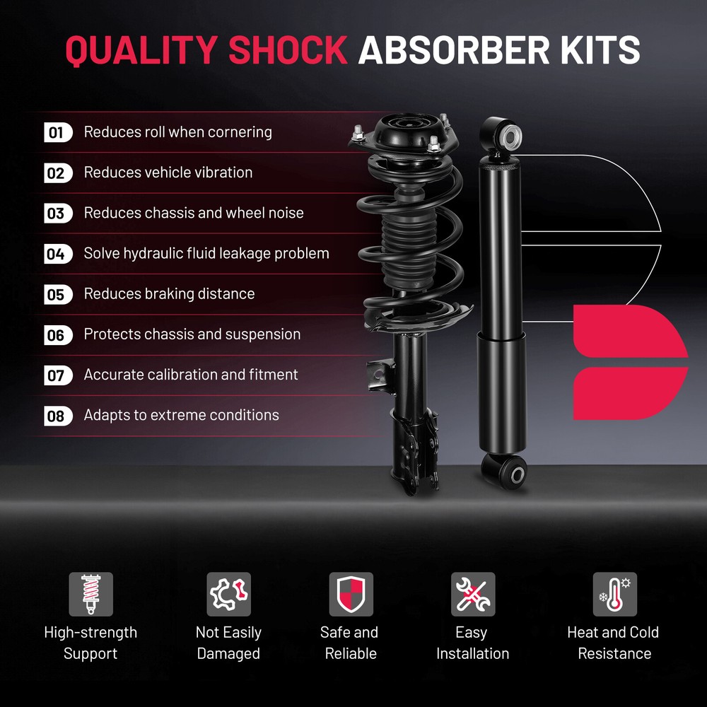 About this item VEHICLE FITMENT: Fit for 2011 2012 2013 2014 2015 2016 for Hyundai Elantra REFERENCE NUMBER: Replaces Complete Strut Assembly NO# 172708 / 554384 / 5671 KIT INCLUDES: 2x Front complete struts with coil springs + 2x Rear gas shocks absorbers (Driver and Passenger Side EASY INSTALLATION: Fully-assembled unit includes everything you need for strut replacement. No need for coil spring compressor and special tools PURCHASE NOTES: 1.Please check your vehicle YEAR.MAKE.MODEL with our description to avoid buying a wrong type for your vehicle; 2.Due to overwight or oversized,set of 4 struts will be packaged by TWO parcel sometimes For 2011-2016 Hyundai Elantra Front Complete Struts Rear Shocks Springs Assembly Front Struts & Coil Spring Assembly + Rear Shock Absorbers Kit Kit Includes: 1x Front Strut & Coil Spring Assembly - Driver Side - 172709 1x Front Strut & Coil Spring Assembly - Passenger Side - 172708 2x Rear Shock Absorbers - Driver & Passenger Side - 45671 Each Strut Assembly includes: Strut Coil Spring Boot Bumper Kit Spring Seat Isolator FITS MAKE MODEL YEAR RANGE SPECIFIC DETAILS HYUNDAI ELANTRA 2011 - 2013 GLS; Limited HYUNDAI ELANTRA 2014 - 2016 All Models Payment Delivery details Terms of sales About us Contact us Payment 1.We only accept PayPal. PayPal is the only online payment method we accept. Please make sure you have a valid/confirmed PayPal account prior bidding. 2.All Paypal Payments must be Confirmed. Payment must be made within 48hrs of the auction end time. Non-Paying bidders will be reported. 3.When you get your package,maybe you will pay some charges, it's taxes for local customs,not pay to us, and the fees are depends on the customs, all buyer are same. Delivery details 1.Items will be shipped within 2 business days after payment is received. 2.We ship to your eBay address. Please make sure your eBay address is correct. Buyer takes responsibility if eBay address is wrong. 3.Import duties, taxes and charges are not included in the item price or shipping charges. Please check with your country customs office for these additional charges. 4.We shipping using UPS or USPS from our nearest warehouse to you. Tracking numbers will be emailed upon shipment. Terms of sales 1.Please feel free to email us if you have any question. 2.We appreciate you contact us via eBay message when you are not satisfied rather than open case or leave negative feedback directly. We'll try our best to solve the issue. 3.Refund will be issued once we receive your returned items. Buyer is responsible for all return shipping charges. 4.Please contact us for return process before you return the item. 5.All items for exchange or refund must be returned in "as new" condition. About us We are the responsible seller ,always provide high-quality products and best service .If you have any questions, please contact us, and will try our best to help you. Please contact us by eBay Message, and we will reply you within 24 hours. Thank you very much! Contact us We are the professional auto parts manufacturer , and provide line lock, AN hose end fittings , fuel line , fuel filter , fuel regulator , exhaust cutout , exhaust tips , exhaust muffler and so on .The quality of the product to be secured. If you have any questions or any needs , please contact us , and will try our best to help you.