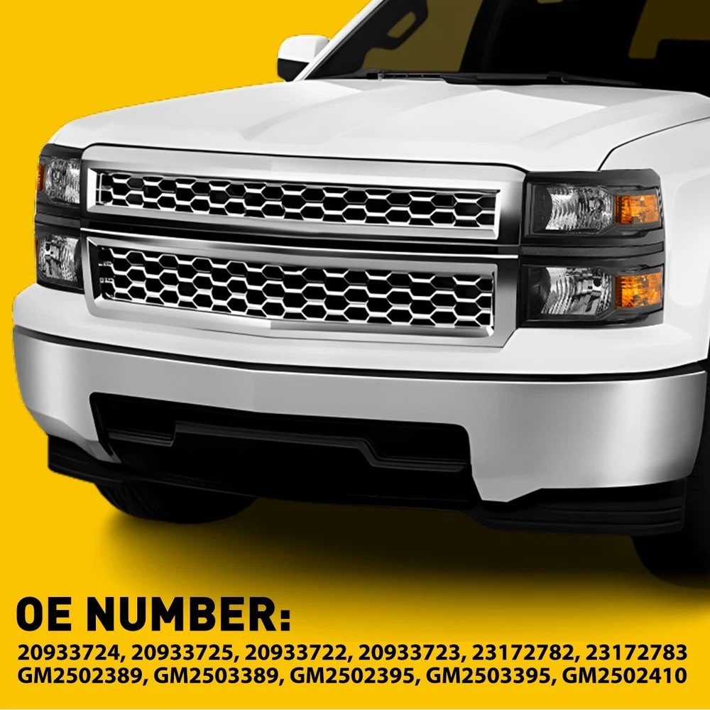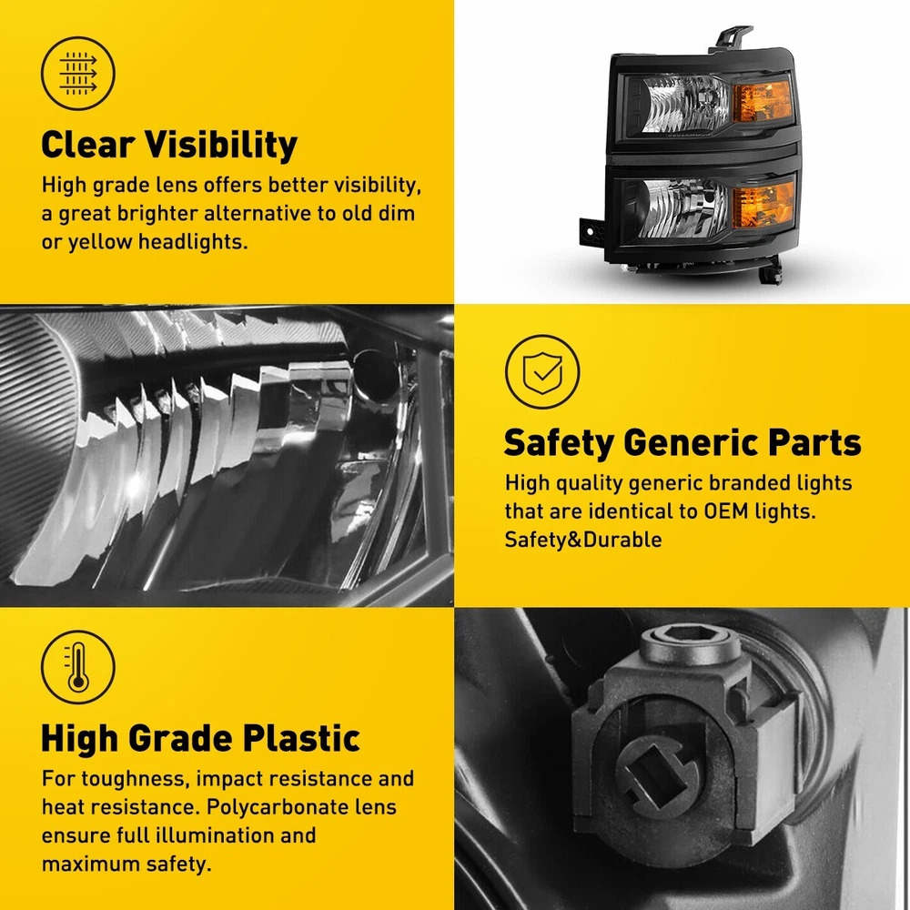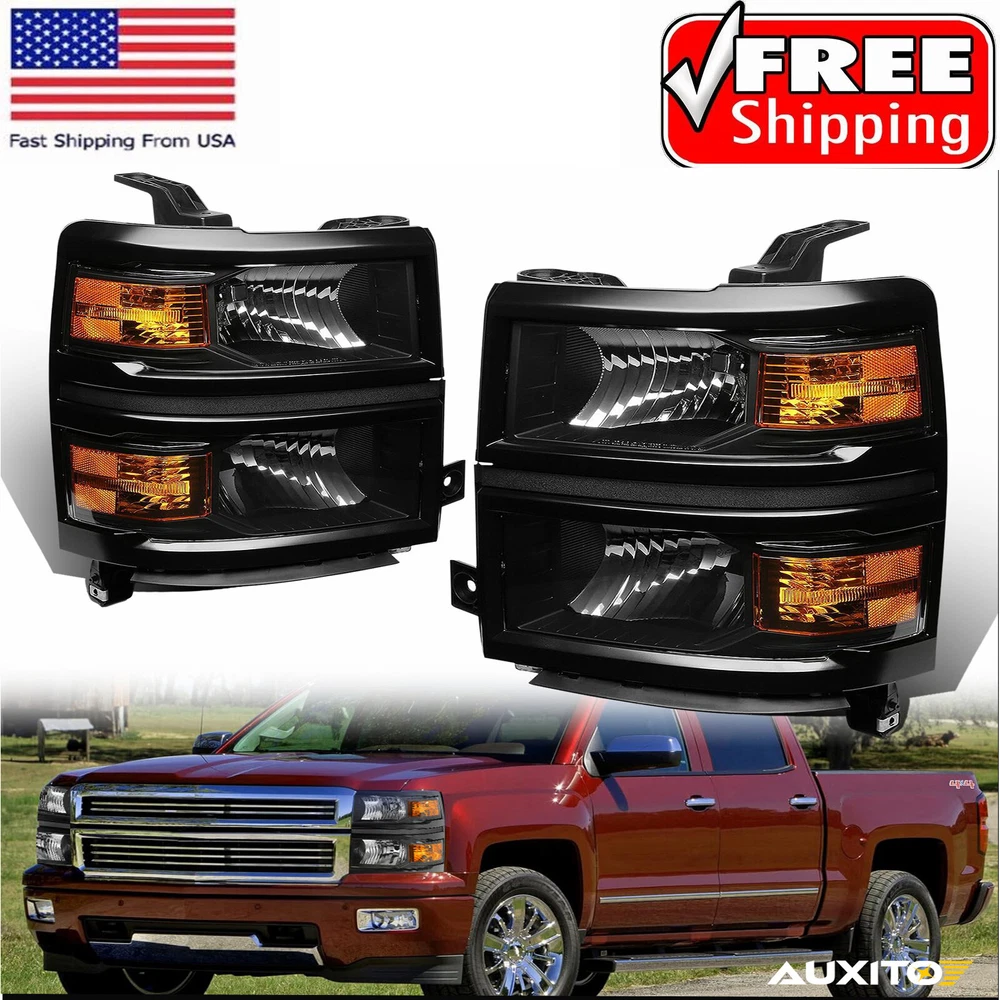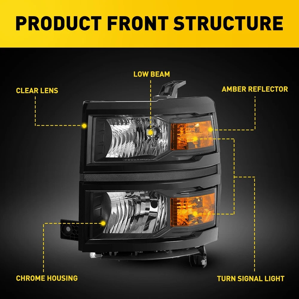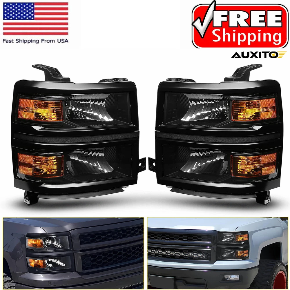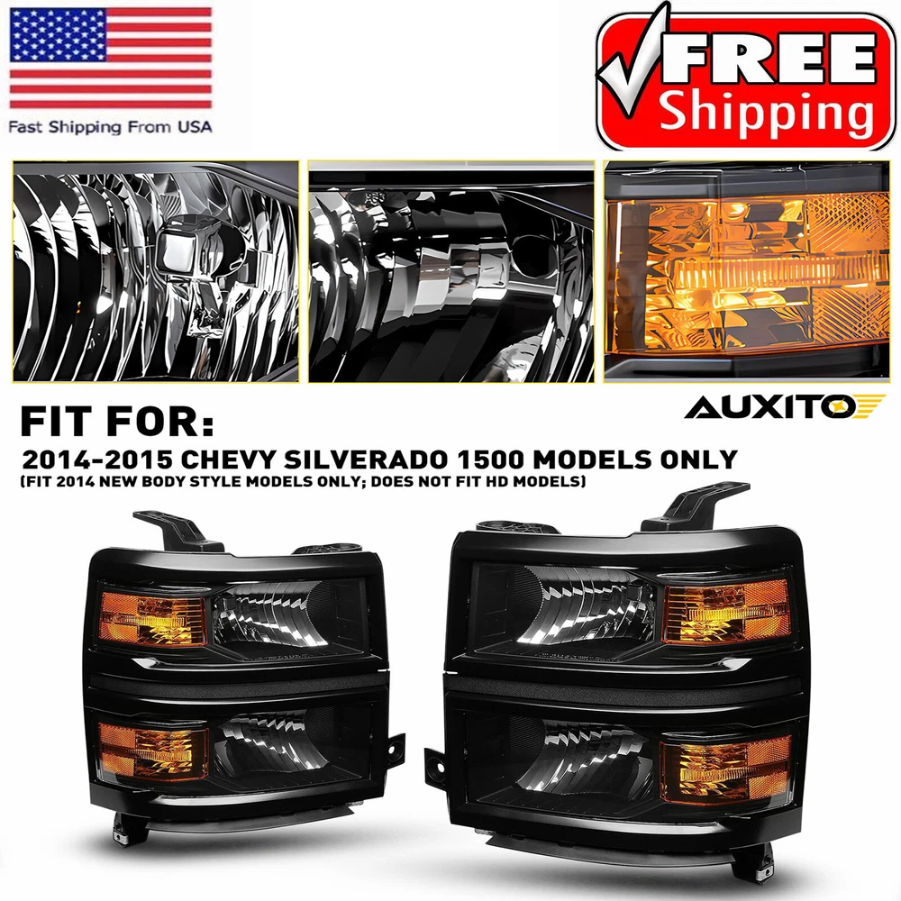 OE/OEM Part Number: GM2502389 GM2503389 GM2502395 GM2503395 GM2502410 Brand: AUXITO Packaging include: Headlights*2(Left, Right) Fitment Type: Direct Replacement Manufacturer Warranty: 3 Year FIT FOR 1: 2014-2015 Chevy Silverado 1500 Models Only Interchange Part Number: 20933724 20933725 20933722 20933723 23172782 23172783 2014 2015 Lighting Technology: Halogen Bulb Shape Code: 9005 High / H11 Low Beam Turn Signal: 7443A Placement on Vehicle: Front, Left, Right Note: Projector (Not includ)DRL( Not Include) Bulb (Not include) FIT FOR: 2014 New Body Style Models Only; Does NOT Fit HD Models Type: Headlight Assembly Parking Light: 7443 Lens Color: Clear Lens / Clear Reflector Superseded Part Number: GM2502389, GM2503389, GM2502395, GM2503395, GM2502410 UPC: DOES NOT APPLY Bulbs Included: No Style: OE Housing Color: Black keyword: BLACK HOUSING CLEAR CORNER HEADLIGHT HEAD LAMPS Features: Reflector Housing Material: ABS Plastic / Polycarbonate Lens Reflector Color: AMBER keyword 2: Left, Right Black Clear OE Style Headlight Items Included: Driver & Passenger Side Headlgihts Mounting Style: Screws gtin13: DOES NOT APPLY Manufacturer Part Number: 20933724, 20933725, 20933722, 20933723, 23172782, 23172783 keyword 1: OE Style Black Housing Amber Corner Headlights