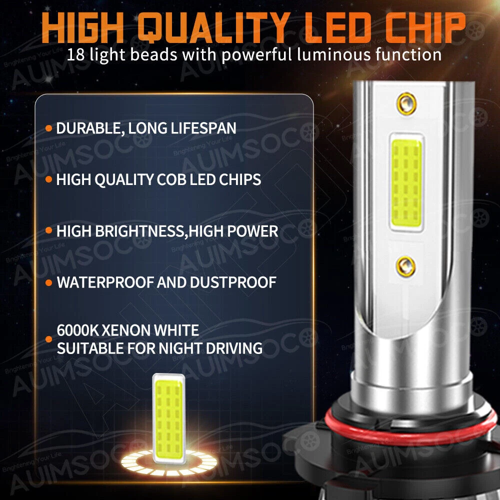 Description: AUIMSOCO LED Headlight Bulb Conversion Kit Upgrade Version 9005/HB3 High Beam + H11 Low Beam Replace Halogen Bulb Specifications: Plug Type: 9005 (High Beam) + H11 (Low Beam) Color Temperature: 6500K -Cold White Headlight Wattage: 40 W/Per Pair Headlight Lumens: 4000LM / Per Pair Working Voltage: DC 9V to 36V Material: Aviation 6063 Aluminum Pprofile Waterproof Level: IP68 Lifespan: > 50,000 Hours Fog Light Specification: Bulb Size: H11 Usage: LED Fog Light Voltage: DC 12V-24V Power: 30W/per pair Lumen: 3000LM/per pair Color Temperature: 6000K Cold White LED Chips: AUIMSOCO customized LED chips Material: Heatsink aluminum shell Fanless: yes, no noise Lifespan: 50,000 hours Waterproof Rate: IP68 Warranty: 1 years warranty Automotive LED Bulbs advantages: 1. AUIMSOCO LED lights than traditional halogen energy, more bright . High focus and max light output with a wider and farther lighting area, Safer Night Driving. 2. Xenon lamp brightness and proximity , but the LED lights light up without delay, to enhance road safety. Instant start no strong currents impact , effectively protecting the car comes with a battery , improving battery life of more than 30%. 3. Fast cooling , the appearance of the most advanced design , thermal structure ingenious and reasonable.Power driver with wide voltage constant current mode , the car can respond to a variety of voltage instability , the effective protection of normal use Led efficient and simple structure. 4. Heating temperature is low , protect the car . Xenon working temperature up to 800 ° -1000 ° , the main reason for the car ignition 5. LED car headlights simple structure, fewer parts than xenon lamps, significantly lower than the xenon lamp failure rates ! Package Includes: 1x Pair 9005/HB3 High Beam 1x Pair H11 Low Beam 1x Pair H11 Fog Lights Randomly send new and old packaging boxes Warm Tips: This model comes in multiple models, If you are not sure about the bulb size, please send us your vehicles' make/model/year via ebay message to confirm with us before purchasing. Any questions please feel free to contact us, we will help you solve it.