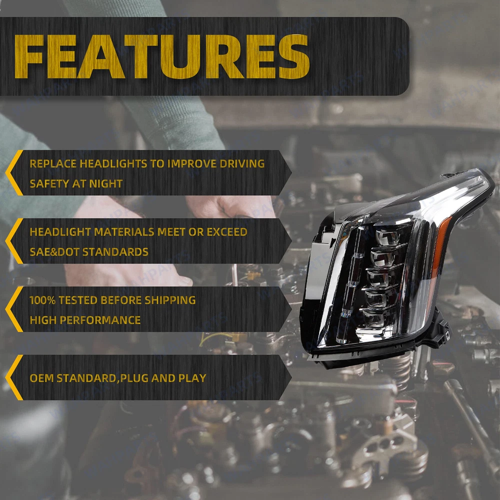 Features & details 【Compatible With】 For Cadillac Escalade 2015-2020 【Manufacture Part Number】 84580182, 23304390, 84216044 ( Front, Left Driver Side ) 【Package Includes】 1x Headlight Assembly ( As picture shows ) 【 Item Description 】 Type : Headlight Light Assembly Condition : 100% New Lens Color :Clear Housing Color :Black Lighting Technology:LED Fitment Type: Direct Replacement 【 Features 】 Headlight Assemblies Undergo Strict Quality Control to Ensure it is Waterproof & Impact / UV Resistant; Easy Installation. Direct Bolt On Replacement From Your Original Headlights! No Wiring or Modifications Needed! No Installation Instructions Included, Professional Installation is Highly Recommended! 【Service & Warranty】 Purchase from WAHPARTS, enjoy 1 year no worries-warranty, whenever you met issue when installing or using, please contact us via eBay Message, and we will reply within 24 hours and help solve the problem. 100% Testing Before Packing This Parts Are Designed To Fit And Function As The Original Equipment Did. Longest Lasting And Most Efficient L ight Assembly S tyle. Features: DOT-Certified ISO-Certified SAE-Certified Item Type: Headlight Assembly Package include: 1pc Left Driver Side Headlight Assembly Placement on Vehicle: Front, Left Driver Side Customer Question & Answers Q1: Will This Part Fit My Vehicle? We list all the compatiblity, if your vehicle does not show up on the compatibility table at the top of our listings, welcome you to contact us for free consulation before purchasing a product. Q2: Does they come with warranty? All of our product comes with 1-year warranty, but some times you need to pay the shipping fee. Q3: How to use it? If you don't know how to install this accessory, welcome to contact us, we will provide you with a video guide. Payment Shipping Warranty & Service Returns/Exchanges Contact us Payment Most of the payment methods are available, such as Paypal, Payoneer, Credit Card. Within 1 day of receiving your payment, we will start processing your order. Shipping All Items Will Be Ship Within 1working Days, and We Will Ship out All Orders As Soon As Possible After Payment Verified, Please Allow up to 1-6 Business Days for Delivery. Why Choose the Us Stock? 1. Us Local Shipping, No Extra Customs Cost. 2. Fast Delivery: 1-6 Working Days Delivery. Warranty & Service All the product in our store come with a 1-year-warranty. If there is a problem with the product you purchased within 1 year, please contact us, we will provide you with after-sale protection. Our job is not complete until each customer is satisfied! Receiving positive feedback is extremely important to us. We give all our buyers positive feedback as soon as payment is received Negative feedback and bad ratings do not solve the problem! If you contact us via eBay, we will be more than happy to work with you! Returns/Exchanges If you received an incorrect, damaged, defective, or item not as described , contact us for a partial/full refund or replacement on our costs. If we shipped you the wrong part, we pay for the return shipment and send you the correct part. If you ordered the wrong part, contact us for a return address and simply return it,give us a tracking number. We will send you the new item as soon as the returned package is received; If you simply don't want the part, ship it back and give us a tracking number. After we receive the item, we will refund the item price minus shipping costs. All returns must be done within 30 days after receiving the package. Parts must be new and unused in the original condition: including box, packaging and all other accessories,or we will charge you a partial costs. Contact us If you encounter any problems during purchase or use, please contact us via eBay message directly. On Nov 14, 2024 at 03:06:45 PST, seller added the following information: