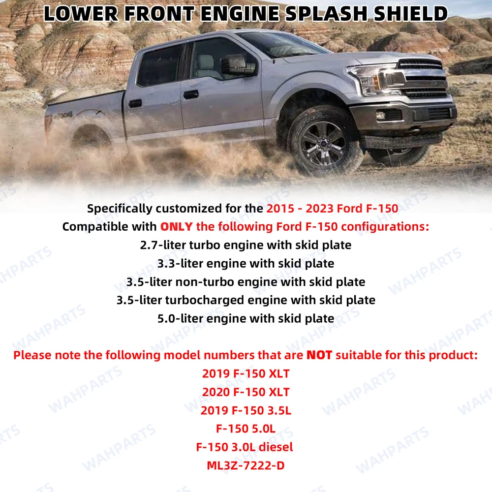 Features & details 【 Replacement & Part Number 】 FL3Z-5D032-D, FL3Z5D032D 【 Compatible With 】 2015-2023 Ford F-150 F150 2.7 LITER TURBO, w/skid plate 3.3 LITER, w/skid plate 3.5 LITER W/O TURBO, w/skid plate 3.5 LITER W/TURBO, w/skid plate 5.0 LITER, w/skid plate 【ATTENTION】 Please note the following model numbers that are NOT SUITABLE for this product: 2019 F-150 XLT 2020 F-150 XLT 2019 F-150 3.5L F-150 5.0L F-150 3.0L diesel ML3Z-7222-D 【 Features 】 High-Quality - Made of Heavy Duty steel and durable materials, and coated with a rust-proof finish, this splash shield can withstand various harsh environments Easy Installation - This Engine Splash Shield is simple and easy to install, requiring no modification. Design - Its unique design features heat dissipation holes, effectively dissipating the heat generated by the engine to maintain optimal performance. Made of high grade materials. 100% tested before shipment. No need adjustment. 【 Package Includes 】 1* Lower Front Splash Shield 2* Short Bolts 4* Long Bolts 4* Lock Washers 9* Hex Nuts 24 * Flat Washers Notes: - Fitment above is for reference only, please check the OE number, models and years before you purchase. - Installation instruction is not included, professional installation is highly recommended. 【Service & Warranty】 Purchase from WAHPARTS, enjoy 1 year no worries-warranty, whenever you met issue when installing or using, please contact us via eBay Message, and we will reply within 24 hours and help solve the problem. Customer Question & Answers Q1: Will This Part Fit My Vehicle? We list all the compatiblity, if your vehicle does not show up on the compatibility table at the top of our listings, welcome you to contact us for free consulation before purchasing a product. Q2: Does they come with warranty? All of our product comes with 1-year warranty, but some times you need to pay the shipping fee. Q3: How to use it? If you don't know how to install this accessory, welcome to contact us, we will provide you with a video guide. Payment Shipping Warranty & Service Returns/Exchanges Contact us Payment Most of the payment methods are available, such as Paypal, Payoneer, Credit Card. Within 1 day of receiving your payment, we will start processing your order. Shipping All Items Will Be Ship Within 1working Days, and We Will Ship out All Orders As Soon As Possible After Payment Verified, Please Allow up to 1-6 Business Days for Delivery. Why Choose the Us Stock? 1. Us Local Shipping, No Extra Customs Cost. 2. Fast Delivery: 1-6 Working Days Delivery. Warranty & Service All the product in our store come with a 1-year-warranty. If there is a problem with the product you purchased within 1 year, please contact us, we will provide you with after-sale protection. Our job is not complete until each customer is satisfied! Receiving positive feedback is extremely important to us. We give all our buyers positive feedback as soon as payment is received Negative feedback and bad ratings do not solve the problem! If you contact us via eBay, we will be more than happy to work with you! Returns/Exchanges If you received an incorrect, damaged, defective, or item not as described , contact us for a partial/full refund or replacement on our costs. If we shipped you the wrong part, we pay for the return shipment and send you the correct part. If you ordered the wrong part, contact us for a return address and simply return it,give us a tracking number. We will send you the new item as soon as the returned package is received; If you simply don't want the part, ship it back and give us a tracking number. After we receive the item, we will refund the item price minus shipping costs. All returns must be done within 30 days after receiving the package. Parts must be new and unused in the original condition: including box, packaging and all other accessories,or we will charge you a partial costs. Contact us If you encounter any problems during purchase or use, please contact us via eBay message directly. On Feb 8, 2025 at 04:19:32 PST, seller added the following information: