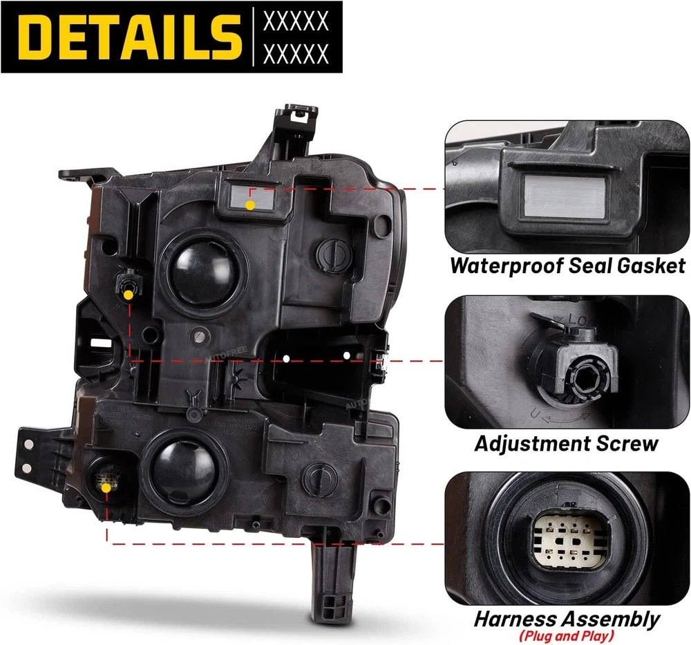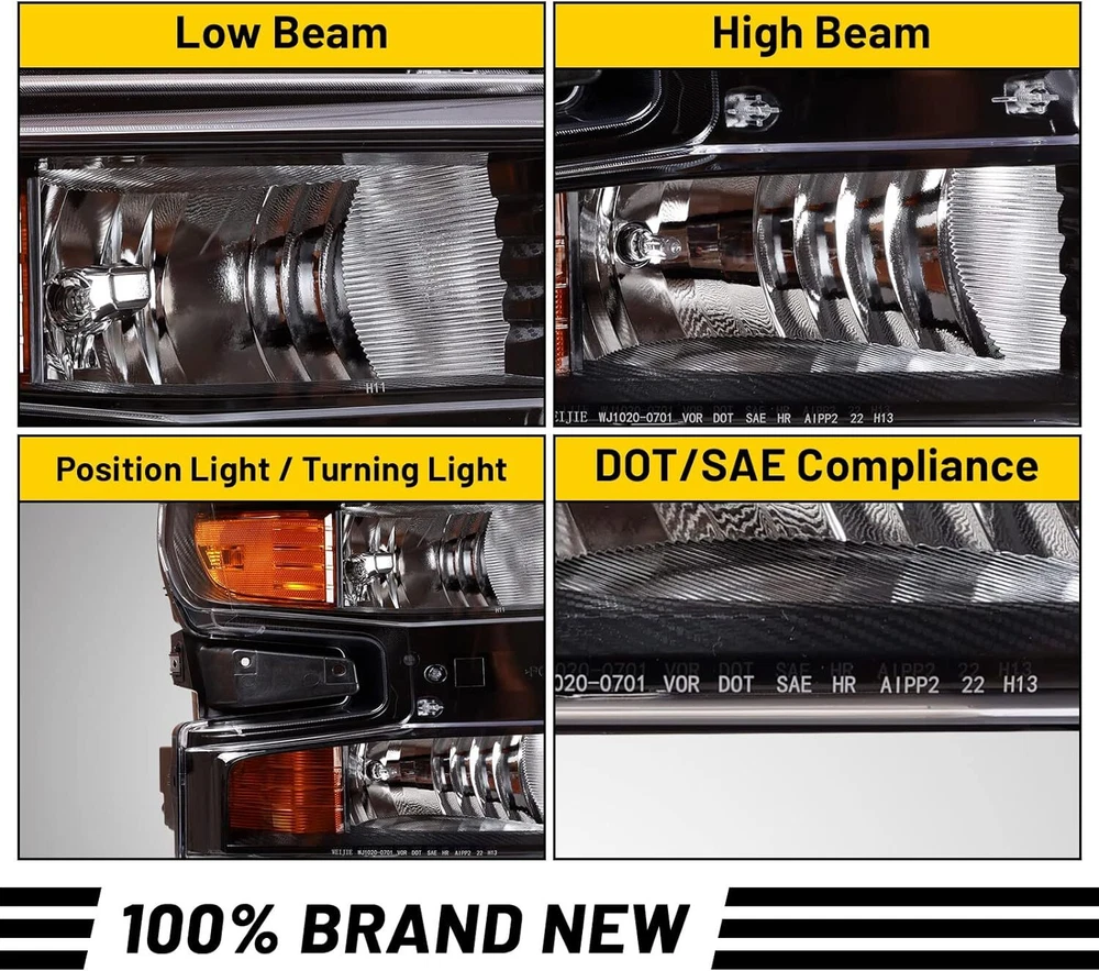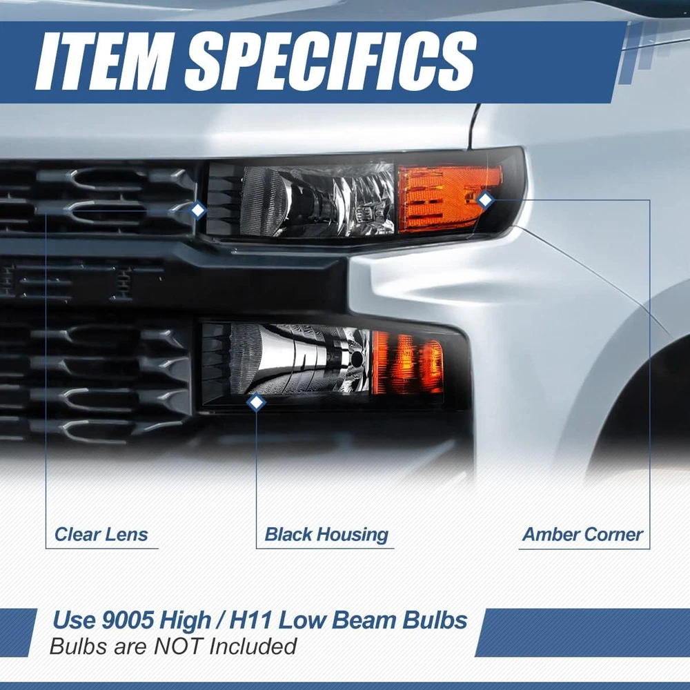Head Lights Tail Lights Fog Lights Turn Signal Bumper Fender Flare Inner Fender Hubcaps Refrigerator Other Items for sale Head Lights Tail Lights Fog Lights Turn Signal Bumper Fender Flare Inner Fender Liners Portable Refrigerator Specification Low Beam: H11 12V 55W High Beam: HB3(9005) Turn Signal Lights: 7443 Material: PMMA (OEM Grade) Placement on Vehicle: Front, Left, Right Color Finish: Black Housing / Clear Lens / Amber Reflector Wiring Harness: Not included (Plug & Play) Fitment Type: Direct Replacement Certification: DOT/SAE Compliance Fitment For 2019 2020 2021 Chevrolet Silverado 1500 For 2022 Chevrolet Silverado 1500 LTD Pls Note: Fits WT/Custom/Custom Trail Boss Model ONLY Excludes LED Headlight Models Only Fits Models with Factory Halogen Headlights Package Include 1 Pair of Headlights (Driver & Passenger Side) 2* 9005 Bulbs 2* H11 Bulbs