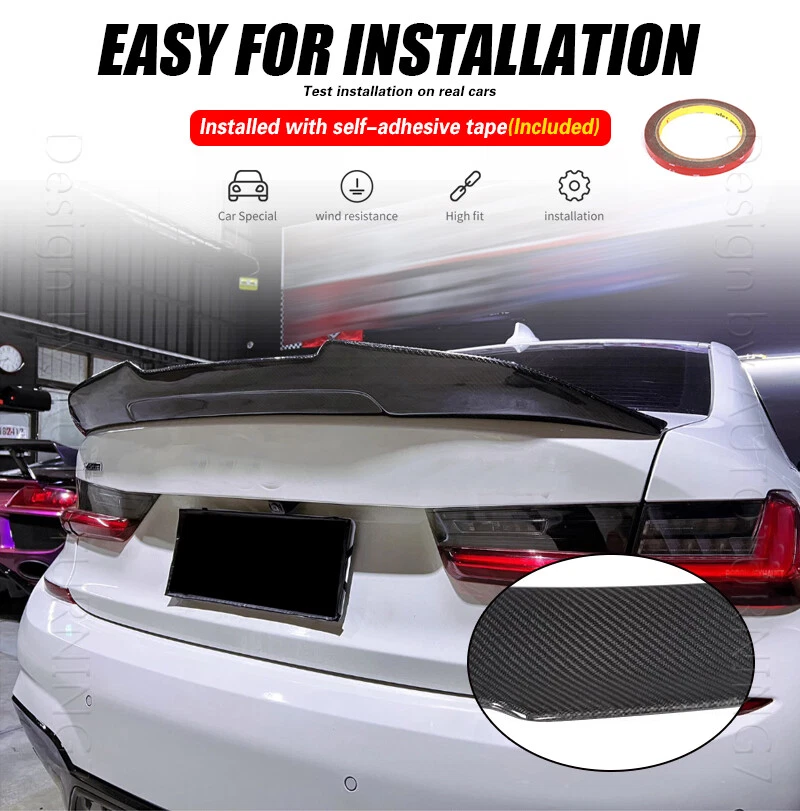Fitment: Fits for BMW 3 Series G20 Sedan G80 M3 2018-2025 Specifications: Product Name: Rear Spoiler Material: Carbon Fiber Package Size:131*32*11cm Package Weight:2.32kg Features: Made of High Quality Lightweight Carbon Fiber. Latest Design GT Wing Spoiler Completed Kit, Improve Handling And Make Tail More Stable in High Speed. Water Transfer Carbon Fiber for Highest Durability and Appearances. Adjustable Angles for Customizable Usages and Efficiencies, Enhances Aerodynamic. Reduces Drag, Increases Fuel Efficiency, Reinforces Downforce, Traction and Stability. Double-sided adhesive paste, Easy to Install. Package included: 1 x Spoiler with self-adhesive glue tape Carbon Fiber Spoiler FOR BMW The Rear Trunk Spoiler is one of the simplest mods you can do to the exterior of your car that will give your car that completely different look. Not only are spoilers meant for great looks, they also help with the aero dynamics of the car by lowering drag, or helping to put more downforce on the car making sure that the wheels stay grounded for maximum traction. Fitment: Fits for BMW 3 Series G20 Sedan G80 M3 2018-2025 Specifications: Product Name: Rear Spoiler Material: Carbon Fiber Package Size:131*32*11cm Package Weight:2.32kg Features: Made of High Quality Lightweight Carbon Fiber. Latest Design GT Wing Spoiler Completed Kit, Improve Handling And Make Tail More Stable in High Speed. Water Transfer Carbon Fiber for Highest Durability and Appearances. Adjustable Angles for Customizable Usages and Efficiencies, Enhances Aerodynamic. Reduces Drag, Increases Fuel Efficiency, Reinforces Downforce, Traction and Stability. Double-sided adhesive paste, Easy to Install. Package included: 1 x Spoiler with self-adhesive glue tape Delivery details Payment and TAX Return Policy Warranty Contact us Delivery details NOTE: The shipping fee is only for the mainland of each country, it does not include the overseas territories, such as Virgin Islands (U.S.) , Puerto Rico, Hawaii , French Reunion Island, etc. But on ebay, when buyers from Puerto Rico and overseas territories , the shipping fee is equal to United States, it is NOT correct,. please contact us for correct shipping fee, or we will cancel the order. Sorry for the inconvenience, and thanks for your cooperation. 2. If you want to upgrade the shipping, please contact us before making payment, we will revise the shipping fee. 3. We will ship according to your Ebay address. Please make sure it is correct and include phone number for delivery. If you want to know the exact shipping time , please contact us . Payment and TAX 1.We accept Multiple Payment Methods Available: Credit Card, Debit Card, Gift Card, Apple Pay, Goggle Pay, PayPal and PayPal Cred. 2.Please leave note for your special request (e.g. Colors or Size) in ebay note when you pay the order. 3.Your must complete the payment within 7 days or Ebay will automatically open unpaid item case For US Buyer:The invoice value of each item is less than 800USD ,so you no need to pay any tariff . NON-US Buyer Note: Most countries are tax free based on our invoices, if tax is required, which will be buyer's responsibility. Return Policy 1.Customer satisfaction is our top goal. We believe our items are so outstanding. All products are quality checked. They are new and in good condition when shipped to our customers. We are convinced you will be happy with your Purchase. 2.If product is defective or damage upon arrival, or wrong product shipped, please contact us immediately. Returns accepted within 30 days of delivery date and item must be in original new condition, not worn or altered in any way with attached tags & wrap. Otherwise deal is final. Return shipping must be paid by buyer. Please always contact us to resolve any problems, we will do our best to satisfy you. Thanks very much. Warranty 30 Days Money Back It is our goal to provide 100% satisfaction and peace of mind to our customers. If you are not satisfied with the products for any reason within 30 days of receiving the item. (Items must be not opened in their original package. Any mark of installation, mounting, cutting, scratch or using will not be allowed.) Please be free to contact us first if you have any problems.thanks. Contact us 1.We are trying our best to explain all details of the products here! If you have any question, please feel free to contact us by Ebay message, and We will get back to you within 24-48 hours. 2.Customer satisfaction is our NO.1 priority. If you are not happy with the item that you purchase, please contact us first. We will try our best to solve the problem with you.Please leave us a positive feedback if you receive the item.Please do not leave negative or neutral feedback without any contact.If you haven't received item in 30 days, please contact us and we will arrange refund.We appreciate your business.Happy Bidding & Have a nice day! 3.Working hours: From 8 a.m. to 6 p.m. from Monday to Friday. From 8 a.m. to 12 a.m. on Saturday morning Holiday/Rest time: Saturday afternoon and Sunday