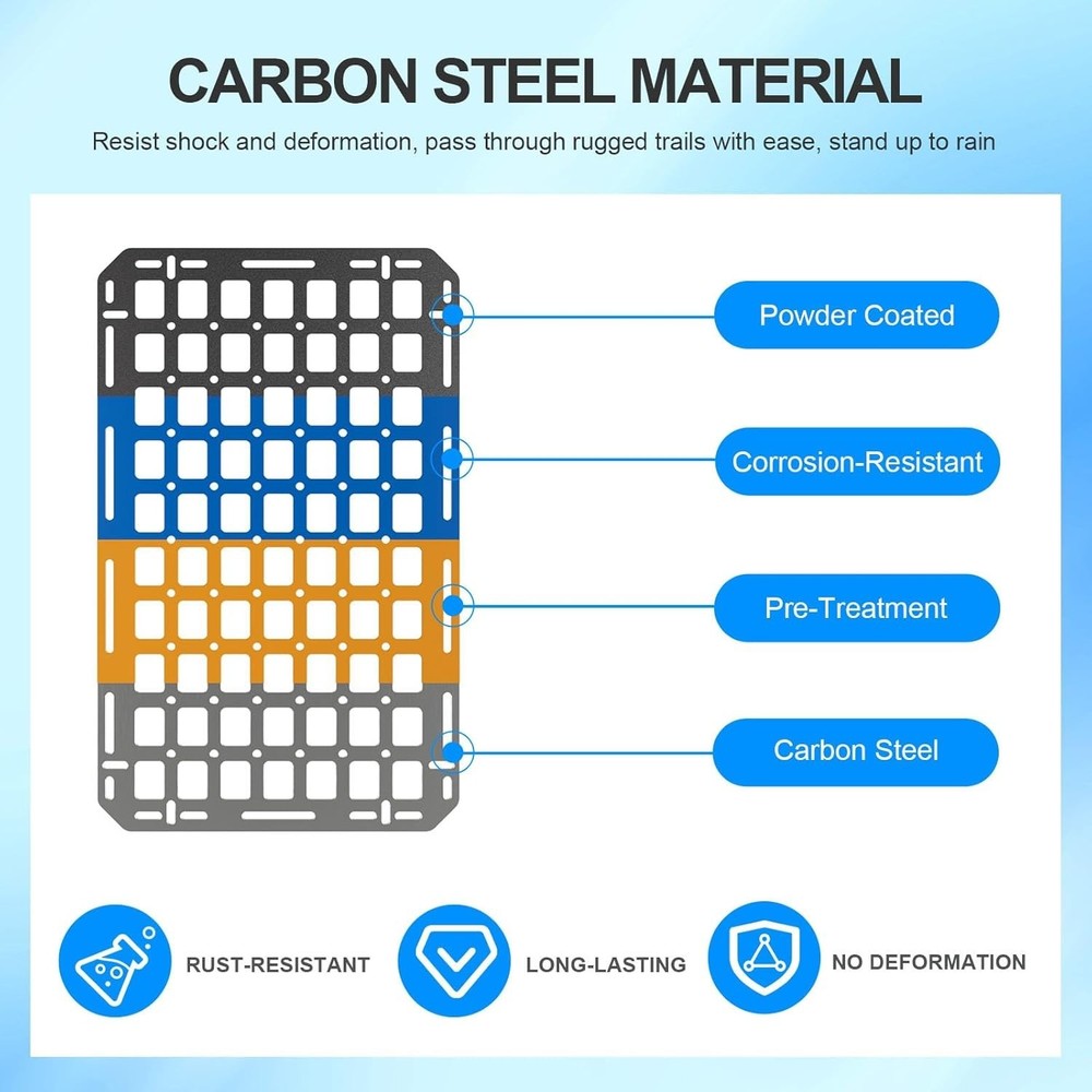Bed Width: 50 in gtin13: Does not apply Manufacturer Part Number: 20231020025 Type: Seat Back Molle Panel Brand: MENGHE Maximum Weight Capacity: 300 lb Color: Silver Country of Origin: China Attachment Type: Bolt-On UPC: Does not apply Features: Non-Slip Items Included: Mounting Hardware Placement on Vehicle: Seat Back Manufacturer Warranty: 1 Year Material: Carbon Steel