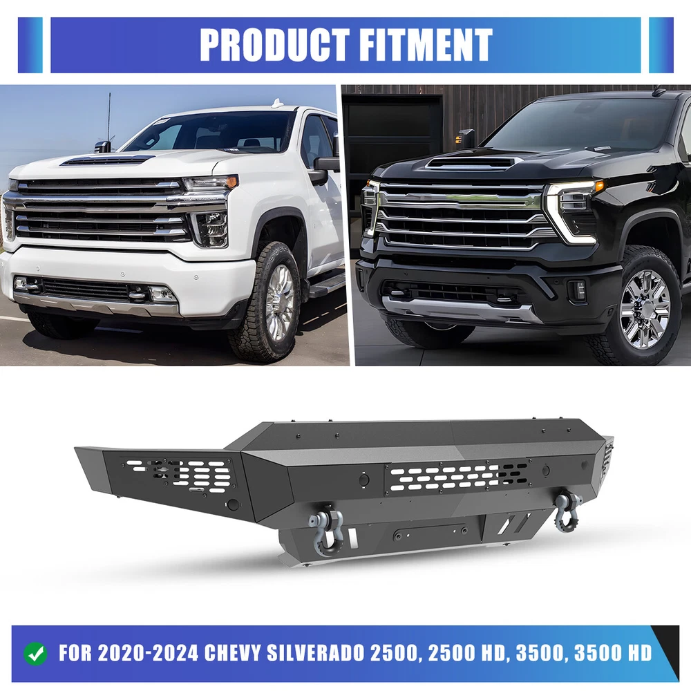 Head Lights Tail Lights Fog Lights Turn Signal Bumper Fender Flare Inner Fender Hubcaps Refrigerator Other Items for sale Head Lights Tail Lights Fog Lights Turn Signal Bumper Fender Flare Inner Fender Liners Portable Refrigerator For 2020-2024 Chevy Silverado 2500/3500/HD Front Bumper w/LED Lights+2*D-Rings Compatible with: For 2020-2024 Chevy Silverado 2500/3500/2500 HD/3500 HD Front Bumper Main Body+Side Wings Product Size : 79.83*22.29*11.89 inch Front Bumper Main Body Packaging size : 57.48*14.17*13.78 inch Packing weight :81.57 lbs Side Wings Packaging size : 33.86 inches×12.20 inches×12.20 inches Packing weight :34.17 lbs Front Bumper Package Includes 1*Front Bumper Main Body 2*Side Wings 1* Mounting Accessories Payment Shipping Return About us Contact us Payment Appreciated for the prompt payment, Contact us if bid by mistake, system open unpaid item automatically. Payment must be complete within 3 days from the date you purchase or after the end of auction. Items unpaid within 3 days of the auction end will be forfeited. We reserve the right of cancel the order and re-selling the items. Shipping All shipment will ship by UPS or USPS . All items will be ship within 1 working days , and we will ship out all orders as soon as possible after payment verified, please allow up to 1-4 business days for delivery. CANADA & International customers please note: your government might charge a duty tax (brokerage fees). We do not responsible for any custom duty or import tax. Why Choose the US Stock? 1. Us Local Shipping, No Extra Customs Cost to the US. 2. Fast Delivery: 1-4 Working days Delivery. 3. Best After-Sales Service!!! Return The buyer is responsible for all return shipping including a result of customer error or defective item. 1) If you received an incorrect, damaged, defective, or item not as described, contact us for full refund or replacement on our cost. 2) If you want to return the item, please contact us within 60 days after package received. Return products must also be in its original condition: including box, packaging and all other accessories. About us We are the best auto parts, we have been pursuing excellence, continuous exploration as the slogan, let customer satisfaction is our purpose! We adhere to the United States local delivery, one year warranty! Welcome! Contact us How Should You Contact us? Please Read The Item Description And See if The item Fits Your Vehicle Exactly. If You Found Any questions, Feel Free to email us by "Ask a question" Our Office Hours Are Monday - Friday 8:00am - 5:00pm PST / 11:00am - 8:000pm ET, We Do Not Answer Any E-Mails On Weekend, And We Will Reply All E-Mails In The Order It Was Receive. All E-Mail Take Us Around 24 Hours To Respond To Any E-Mail. We Are Close During The Weekends And We Do Not Answer Any E-Mails During That Time. On Jan 16, 2025 at 03:09:50 PST, seller added the following information: