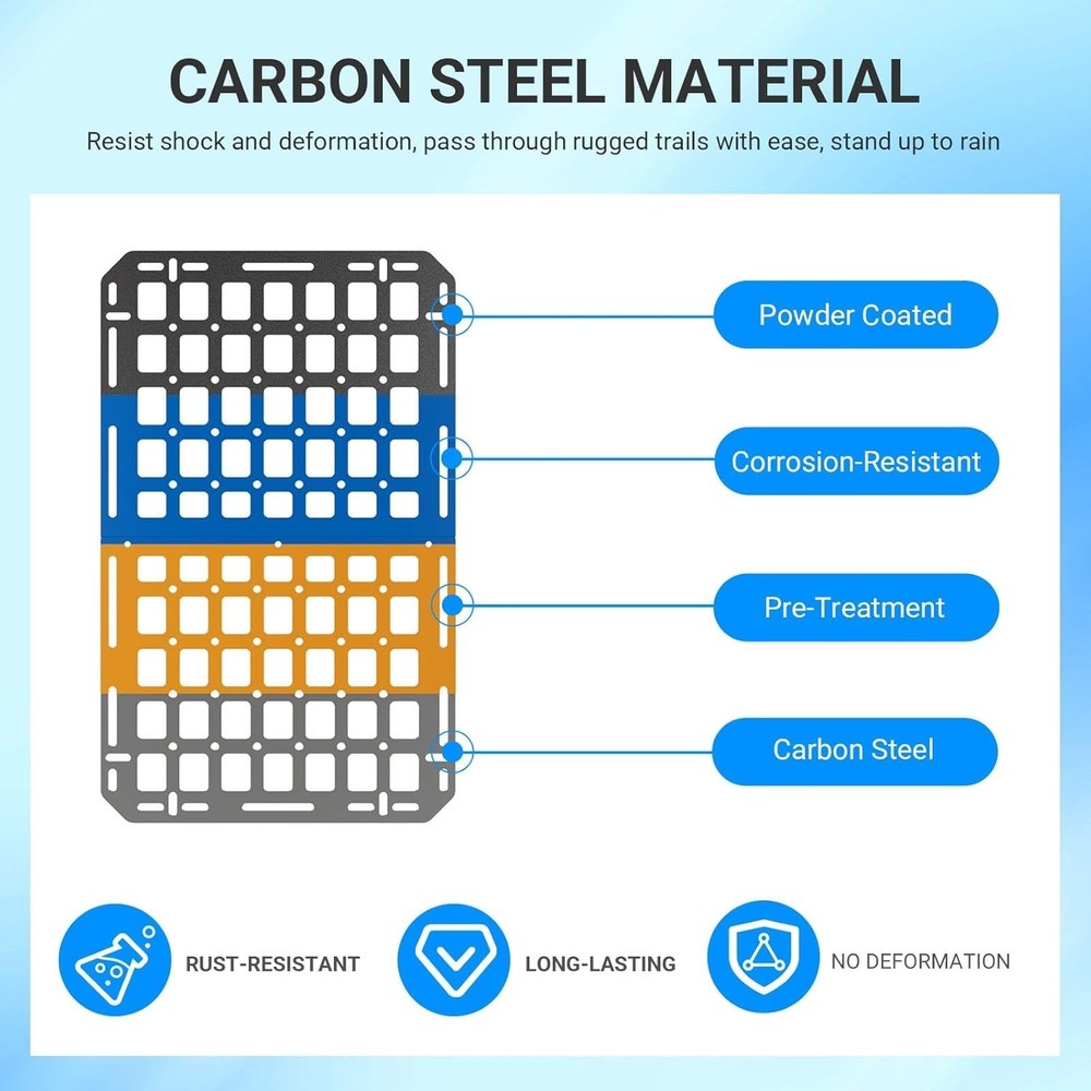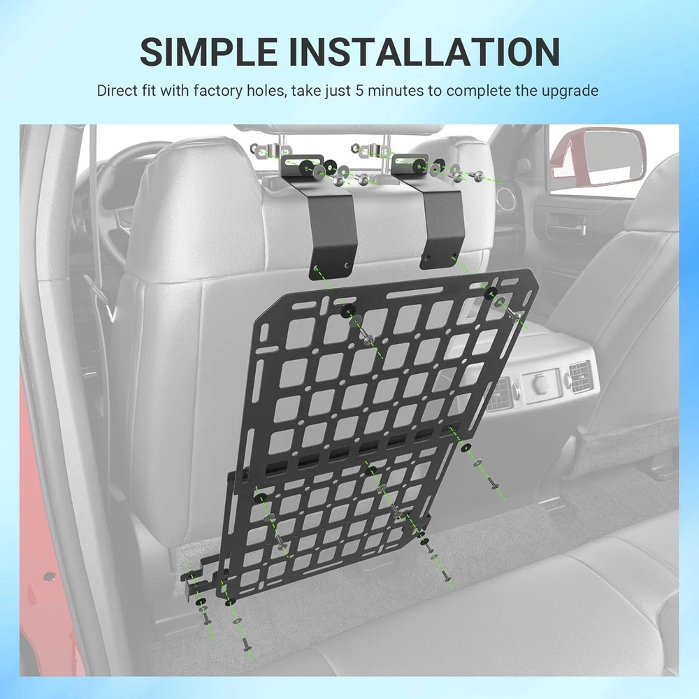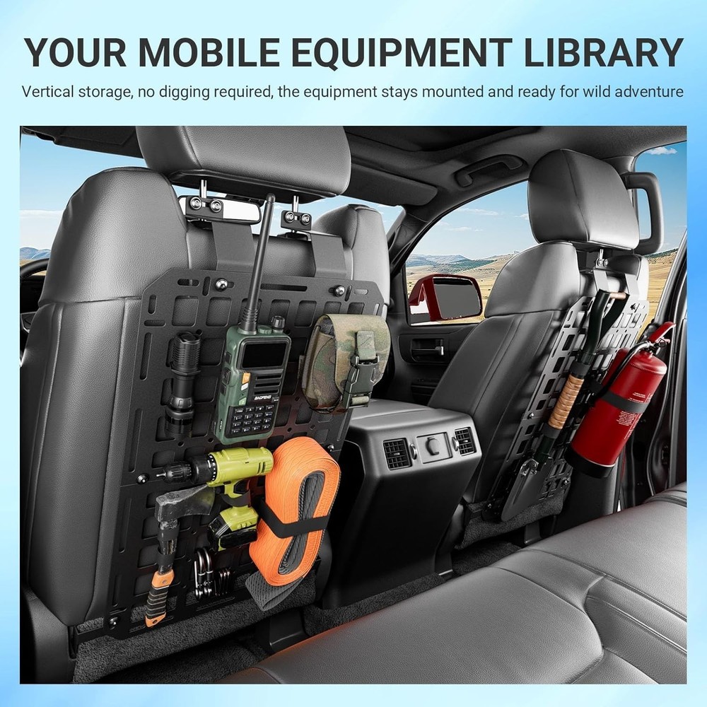 Store Categories Store Categories Other For 2022-2025 Toyota Tundra 4PCS Seat Back Molle Panel Tactical Truck Organizer Product Description 1.Fitment: The panels are perfectly compatible with 2022 2023 2024 2025 Toyota Tundra seat back molle panels. It contains 4pcs panels.A complete set for 2 seat. Rigorous testing helps compatibility with all cab configurations and original seat designs. Please confirm the model and year before purchasing. 2.Material: The bag gadget holder replacement for Toyota Tundra seat back organizer made from carbon steel with a matte black finish, the panel offers structural strength while remaining lightweight. The corrosion-resistant coating maintains appearance over time, and the slim design preserves seating space. It doesn't deform easily. 3.Functionality: The tactical gear rack replacement for Toyota Tundra molle panel enables quick access and deployment of stored items, eliminating the trouble of searching for small objects in the car. Gain instant storage for essentials like sunglasses, flashlights, multi-tools, pens, and emergency gear. The molle placed openings allow flexible attachment of pouches or accessories. It can provide more space for your car to store necessities. Keep items visible and within reach while driving, reducing clutter and improving organization. At the same time, it can also serve as an interior decoration for your car, making it look cooler. 4.Installation: Installation of molle panel compatible with Toyota Tundra tactical seat back organizer is simple. The package contains mounting accessories. There is installation reference video on our product page. The instruction in the package has a QR code for the installation video, which you can scan to watch. 5.Characteristics: The organizers replacement for 2022 2023 2024 2025 Toyota Tundra organizer molle panel are sturdy and resistant to deformation, requiring no drilling for bolt-on installation. It effectively organizes truck space. Q&A Q&A Q: How does the carbon steel construction hold up to heavy gear? A: The reinforced framework supports constant loading/unloading of items like tool rolls, first-aid kits. Its resilient build resists bending, even when molle pouches are fully loaded during off-road trips. Q: Which vehicle models is it compatible with? A: Yes! The 4pcs seat back molle panels are compatible with 2022 2023 2024 2025 Toyota Tundra. Q: How are the panels installed? Do I need to drill? A: No drilling is required. The seat panels typically use strong, heavy-duty straps with buckles that wrap around the existing seat frame and headrest posts. Copyright © 2023 Dianxiaomi
