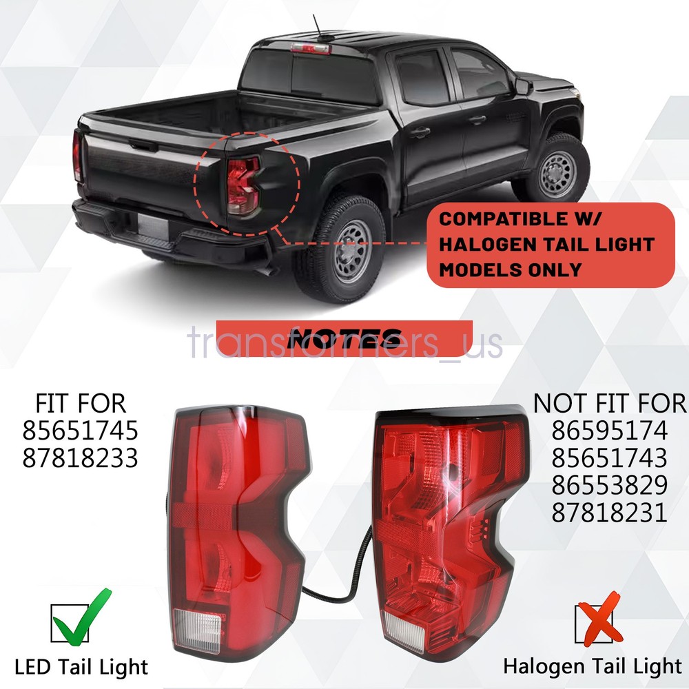 For 2023-2025 Chevy Colorado WT/ LT/ Trail Boss Halogen Tail Light W/Bulb Right Product Details: Product Type: LED Tail Light Assembly Product Condition: 100% Brand new and high quality. Lens Color : Red Clear Material: Plastic Fitment Type: Replacement Directly Fitment: For 2023 2024 2025 Chevrolet Colorado LT, Z71, ZR2 2.7L L4 - Gas (Not Compatible w/ Halogen Tail Light Models) Part Number : 85651745, 87818233 (The Compatibility Is Just For Reference. Please make sure your vehicle models is exactly same as us before purchase) Feature: -100% brand new and high quality guaranteed. -Easy to use and to operate at affordable prices. -Perfect cover that is useful, helpful and so practical. -Made of light weight & top-grade ABS Polycarbonate material. -High quality at a budget-friendly price. -Professional installation is highly recommended. -As Manufacturer,We Have Sold Millions Parts,100% Fit Your Vehicle. Package Includes: 1Pcs Right Side LED Tail Light Note: Please confirm the product is fit for your car before purchase. Because the country is different,may be different car models,product compatibility is for reference only. If you can not make sure the fitment,please send us your car model name, model year and photo of your car before purchase. Due to the different display and different light, the picture may not reflect the actual color of the item. Thanks for your understanding. No instruction included. Professional installation recommended. 5 . Please feel free to contact us if you have any questions. Thanks for browsing! General Policies : Dear customer,if you have any questions,you can contact us,we will provide the best service for you. Shipping policy : The item will be shipped within 24 hours on payment received except the holidays.(except weekends & official holidays). You can log on to eBay to check your logistics tracking number. Please confirm address before purchase, and cannot change address once purchased. If you need to receive the item quickly, please contact us, you can pay the postage to choose other logistics. Payment: Please purchase and pay for the item through the eBay,only accpected the paypal payment. Returns: Please contact us first when return, exchange and refund is required. Any direct return of purchased items will not be processed. Item must be returned in new condition, as received with all accompanied accessories and literature, including the factory carton. Shipping, handling is not refundable unless item is returned because of defect. If the product is defective or damage upon arrival,please contact us immediately,we will provide the solve the problem. Returns accepted within 30 days of delivery date and item must be in original new condition. About us: Our goal is complete customer satisfaction. We will be very honored to provide you with quality service. If there is an issue with shipping or the item you purchased please contact us via ebay message or call us before opening a case or leaving feedback.We will try our best to resolve any kind of issue. For 2023-2025 Chevy Colorado WT/ LT/ Trail Boss Halogen Tail Light W/Bulb Right Product Details: Product Type: LED Tail Light Assembly Product Condition: 100% Brand new and high quality. Lens Color : Red Clear Material: Plastic Fitment Type: Replacement Directly Fitment: For 2023 2024 2025 Chevrolet Colorado LT, Z71, ZR2 2.7L L4 - Gas (Not Compatible w/ Halogen Tail Light Models) Part Number : 85651745, 87818233 (The Compatibility Is Just For Reference. Please make sure your vehicle models is exactly same as us before purchase) Feature: -100% brand new and high quality guaranteed. -Easy to use and to operate at affordable prices. -Perfect cover that is useful, helpful and so practical. -Made of light weight & top-grade ABS Polycarbonate material. -High quality at a budget-friendly price. -Professional installation is highly recommended. -As Manufacturer,We Have Sold Millions Parts,100% Fit Your Vehicle. Package Includes: 1Pcs Right Side LED Tail Light Note: Please confirm the product is fit for your car before purchase. Because the country is different,may be different car models,product compatibility is for reference only. If you can not make sure the fitment,please send us your car model name, model year and photo of your car before purchase. Due to the different display and different light, the picture may not reflect the actual color of the item. Thanks for your understanding. No instruction included. Professional installation recommended. 5 . Please feel free to contact us if you have any questions. Thanks for browsing! General Policies : Dear customer,if you have any questions,you can contact us,we will provide the best service for you. Shipping policy : The item will be shipped within 24 hours on payment received except the holidays.(except weekends & official holidays). You can log on to eBay to check your logistics tracking number. Please confirm address before purchase, and cannot change address once purchased. If you need to receive the item quickly, please contact us, you can pay the postage to choose other logistics. Payment: Please purchase and pay for the item through the eBay,only accpected the paypal payment. Returns: Please contact us first when return, exchange and refund is required. Any direct return of purchased items will not be processed. Item must be returned in new condition, as received with all accompanied accessories and literature, including the factory carton. Shipping, handling is not refundable unless item is returned because of defect. If the product is defective or damage upon arrival,please contact us immediately,we will provide the solve the problem. Returns accepted within 30 days of delivery date and item must be in original new condition. About us: Our goal is complete customer satisfaction. We will be very honored to provide you with quality service. If there is an issue with shipping or the item you purchased please contact us via ebay message or call us before op