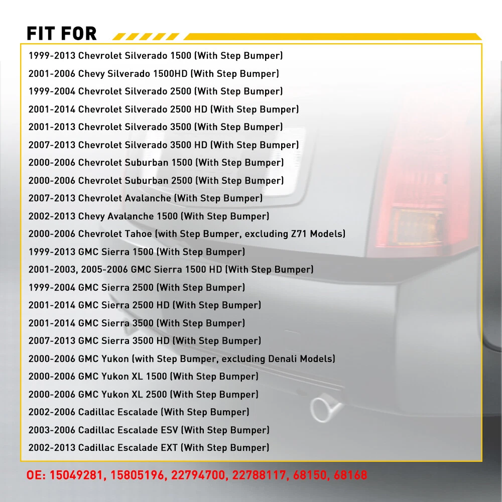 Fit for: for 1999-2013 Chevrolet Silverado 1500 (With Step Bumper) for 2001-2006 Chevy Silverado 1500HD (With Step Bumper) for 1999-2004 Chevrolet Silverado 2500 (With Step Bumper) for 2001-2014 Chevrolet Silverado 2500 HD (With Step Bumper) for 2001-2013 Chevrolet Silverado 3500 (With Step Bumper) for 2007-2013 Chevrolet Silverado 3500 HD (With Step Bumper) for 2000-2006 Chevrolet Suburban 1500 (With Step Bumper) for 2000-2006 Chevrolet Suburban 2500 (With Step Bumper) for 2007-2013 Chevrolet Avalanche (With Step Bumper) for 2002-2013 Chevy Avalanche 1500 (With Step Bumper) for 2000-2006 Chevrolet Tahoe (with Step Bumper, excluding Z71 Models) For 99-13 Cadillac GMC Replacement Chevy White Tube Red LED License Plate Lights Fit for: for 1999-2013 Chevrolet Silverado 1500 (With Step Bumper) for 2001-2006 Chevy Silverado 1500HD (With Step Bumper) for 1999-2004 Chevrolet Silverado 2500 (With Step Bumper) for 2001-2014 Chevrolet Silverado 2500 HD (With Step Bumper) for 2001-2013 Chevrolet Silverado 3500 (With Step Bumper) for 2007-2013 Chevrolet Silverado 3500 HD (With Step Bumper) for 2000-2006 Chevrolet Suburban 1500 (With Step Bumper) for 2000-2006 Chevrolet Suburban 2500 (With Step Bumper) for 2007-2013 Chevrolet Avalanche (With Step Bumper) for 2002-2013 Chevy Avalanche 1500 (With Step Bumper) for 2000-2006 Chevrolet Tahoe (with Step Bumper, excluding Z71 Models) for 1999-2013 GMC Sierra 1500 (With Step Bumper) for 2001-2003, 2005-2006 GMC Sierra 1500 HD (With Step Bumper) for 1999-2004 GMC Sierra 2500 (With Step Bumper) for 2001-2014 GMC Sierra 2500 HD (With Step Bumper) for 2001-2014 GMC Sierra 3500 (With Step Bumper) for 2007-2013 GMC Sierra 3500 HD (With Step Bumper) for 2000-2006 GMC Yukon (with Step Bumper, excluding Denali Models) for 2000-2006 GMC Yukon XL 1500 (With Step Bumper) for 2000-2006 GMC Yukon XL 2500 (With Step Bumper) for 2002-2006 Cadillac Escalade (With Step Bumper) for 2003-2006 Cadillac Escalade ESV (With Step Bumper) for 2002-2013 Cadillac Escalade EXT (With Step Bumper) Please confirm the car model before purchasing! Specifications: OE number: 15049281, 15805196, 22794700, 22788117, 68150, 68168 Color temperature: 6000k Service life: 50,000h+ Waterproof: IP67 Features: *High brightness Our license plate lights with high brightness will enhance safety and give your car a modern and luxurious appearance. *Direct replacement Direct replacement from stock application. No modification needed *Long service life Lower energy consumption with a long service life (more than 50,000 hours). *Pefect fit Manufacture according to originals for a perfect match with your car. *100% Brand new Packaging include: License Plate Light *2 Item Specifics Manufacturer Part Number AUXITO License Plate Light Lens Color Clear Placement on Vehicle Rear Brand AUXITO Fitment Type Direct Replacement Bulbs Included Yes Type LED License Plate Light Interchange Part Number 52016718, 15805196, 22794700, 15049280, 22794700, 15805196 15764374, 12335772, 15082619, 15049281, 22788117, BDY2336 DOR68168, 735-7674, 68168 Feature LED License Plate Light Lighting Technology LED Manufacturer Warranty 2 Years Housing Color Black Light Color White&Red Items Included 2PCS License Plate Light Features DOT-Certified SAE-Certified Color Temperature 6500K Wattage 3 W OE/OEM Part Number 15049281 15805196 22794700 22788117 68150 68168 Superseded Part Number 2013 2012 2011 2010 2009 2008 2007 2006 2005 2004 2003 2002 2001 2000 Chevrolet Chevy Tahoe GMC Sierra 1500 2500 HD 3500 Classic Cadillac Escalade Yukon XL Suburban Silverado EXT Sport Utility Crew Cab Pickup Standard Cab Pickup Extended Cab Pickup Cab & Chassis Base Luxury Premium LT LTZ WT LS Hybrid XFE SS Z71 SLE SLT Rear Bumper Tag Tail Lamp Assembly Replacement Light Bulb Kit Suitable For License Plate Light Bulb Fitment Code C5W Number of Bulbs 2 Feature 1 Waterproof design for exterior use Feature 2 Plug and Play,Easy installation, DIY possible Feature 3 No damage to the original housing Feature 4 Error free LED lights,producing super bright light Feature 5 18 High power SMD LEDs per light bulb, bright Model LED License Plate Light Assembly Model LED License Plate Light Assembly Payment Returns DESCRIPTION PAYMENT SHIPPING RETURN POLICY CONTACT US Shop Category Store Home LED Headlight ◈ H4 ◈ H13 LED FogLight ◈ H10 / 9145 / 9140 LED Reverse Light ◈ T15/921/W16W LED Side Marker Light Car Parts & Accessories Tail Light assemblies Other Hot Item Picture New List Item Pair Gray Rear Glass Latch Window Lock Left Right For Toyota Tundra 2000-2006 USD 27.29 Fit For 2019-2021 Toyota Front Corolla Fender Corner Molding Left & Right USD 17.29 Fits Jeep 1987-1995 Wrangler Amber YJ Lens Front Turn Signal Parking Light Lamps USD 19.99 9008 H13 LED Headlight Bulbs HiLo Canbus Bright Super for Ford F150 04-2014 F250 USD 26.59 2X Front Turn Signal Light Bulb 3157 T25 Socket Harness Wire 12V Car Accessories USD 11.99 Help & Info Payment Policy Shipping Policy Return Policy FAQ About Us For 99-13 Cadillac GMC Replacement Chevy White Tube Red LED License Plate Lights Fit for: for 1999-2013 Chevrolet Silverado 1500 (With Step Bumper) for 2001-2006 Chevy Silverado 1500HD (With Step Bumper) for 1999-2004 Chevrolet Silverado 2500 (With Step Bumper) for 2001-2014 Chevrolet Silverado 2500 HD (With Step Bumper) for 2001-2013 Chevrolet Silverado 3500 (With Step Bumper) for 2007-2013 Chevrolet Silverado 3500 HD (With Step Bumper) for 2000-2006 Chevrolet Suburban 1500 (With Step Bumper) for 2000-2006 Chevrolet Suburban 2500 (With Step Bumper) for 2007-2013 Chevrolet Avalanche (With Step Bumper) for 2002-2013 Chevy Avalanche 1500 (With Step Bumper) for 2000-2006 Chevrolet Tahoe (with Step Bumper, excluding Z71 Models) for 1999-2013 GMC Sierra 1500 (With Step Bumper) for 2001-2003, 2005-2006 GMC Sierra 1500 HD (With Step Bumper) for 1999-2004 GMC Sierra 2500 (With Step Bumper) for 2001-2014 GMC Sierra 2500 HD (With Step Bumper) for 2001-2014 GMC Sierra 3500 (With Step Bumper) 