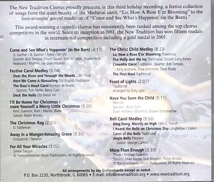 Buy more - save more 10% off 2, 20% off 3, 30% off 4 or more on all items. Buy more - save more 10% off 2, 20% off 3, 30% off 4 or more on all items. Click Here to add ChainMan Books and Music your Favorite Seller's List Title/Songwriter Time 1 Come and See What's Happenin' (in the Barn) 4:17 2 Festive Carol Medley 5:04 3 I'll Be Home for Christmas / Have Yourself a Merry Little Christmas 5:00 4 The Christmas Rag 2:30 5 Away in a Manger / Amazing Grace 3:30 6 For All Your Miracles 3:02 7 The Christ Chils Medley 8:23 8 Feast of Lights 2:07 9 Have You Seen the Child 5:11 10 Bell Carol Medley 5:53 11 More Than Enough 3:33 To Top Copyright © ChainMan Books and Music 2014 - 2023 Powered by SixBit's eCommerce Solution