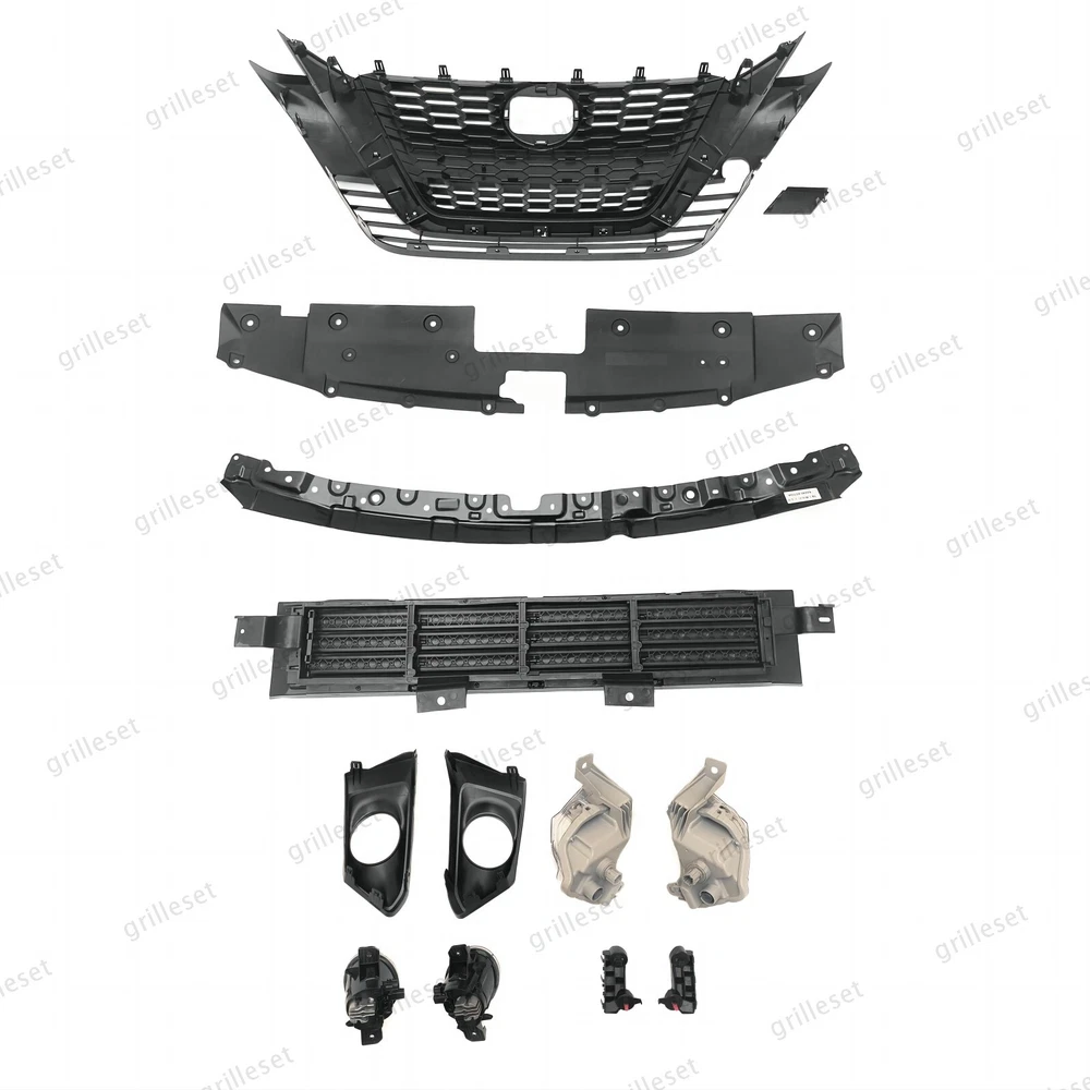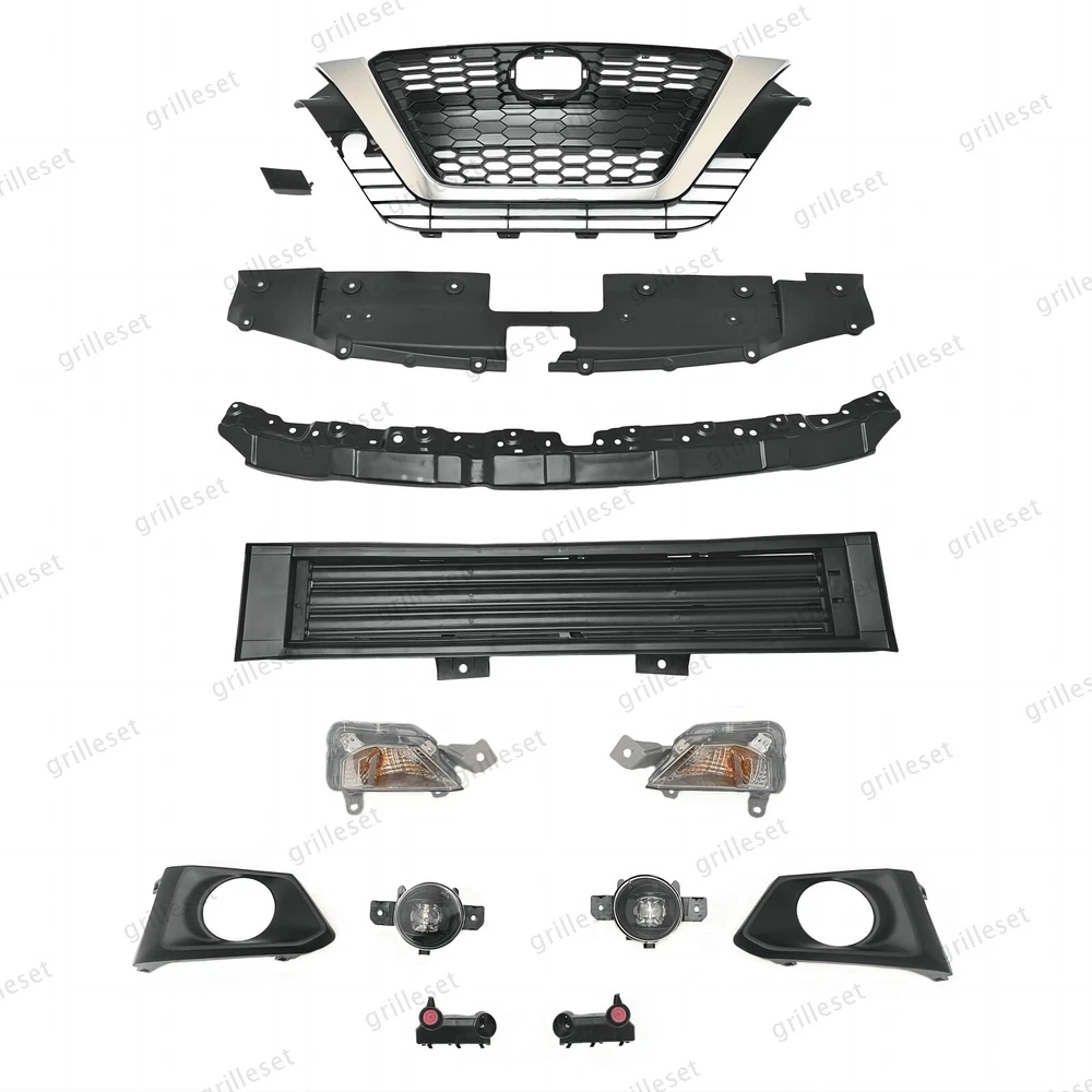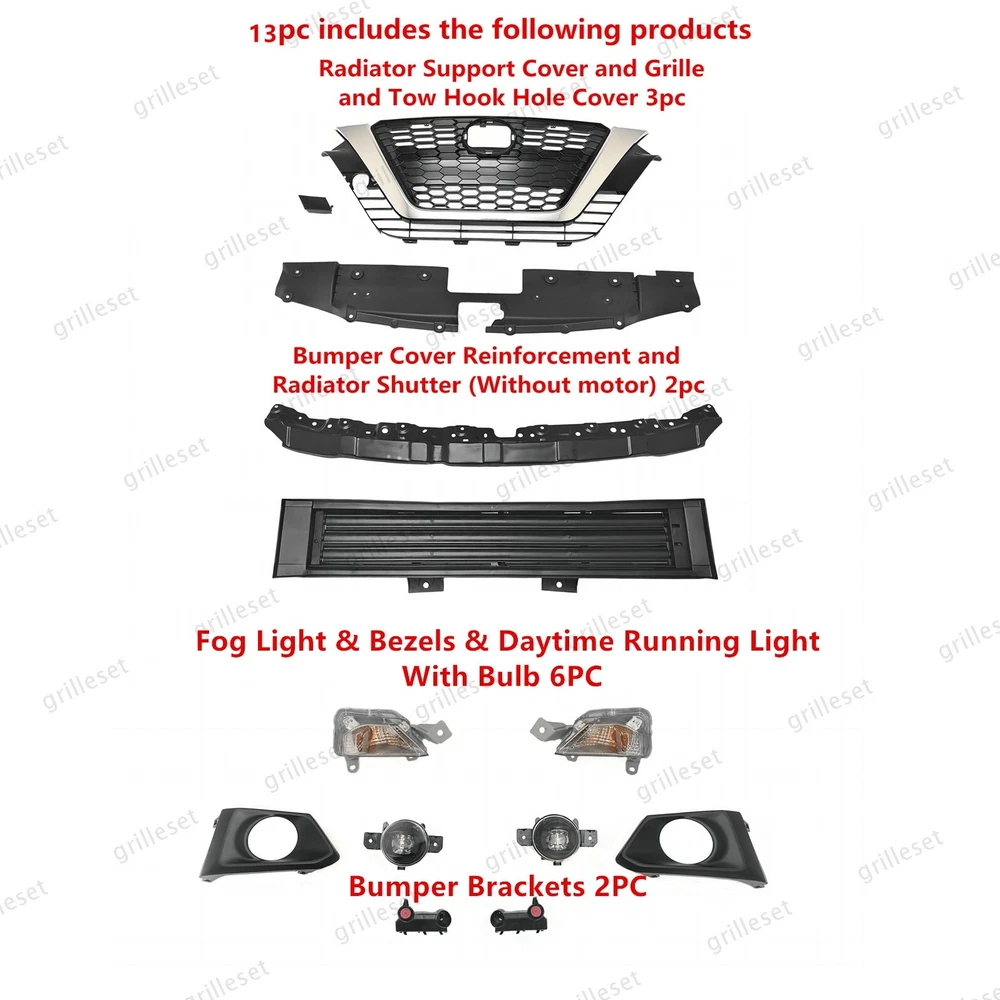 Fit for : 1 Set (13 PCS) Includes:(See more pictures for details) 1 Pc front upper black grille with chrome trim 1 Pc front tow hook hole cover 1 Pc front radiator upper support cover 1 Pc front bumper cover reinforcement 1 Pc front lower grille radiator shutter assembly without motor 2 Pcs front daytime running light with bulb 2 Pcs fog lights with bulb,switch,relay and harness 2 Pcs fog light bezels 2 Pcs front bumper brackets Item OE number : 62310-6CG1A;622A0-6CA0B;62078-6CA1B;62240-6CA0A;62330-6CA0C;26135-6CA0A;26130-6CA0A;62257-6CA0B;62256-6CA0B;26155-6CA0B;26150-6CA0B;62221-6CA0A;62220-6CA0A Installation : Perfect fit direct replacement, no modifications required. Installation manual not provided; we recommend professional installation. Item's-Features : Superior quality kit 100% brand new Made from high-quality materials Excellent replacement part, no modifications needed Other parts fit for