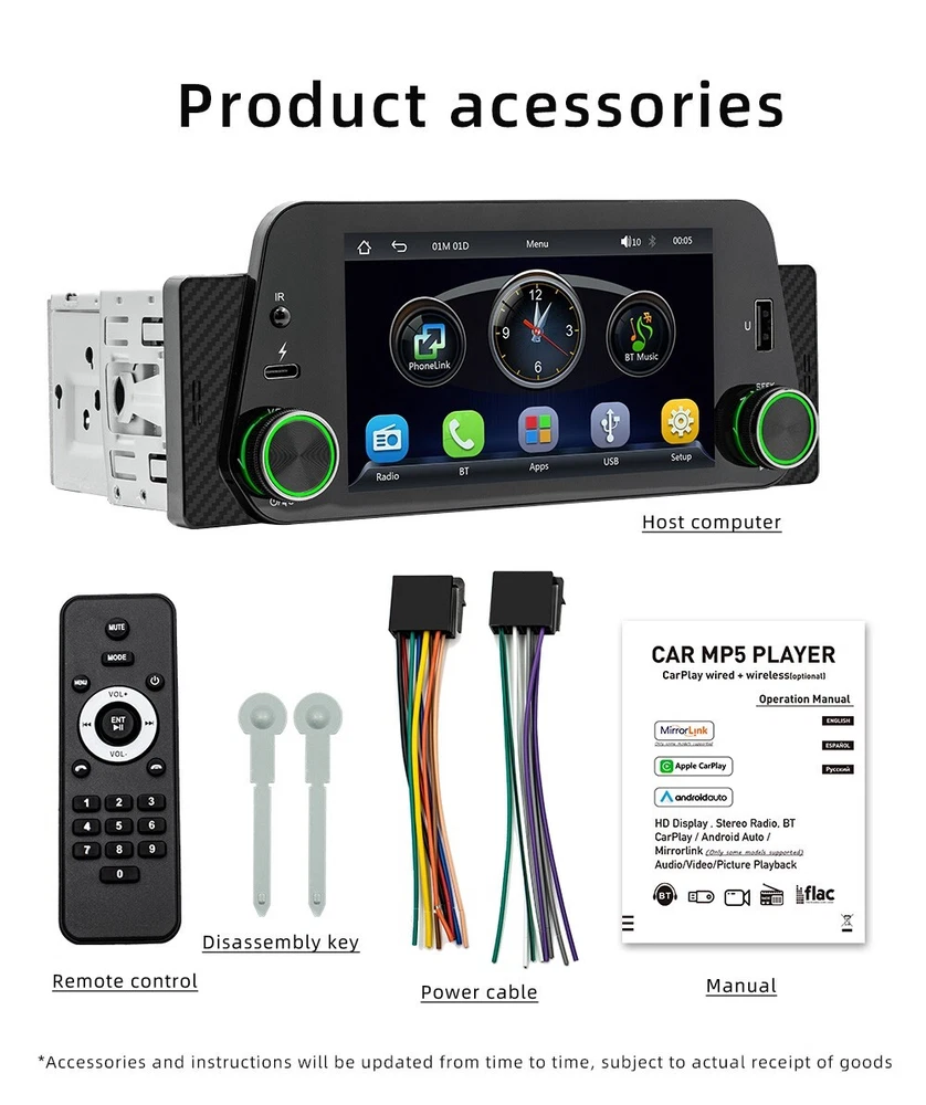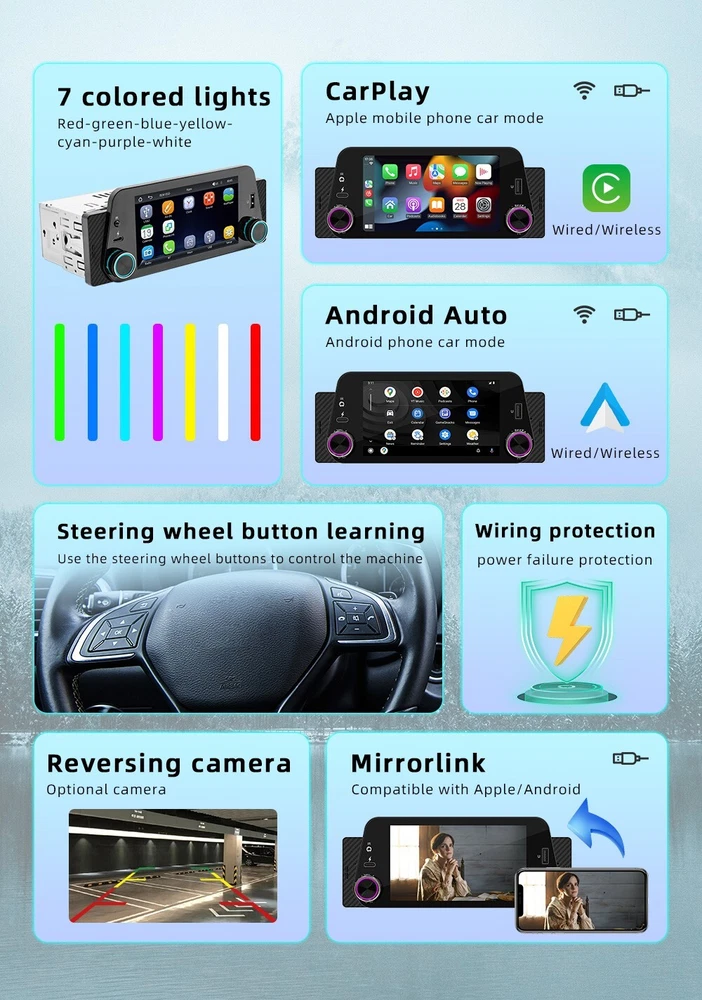 Home Payment Shipping About us Contact us Store Categories Store Categories Other Details Car Radio 1 Din Wireless CarPlay Android Auto Car Stereo 5in Radio Multimedia MP5 Player Bluetooth Handsfree Mirror Link FM Note:Please check size with your car Product selling points: ♦ The wiring protection function directly reduces the customer complaint refund loss by at least 20% for cross-border customers (customers install wiring themselves, and if the positive and negative poles cannot be clearly distinguished, it will normally directly burn out the machine motherboard or fuse, leading to customer complaints of returns or negative reviews. Our latest research and development of this product's power cord can be easily connected N times without burning the machine and fuse until the customer connects it correctly); ♦ High definition reverse video input (camera optional), automatically switches to full screen reverse image when the vehicle is in reverse gear, intelligent assistance for safe reverse; ♦ Mobile car mode, connected to CarPlay or Android Auto, allows your machine to use various functions of the phone; Basic parameters Type: single din System:wide Melis system Software solution: F133 Bluetooth chip: AB5301B Power amplifier chip: CD7388CZ Radio IC: QN8035 Output power: 60Wx4 Working voltage: 10-14.8V Working temperature: -20~60 ℃ Bluetooth version: 5.0 (default name: SWL-BT) CPU: F133 Running memory: 1Gbit DRAM Display resolution: 1280x720 Screen size: 5.0 inches Installation size: 178x50MM Shell size: 188x75MM) Host depth :80MM Functional parameters Mobile internet: support Reverse image: support Video playback warning: support Driving recorder :support (optional recorder) USB interface: USB 2.0 read x2 Audio output: 2 channels (left channel+right channel) Video output: 2 channels External microphone input: support (optional external microphone configuration) Video input: 1 channel Reverse video input :1 channel Language parameters:English, Chinese, Spanish, Portuguese, Russian, German, French, Polish, Türkiye, Arabic, Hebrew, Italian, Czech, Japanese, Korean, Thai Factory Set Password: 113266 Accessories 1. Host 2. Instructions 3. Power cord 4.21 key silicone remote control (accessories, instructions, and packaging may be updated from time to time, subject to actual receipt) Basic functions 1. FM radio 2. Read USB flash drive (audio/video/images) 3. Bluetooth function 4. RCA audio output can be connected to a subwoofer 5. Reverse rearview function 6. Video input and output functions 7. Original car steering wheel learning function 8. Wired mobile phone interconnection wired and wireless Android AUTO/Apple CarPlay 9. Colorful lighting 10. Rear USB 11. Power supply positive and negative pole reverse connection protection function, the wrong connection of the positive and negative poles of the power line will not cause circuit board burning 12. TYPE-C interface charging function Shipping Policy Payment Method Returns Policy Shipping Policy Payment Method Returns Policy Home Payment Shipping About us Contact us Home Payment Shipping About us Contact us Store Categories Store Categories Details Car Radio 1 Din Wireless CarPlay Android Auto Car Stereo 5in Radio Multimedia MP5 Player Bluetooth Handsfree Mirror Link FM Note:Please check size with your car Product selling points: ♦ The wiring protection function directly reduces the customer complaint refund loss by at least 20% for cross-border customers (customers install wiring themselves, and if the positive and negative poles cannot be clearly distinguished, it will normally directly burn out the machine motherboard or fuse, leading to customer complaints of returns or negative reviews. Our latest research and development of this product's power cord can be easily connected N times without burning the machine and fuse until the customer connects it correctly); ♦ High definition reverse video input (camera optional), automatically switches to full screen reverse image when the vehicle is in reverse gear, intelligent assistance for safe reverse; ♦ Mobile car mode, connected to CarPlay or Android Auto, allows your machine to use various functions of the phone; Basic parameters Type: single din System:wide Melis system Software solution: F133 Bluetooth chip: AB5301B Power amplifier chip: CD7388CZ Radio IC: QN8035 Output power: 60Wx4 Working voltage: 10-14.8V Working temperature: -20~60 ℃ Bluetooth version: 5.0 (default name: SWL-BT) CPU: F133 Running memory: 1Gbit DRAM Display resolution: 1280x720 Screen size: 5.0 inches Installation size: 178x50MM Shell size: 188x75MM) Host depth :80MM Functional parameters Mobile internet: support Reverse image: support Video playback warning: support Driving recorder :support (optional recorder) USB interface: USB 2.0 read x2 Audio output: 2 channels (left channel+right channel) Video output: 2 channels External microphone input: support (optional external microphone configuration) Video input: 1 channel Reverse video input :1 channel Language parameters:English, Chinese, Spanish, Portuguese, Russian, German, French, Polish, Türkiye, Arabic, Hebrew, Italian, Czech, Japanese, Korean, Thai Factory Set Password: 113266 Accessories 1. Host 2. Instructions 3. Power cord 4.21 key silicone remote control (accessories, instructions, and packaging may be updated from time to time, subject to actual receipt) Basic functions 1. FM radio 2. Read USB flash drive (audio/video/images) 3. Bluetooth function 4. RCA audio output can be connected to a subwoofer 5. Reverse rearview function 6. Video input and output functions 7. Original car steering wheel learning function 8. Wired mobile phone interconnection wired and wireless Android AUTO/Apple CarPlay 9. Colorful lighting 10. Rear USB 11. Power supply positive and negative pole reverse connection protection function, the wrong connection of the positive and negative poles of the power line will not cause circuit board burning 12. TYPE-C interface char