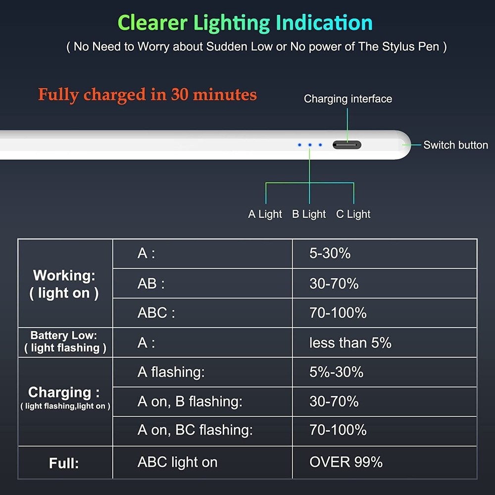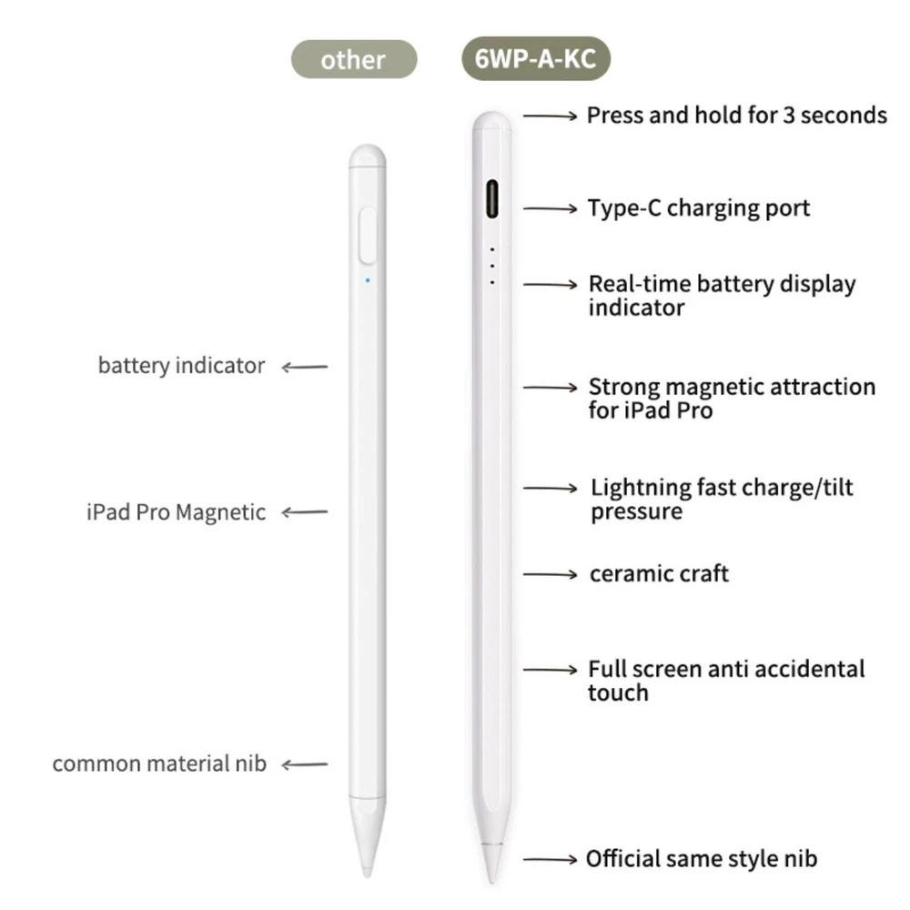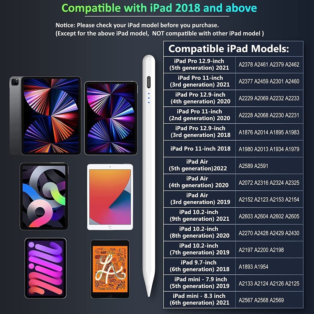 EVERYDAYOUTLETS iPad Stylus Pen This pen for ipad is compatible with iPad 2018 releases and later. The new Generation Stylus aims to improve your writing experience. The redesigned apple pencil has longer battery life, with up to 10 hours of continuous use on 30 minutes charge. Not work with: iPad 2010(1st gen) A1219 / A1337 iPad 2011(2nd gen)A1395 / A1396 / A1397 iPad 2012(3th gen&4th gen) A1416/ A1430 / A1403 / A1458 / A1459 / A1460 iPad 2017(5th gen)A1822 / A1823 iPad Pro(9.7 inch)A1673 / A1674 / A1675 iPad Pro(10.5 inch)A1701 / A1709 / A1852 iPad Pro 12.9 inch(1st gen&2nd gen)A1584 / A1652 / A1670 / A1671 / A1821 iPad Air(1st gen & 2nd gen)A1474 / A1475 / A1476 / A1566/ A1567 iPad mini(1st/2nd/3th/4th gen) A1432 /A1454 / A1455 / A1489 / A1490 / A1491 / A1599 / A1600 / A1538 / A1550 Power Display & Type-C Charging 3 LED indicators can clearly see the power, timely charge, and avoid automatic shutdown due to lack of power during use. USB charging port and built-in battery, 10Hours Working Time, 30minutes Charging Time, 10 Minutes Auto Sleep, and 180days Long Standby Time. Noted: 1.The IOS system must be updated to iOs 12.2 or above. 2.Please confirm the models is 2018-2022 iPad or iPad Pro. 3.Cannot be used for switching apps. 4.Better not use stylus pencil while ipad is charging, which may cause break & disconnect issues. 5.It has better using experience on the ipad with the tempered glass screen protector. 6.There is NO press sensitivity. 7. If the apple pencil 2nd generation can’t work, please reset your iPad or iPad Pro as follows: Settings--->Apple Pencil--->Turn off the Apple pencil. Settings---> Notes--->Turn off "Only Draw with Apple Pencil". Easy to use Just double tap the top of the active stylus pencil for turning ON/OFF. Stylus Pen for iPad will automatically turn in "Sleep Mode" after idle for 10 minutes to save power. No bluetooth needed. Perfect Precision & Hi ghly Responsive EVERYDAYOUTLETS iP ad pencil is made of Aluminum, it uses a 1.5mm wear-resistant nib and high-performance chip, free writing, draw continuous lines, there is no lagging, no offset ,no breaking lines and no scratches. Each stylus pencil for iPad comes with 3 replacement tips. Tilt Function The Stylus pen 2nd Gen is designed to work like a regular pencil, the thickness of the line can be changed according to the stylus different angles. The latest tilt-sensing technology makes freedom for writing and drawing. Palm Rejection The upgraded pencil for iPad with palm rejection technology, thus don't need to wear anti-friction glove or hands away from the screen. Providing a natural writing feeling as writing on paper without delay. Magnetic Adsorption The ipad pen attaches magnetically to the side of your iPad, it is easy to place, it can prevent rolling and lost when you don't use it. Complete Accessories 1 x Stylus Pen 2 x Screw-Type Nib 1 x Type-C Charging Cable 1 x User Manual
