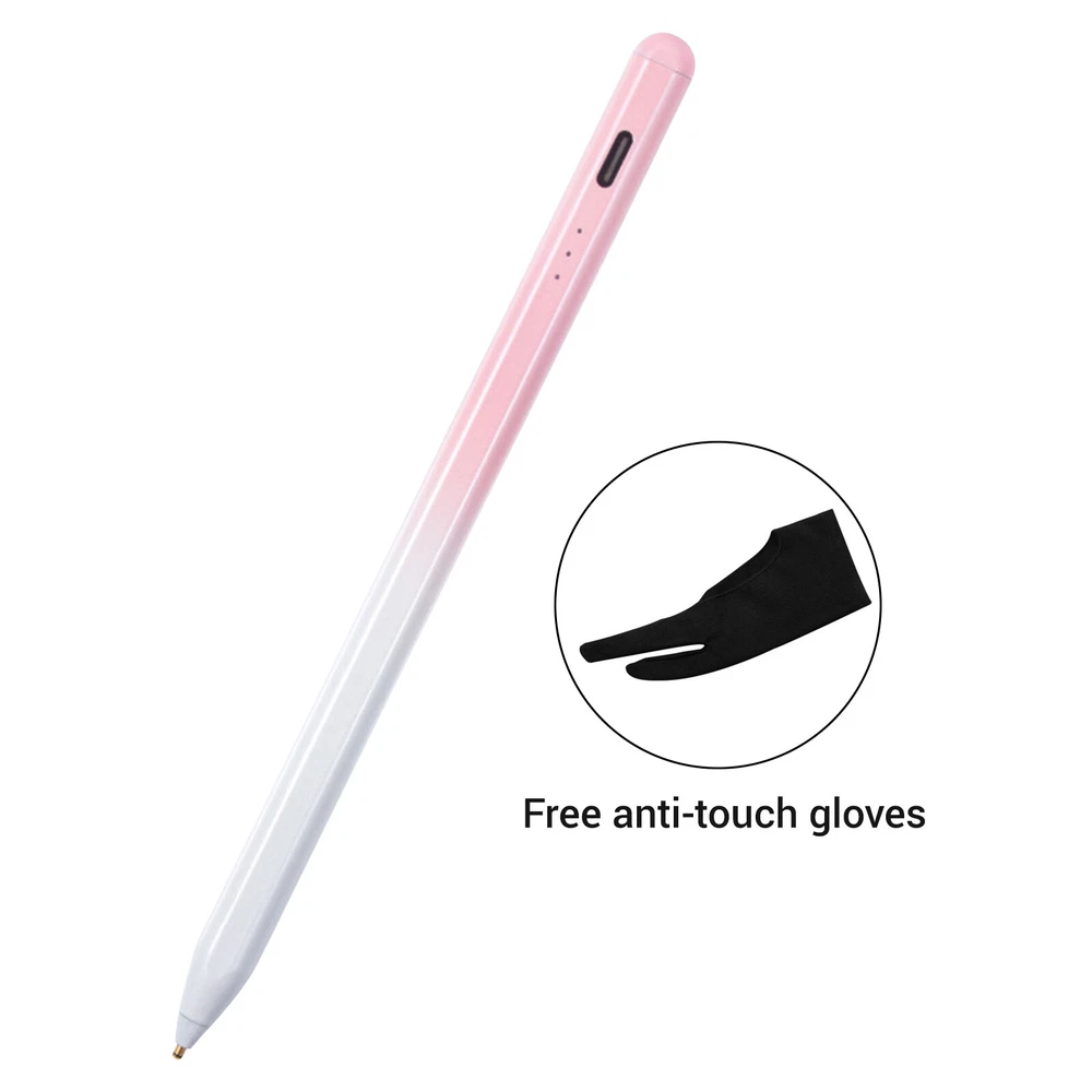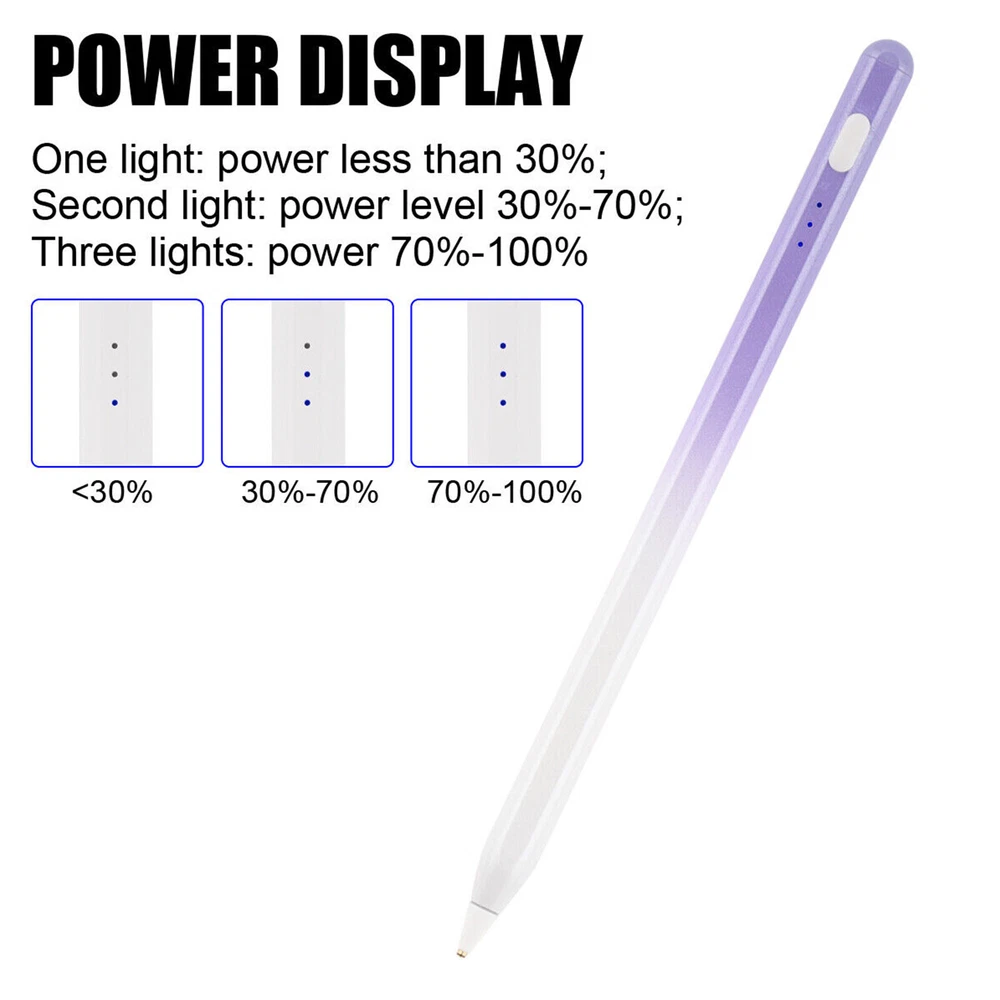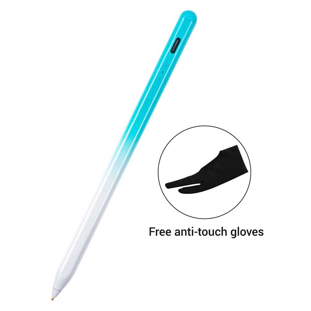 Product Description For Apple Stylus Pencil iPad 10/9/8/7/6th Gen Air 5/4/3 iPad Pro 2018-2024 Pen Features: - Colorful Gradient Design: Features the latest trendy gradient color design, with multiple colors available to satisfy personalized preferences. - High Compatibility: Compatible with a variety of capacitive screen devices, including Android phones, tablets, iPhones, and iPads, eliminating concerns about device mismatch. - Quality Material: Made with a full alloy shell, durable and comfortable to use, enhancing the user experience. - Magnetic Adsorption Design: Supports magnetic adsorption for convenient storage and to avoid loss, practical and convenient. - Suitable for All Users: Whether you're a professional artist, a student, or someone who enjoys browsing, this stylus pen can improve your digital experience. Specification: Material: Alloy Pen length: 165mm Diameter: 9mm Applicable equipment: universal for various capacitive screens Anti touch function: None Battery capacity: 130 mA Battery life: 10 hours Charging: 5V 200mA (Do not use the fast charging head!!) Indicator lights display battery level: Three indicator lights can display the remaining battery level of the stylus. Three lights on indicate that the battery is between 70% -100%, two lights on indicate that the battery is between 30% -70%, and one light on indicates that the battery is less than 30% remaining. It is time to charge Packaging list: 1 x Pen 1 x USB charging cable 1 x Instructions 1 x Anti-touch glove powered by