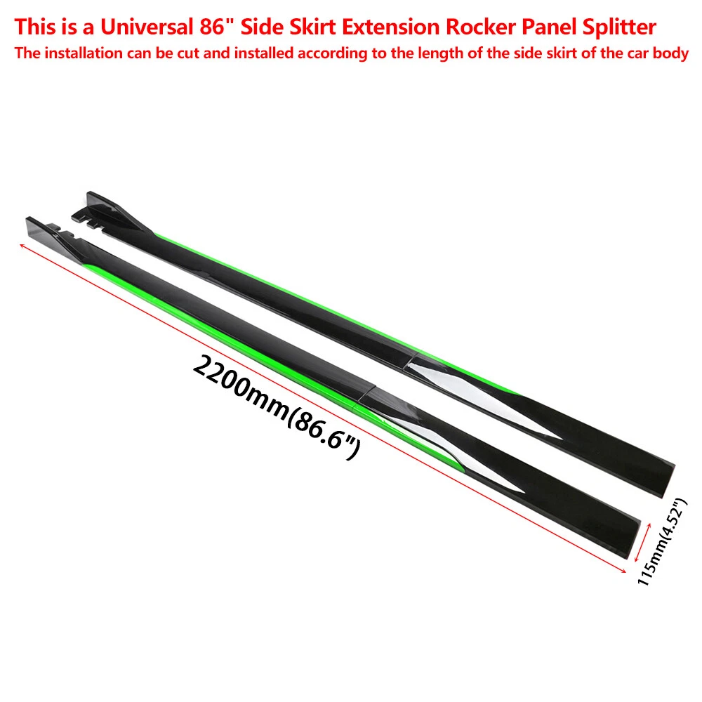 UPC: Does not apply Type: 86 inches UNIVERSAL Side Skirt Extension Rocker Panel Splitter Performance Part: Yes Material: High Quality ABS Attachment Method: Screws Fitment Type: Direct Replacement Interchange Part Number: Does Not Apply Placement on Vehicle: Left, Right Manufacturer Part Number: Does Not Apply Mounting Hardware Included: Yes Brand: Unbranded Number of Pieces: 2 Features: Can be cut according to the length of the side skirt of the car gtin13: Does not apply Surface Finish: Painted Color: Black + Green
