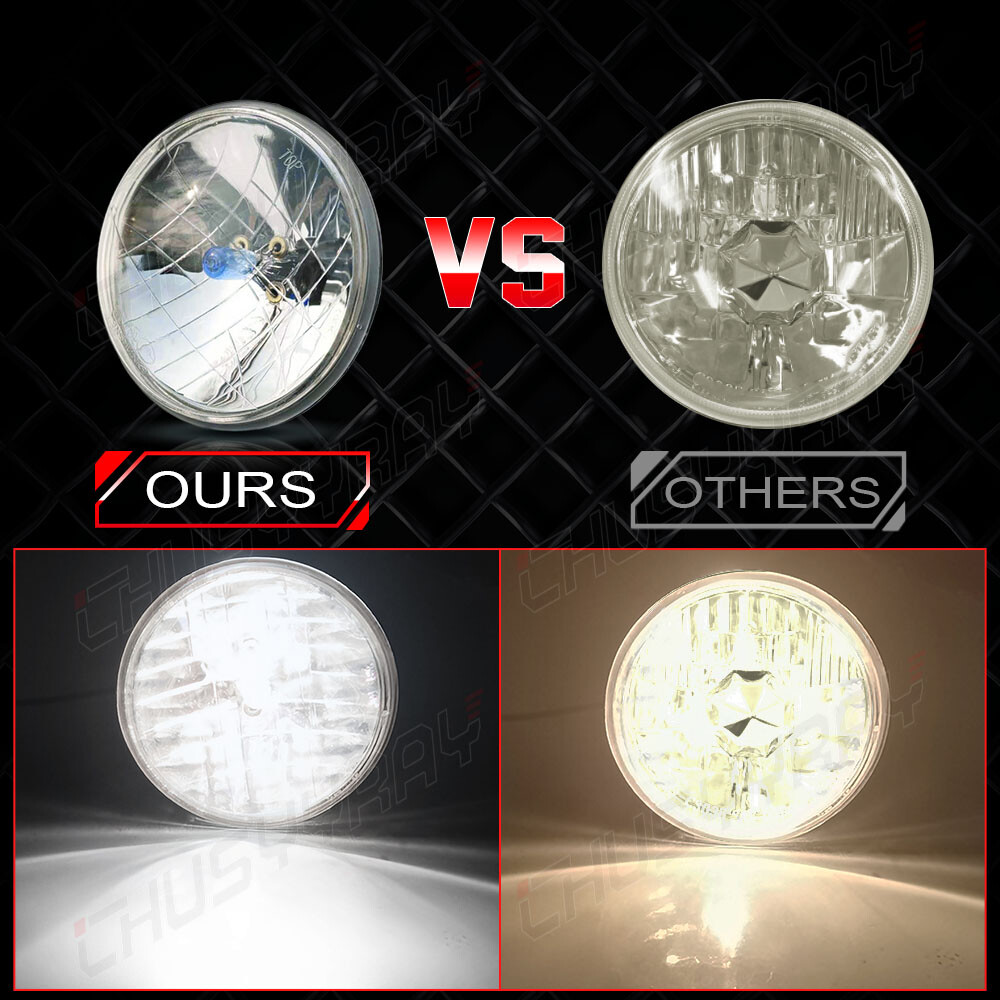 THESE ARE HALOGEN SEMI-SEALED BEAM STOCK STYLE GLASS FACED HEADLIGHTS WITH METAL BACKSIDES! REPLACEABLE SUPER WHITE 100/130 W HALOGEN H4 BULBS INCLUDED! Stock Style H4 Replacement Upgrade Headlights Pair - High Beam Headlight Pair 100/130W Dual Beam Super White Halogen Bulbs Glass Lens / Metal Backside DOT SAE Approved This listing is for 4 pcs new 5-3/4" stock style glass faced halogen H4 conversion headlight bulbs. These halogen semi-sealed beam headlights look almost the same as the original headlights your vehicle came with when it was new, except these light up 200% brighter then the stock style incandescent bulbs and take a replaceable 100/130W super white H4 bulbs. These have the original shaped prongs on the back so they will plug right into your original wiring harness plugs. These have the correct locating tabs on the backside to clock properly into the high beam headlight buckets. These are correct for any car or truck that has 4 round glass headlights. Each bulb is 5 3/4 inches in diameter. DOT SAE approved. Notes: 1. 100% Brand New in the box with manufacturer packaging, never been installed before. 2. Factory bolt-on OE fitment, no vehicle modifications are required; or replacement for the stock unit. 3. No installation guide or instruction included, professional installation recommended. 4. We Provide 60 day manufacturer warranty after you received this Item. Product Features: 1. Great upgrade for your vehicles exterior looks. 2. Direct replacement of the original lights, no modification needed,A great upgrade for your vehicle. 3. Precision optics offers a highly controlled concentration of light to enhance visibility. 4. Enhance visibility during night time, heavy rain, snow, or dense fog. 5. High quality OE grade materials to withstand the most rigorous weather conditions. 6. The Halogen bulbs are included. H4 bulb is compatible with the headlight. Package Includes: 4x Headlight (Pair Passenger and Driver Side) with Halogen Bulbs On Dec 16, 2024 at 17:48:59 PST, seller added the following information: