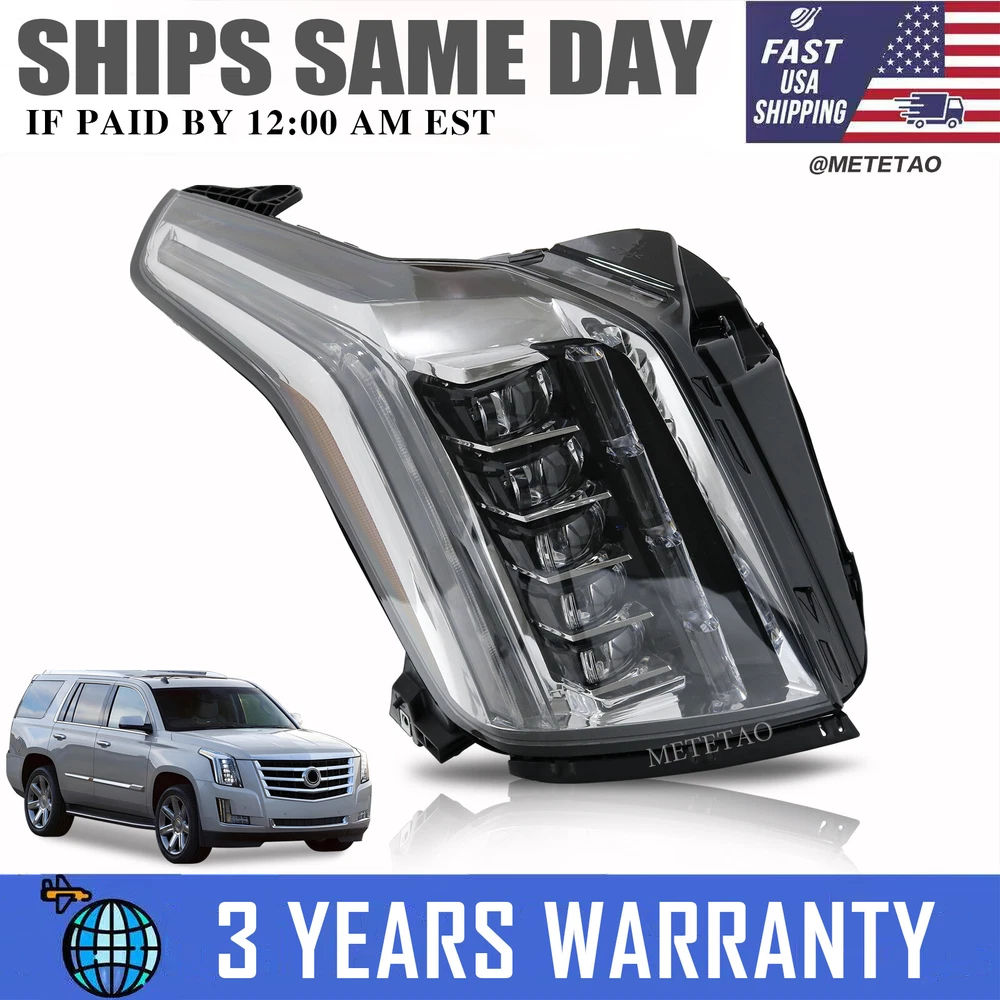 For Cadillac Escalade 2015-2020 Passenger Side Headlight Lamp Led Right Front Bumper Headlight Assembly Fitment: For Cadillac Escalade 2015-2020 Item Description: Type :Fog Light Assembly Condition : 100%New Lens Color :Clear Housing Color :Black Lighting Technology:LED Fitment Type: Direct Replacement ATTENTION !!!! Please check carefully whether it matches your model !!! The vehicle compatible chart on eBay is not 100% accurate, sometimes there may have Split year issues. The best method is to verify the OE number! Generally , the number is marked on the inner surface of the original part. If you have any questions about the product, please contact us. • We are proud to offer you the best price and fastest service for all your aftermarket parts needs. • In order to keep our good service, we have the following purchasing policies. Note • Due to objective reasons related to the equipment, there may be certain color deviations between the products we provide and the actual objects. We apologize for any inconvenience caused and kindly request your understanding. • We only warranty cost of parts. Any installation or other fees are non-refundable. • If the buyer needs to cancel or return the item, the buyer must begin the transaction in My eBay We depend on our customer satisfaction to succeed • If you are satisfied with the item, please take a moment to reward our efforrs by leaving us a "POSITIVE FEEDBACK" and perfect "5 STAR" scores. • If you intend to leave a neutral or negative feedback, please contact us firstly, so that we can satisfactorily address your concerns and rectify any issues. • Thank you for contacting us through Ebay Message. • We shall respond to your inquiry within 24hrs during business hours,if no response within 24 Hours,please check the spam in your mail box. Returns • We're here for you! • We are proud to offer quality service and free-worry. Payment Shipping Returns Policy About us Contact us Payment We accept payment of Credit Card, Debit Card, Gift Card, Apple pay, Google pay, Paypal and Paypal credi Item will be shipped immediately on the same or next business day of receiving full payment. Shipping Shipping within the 24H Contiguous United States Large items we ship with UPS/FEDEX UPS/FEDEX Tracking Number will be uploaded automatically in the "VIEW ORDER DETAILS" Returns Policy All of our items are tested and are fully working unless otherwise stated in the Listing Actual Images of item are shown above All sales are final. If there is an issue with the item under your normal using, we will replace it within warranty time. Terms & Conditions It is the sole responsibility of the buyer to verify the above fitment recommendations and part number compatibility prior to purchasing. The above fitment specs are a result of an abundance of in depth research. I am confident that the information is very precise, but I do not guarantee them to be accurate. If you purchase an item that is not compatible with your specific application, there are no returns, all sales are final. Furthermore, I am not responsible for improper fit, or anything associated with it such as installation fees that the buyer incurs. We are not responsible for any return or exchange after the warranty period has expired. No exceptions. The return policy is a little different for different circumstances: If we send you the wrong item or the item is damaged the time you receive it, we will cover all the costs associated with return or exchange. But it is required that you provide a photo to show us the problem first. All the return/exchange items must be in original package. All NON-seller mistake returns for refund ,buyer should pay for the return costs. (E.g. purchases the wrong item by mistake and doesn’t like the item or no longer need the item ) About us We are US located Seller. We try our best to represent our items but are still humans and sometimes mistakes may happen. Please do not be quick to judge us through our feedback system but contact us via ebay, we will fix the issue right away. Our Feedback is very important to us and we strive for a 5 star from every buyer. Contact us Customer Service Hours: Monday-Sunday 9am-10 pm Brand METETAO Lighting Technology LED Type Headlight Assembly Placement on Vehicle Front, Right Features DOT-Certified Housing Color Black Lens Color Clear Items Included Bulbs Manufacturer Part Number 84580183, 84216045 OE/OEM Part Number 84580183, 84216045 Number of Bulbs does not apply Light Color Cold White Bulb Shape Code does not apply