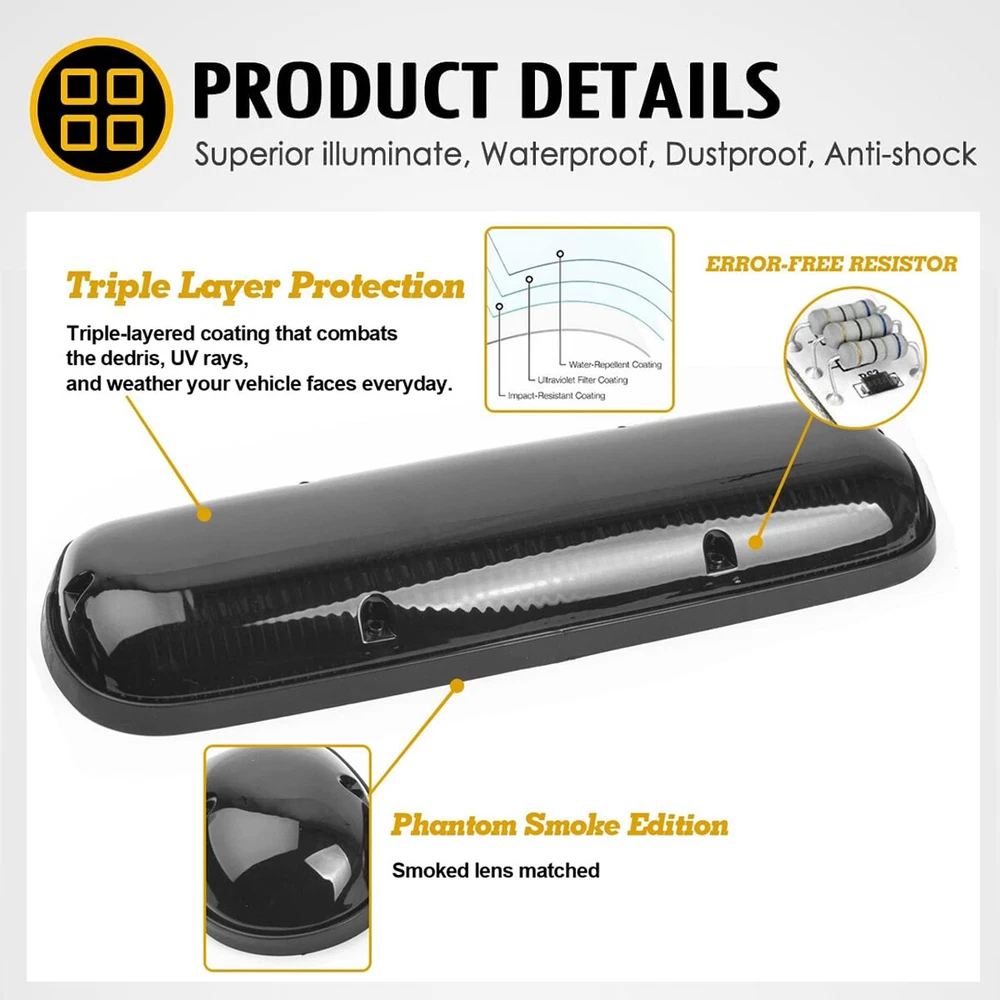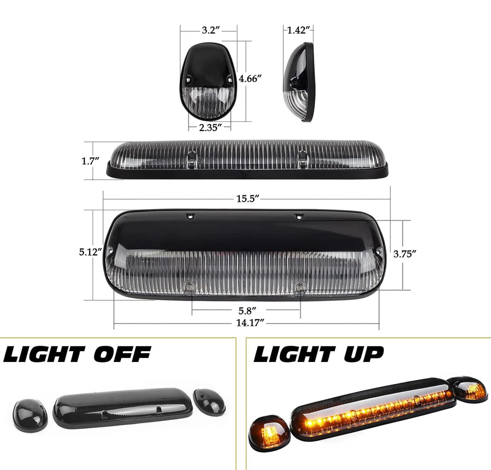 For 2002-2007 Chevrolet Silverado 2500HD 3500 LED Cab Roof Marker Lights Amber Fitment: Part number: RKL 755153SM Fit for 2002-2006 Chevy Silverado trucks with factory installed cab lights Fit for 2007 Chevy Silverado Classic trucks Fit for 2002-2006 GMC Sierra trucks with factory installed cab lights Fit for 2007 GMC Sierra Classic trucks Fit on 4x4 / Off-Road / SUV / Crossover / Jeep / RV / Pickup truck vehicle Features: ✔ SUPER BRIGHT & STURDY: 3pcs Smoke cab lights with built-in 30 Amber LED Lamps (One Long Lamp For Middle plus Two Small Lamps For The Sides), Output Super Bright white light, more eye-catching without glares, easy warn the upcoming car to reduce accidental risks. Particularly fit the night, heavy snow, rain and fog weather. ✔FIT FOR: for 2002, 2003, 2004, 2005, 2006 Chevy Silverado & GMC Sierra 1500 1500HD 2500 2500HD 3500 trucks with factory installed cab marker lights. 2007 Chevy Silverado & GMC Sierra 1500 1500HD 2500 2500HD 3500 Classic trucks. ✔HIGH QUALITY & WATERPROOF : Each LED Cab Marker Light Features Super Strong ABS Plastic Smoked Lens, With the IP67 Waterproof cover and design, will prevent from any sand, water, dirt, snow or dust. ✔ MUTI-FUNCTION: This Cab Marker Light functioned as Roof Marker Light, Roof Top Running Light, Top Clearance Light, Cab Running Light etc. ✔EASY TO INSTALL: Just remove your factory cab lights and bolt these in their place.Convenient for modifying & rewiring. Wiring: Black is to Ground and Red is to Positive. Modification or drilling might be required for the non-installed vehicles. Please note: 1.For a fresh new add-on installation, drilling is required. 2.The bottom of the cab roof lamp is flat, if you are about to install this on a very curvy rooftop , they might not fit properly. 3.No instruction in the package, professional installation is high recommended. 4.Please feel free to contact us for whatever we can help via eBay message. Specifications: Type: LED Cab Roof Top Marker Light LED: 30PCS 5050 LED chips Working voltage: 12V Material: ABS + PC Light Cover Shell color: Smoked Light color: Amber yellow Waterproof rating: IP67 Service life: more than 50000h Package Included: 3 x LED cab roof lights 1 x Wiring Pack (Wiring harness, on/off switch, gaskets and stainless steel screws) Payment We can accept payment of Paypal only. Payment should be made within 7 days after purchasing. (No payment orders eBay system will automatically open unpaid dispute, and this is not good to your account.) Shipping Item will be shipped out within 48 hours upon receipt of your cleared payment. We can not ship on Sundays and other public holidays. International Buyers Please Note: 1, Import duties, taxes and charges are not included in the item price or shipping charges. These charges are the buyer's responsibility. 2, Please check with your countrys customs office to determine what these additional costs will be prior to bidding/buying. Please make sure your address in paypal is correct. we will only follow your address listed in the Paypal payment for the shipment. Combine shipment is not allowed. If you want to combine all the items together, you should still pay for all of the shipping, insurance and handling fee! Returns We offer you 30 days return. The buyer is responsible for return shipping including a result of customer error or wrong item bought: 1) If you received an incorrect, damaged, defective, or item not as described, contact us for a partial/full refund or replacement on our cost. 2) If you want to return the item, please contact us within 60 days after package received. Return products must also be in its original condition: including box, packaging and all other accessories. Feedback 1.We are appreciated your business and to improve our customer service and our commitment to quality. 2.We will leave a positive feedback immediately after payment is received. We appreciate a positive feedback as much as you do. 3.If for some reason there is any issue with the purchase, please contact us prior to leaving feedback, and we will be glad to work with you to have it resolved. Contact Us We do appreciate your purchase from our store. If you are satisfied with the item as well as our service, please kindly leave us a Positive Feedback to help develop our business. Thank you in advance. Our office hours are MONDAY - FRIDAY 9:00PM - 18:00PM PST , we do not answer any E-mails or eBay messages on weekend. All E-mail or eBay message take us around 24 hours to respond. Thanks a lot. For 2002-2007 Chevrolet Silverado 2500HD 3500 LED Cab Roof Marker Lights Amber Fitment: Part number: RKL 755153SM Fit for 2002-2006 Chevy Silverado trucks with factory installed cab lights Fit for 2007 Chevy Silverado Classic trucks Fit for 2002-2006 GMC Sierra trucks with factory installed cab lights Fit for 2007 GMC Sierra Classic trucks Fit on 4x4 / Off-Road / SUV / Crossover / Jeep / RV / Pickup truck vehicle Features: ✔ SUPER BRIGHT & STURDY: 3pcs Smoke cab lights with built-in 30 Amber LED Lamps (One Long Lamp For Middle plus Two Small Lamps For The Sides), Output Super Bright white light, more eye-catching without glares, easy warn the upcoming car to reduce accidental risks. Particularly fit the night, heavy snow, rain and fog weather. ✔FIT FOR: for 2002, 2003, 2004, 2005, 2006 Chevy Silverado & GMC Sierra 1500 1500HD 2500 2500HD 3500 trucks with factory installed cab marker lights. 2007 Chevy Silverado & GMC Sierra 1500 1500HD 2500 2500HD 3500 Classic trucks. ✔HIGH QUALITY & WATERPROOF : Each LED Cab Marker Light Features Super Strong ABS Plastic Smoked Lens, With the IP67 Waterproof cover and design, will prevent from any sand, water, dirt, snow or dust. ✔ MUTI-FUNCTION: This Cab Marker Light functioned as Roof Marker Light, Roof Top Running Light, Top Clearance Light, Cab Running Light etc. ✔EASY TO INSTALL: Just remove your factory cab lights and bolt these in their place.Convenient for modifying & rewiring. Wiring: Black is to 