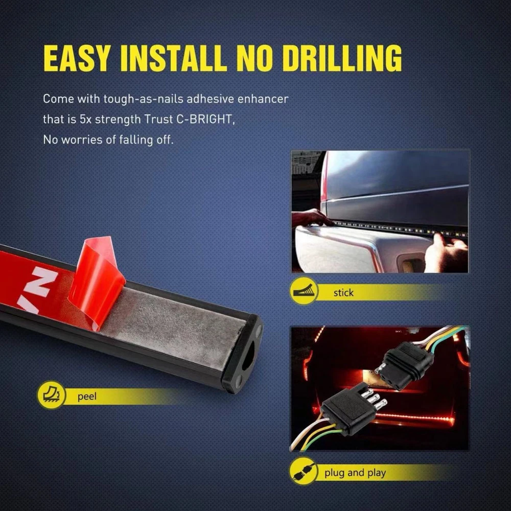 SAFE & SECURE SHOPPING 100% SATISFACTION GUARANTEED FAST SHIPPING For Chevy Truck RV 60" LED Strip Tailgate Light Bar Reverse Brake Signal Product Description Features: 1.Universal Fit for most trucks, SUV, For Jeeps, and RV. 2.Good quality, good operation. 3.Fully sealed waterproof design. 4.Low power consumption and ultra-long life. 5.Plug and play standard 4PIN connector. No need to change any lines. Specifications: 100% Brand new and waterproof Voltage: DC-12V Wattage: 22W LED Type: 2835 LED Led number: 90pcs Color: Red for turn signal, parking and brake, white for reverse lights. Lampholder Interface: Standard 4 PIN connector Lamp working mode: 1. Running lights: red light is all bright and low 2. Reversing light: white light is highlighted 3. Brake light: red light full bright strong light 4. Left steering: The red light on the left side is half bright 5. Right steering: The red light on the right side is half bright Package Includes: 1x 60" long Tailgate LED strip with tape Shipping Contact Us Shipping Our products have been sent to the US warehouse. All items will be shipped via WINIT CORPORATION. In 2-5 working days, you will receive your items. Thank you and have a nice day. Contact Us If you have any question about us or items, please contact us, we will reply it as soon as possible. Copyright © 2022 Tongtool