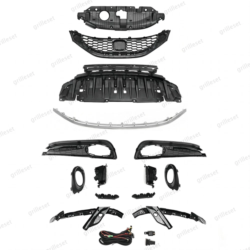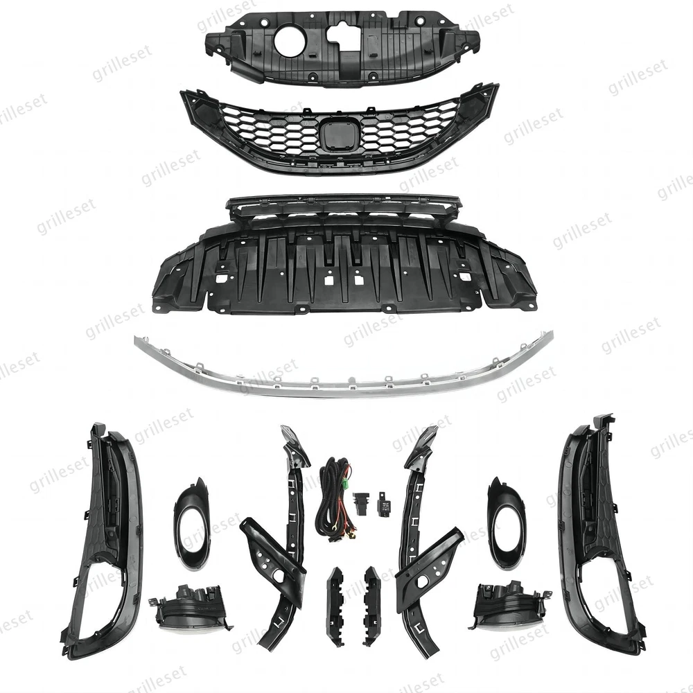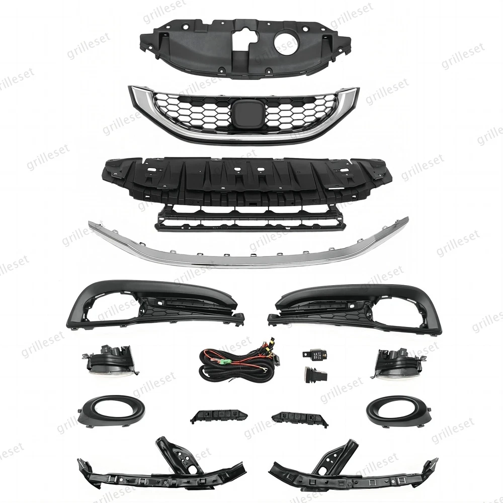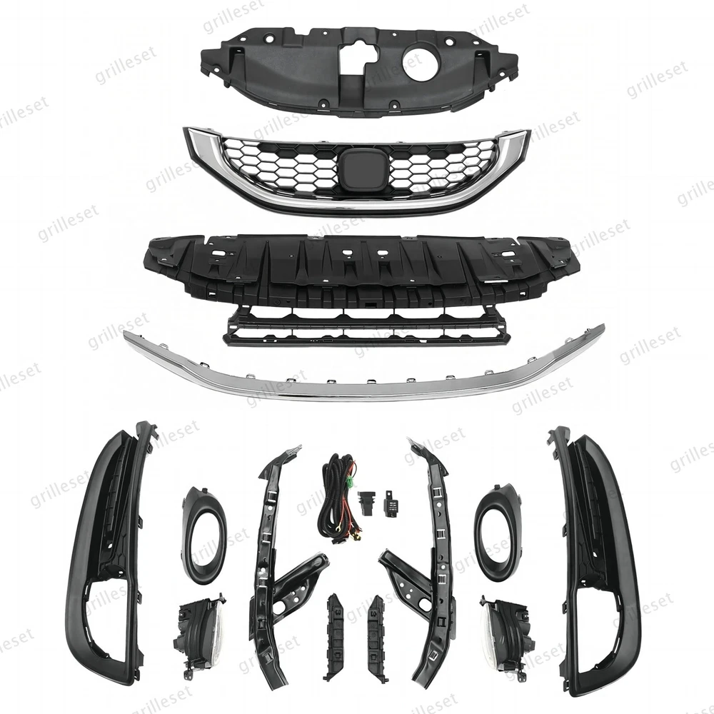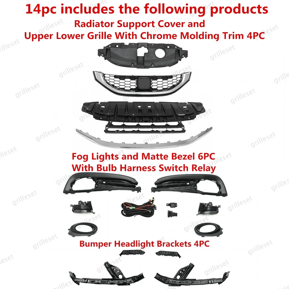 Fit for : 1 Set (14 PCS) Includes:(See more pictures for details) 1 Pc front radiator support cover 1 Pc front upper black grille with chrome trim 1 Pc front lower black grille mesh 1 Pc front bumper lower moulding chrome 2 Pcs fog lights with bulb,switch,relay and Harness 2 Pcs fog light bezels 2 Pcs fog light Covers trim 2 Pcs front headlight brackets 2 Pcs front bumper brackets Item OE number : 71121-TR3-A11;71122-TR3-A01;71125-TR3-A01;71105-TR3-A51;71108-TR3-A51;71190-TR0-A00;71140-TR0-A00;71198-TR0-A01;71193-TR0-A01;71107-TR3-A51;71106-TR3-A51;71117-TR3-A51;71116-TR3-A51;33951-TR0-A51;33901-TR0-A51 Installation : Perfect fit direct replacement, no modifications required. Installation manual not provided; we recommend professional installation. Item's-Features : Superior quality kit 100% brand new Made from high-quality materials Excellent replacement part, no modifications needed Other parts fit for