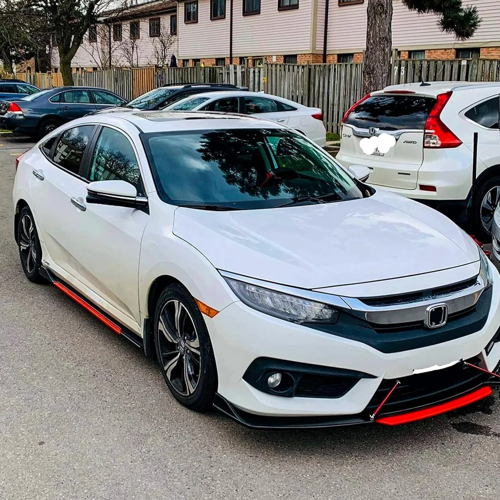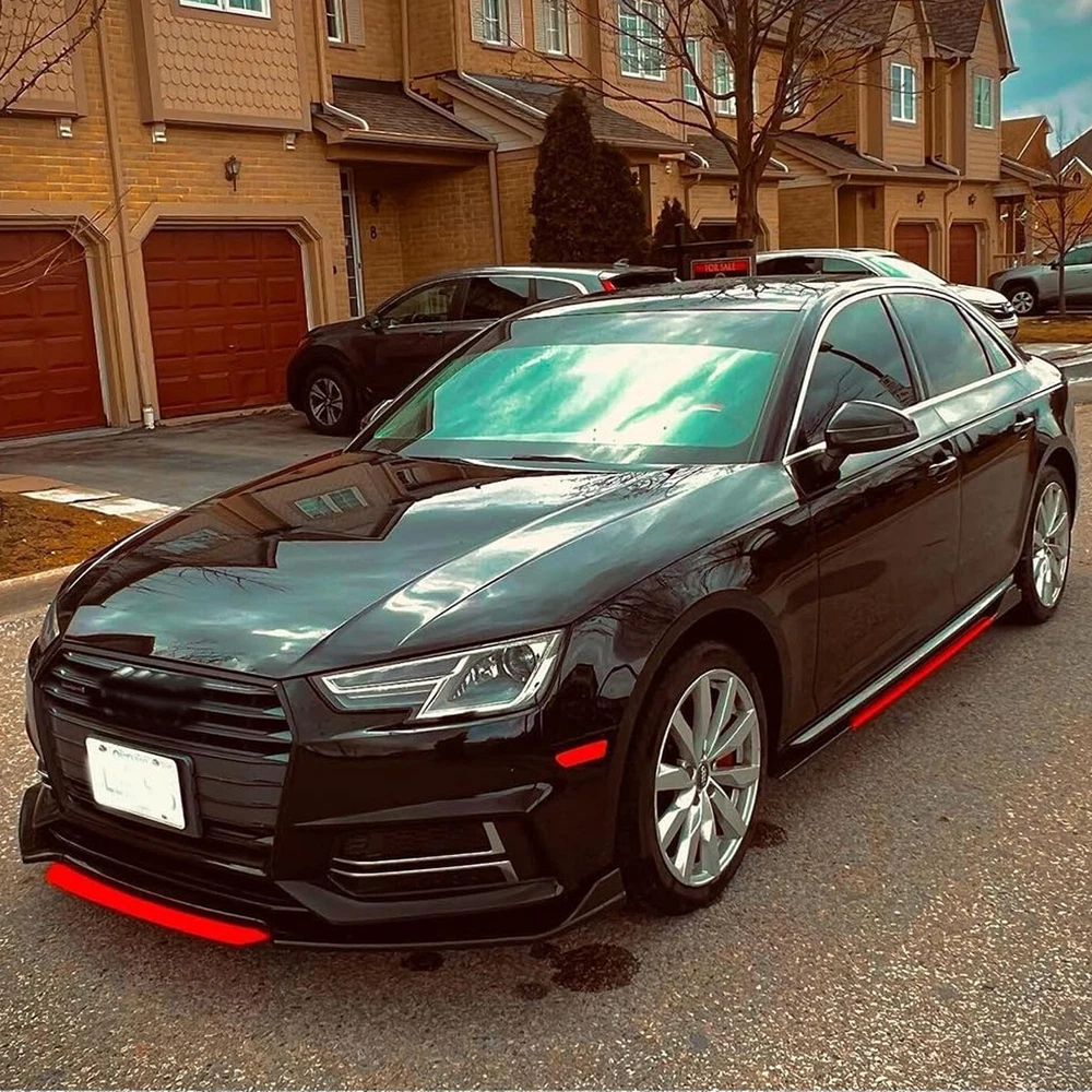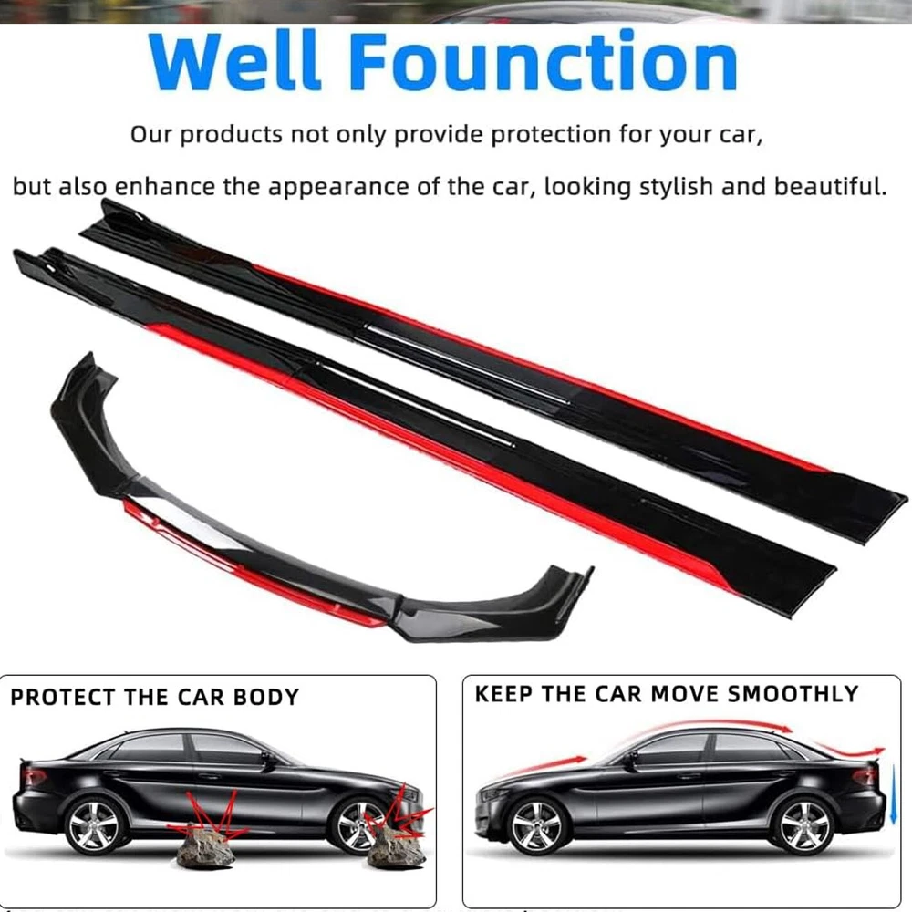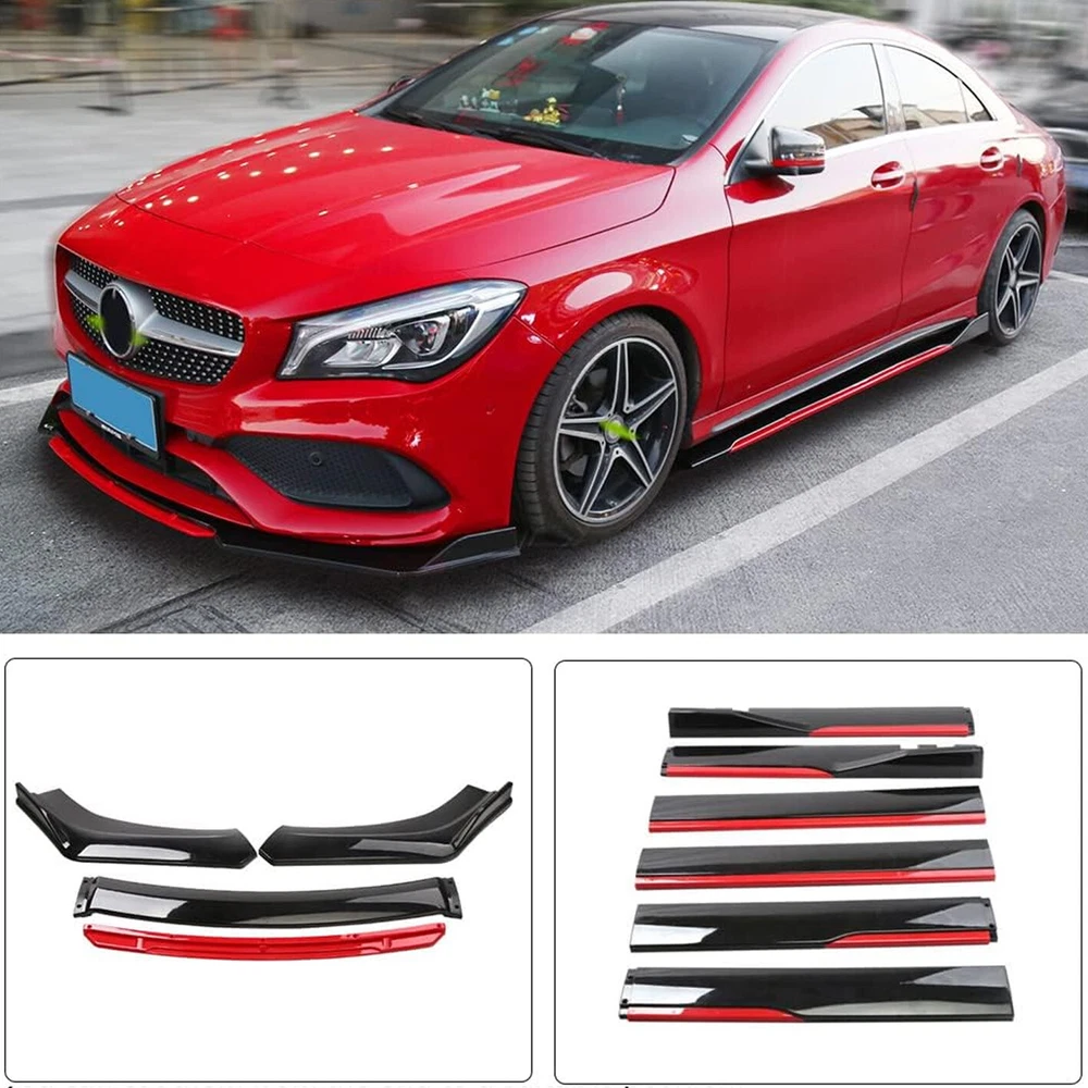 ackage 1. Front Bumper Lip Spoiler Splitter(5pcs) This front bumper lip splitter is fit for most models with front bumper size around 1750mm~1950mm. Feature: -Direct Fit. -Easy install and durable use. -Great quality and great Fitment. -Correct Connector No cutting or splicing. -Strict quality control standards to Build and test. -It'll give you a sporty look without making it too aggressive. -Light in weight and enduring, different optical line comes from different points of view. *Instruction Not Included, Professional Installation Is Highly Recommended.* Specification: -Type:Front Lip Chin Bumper Body Kit -Material:ABS -Color: Glossy Black +Red (as pictures show) -Placement on Vehicle:Front;;Lower -Fitment Type:Performance/Custom This front bumper lip body kit is suitable for most small cars and simple. And the flanks on both sides can be adjusted to make it more suitable for the width of the front of your car. Package 2. 2 x 86.6" Side Skirt Extension ( 6pcs ) Specification: Condition: 100% Brand New and High Quality Type: Car Body Side Skirts Material: Made of high quality PP plastic, Durable Color: Glossy Black +Red (as pictures show) Side Skirt Length: 86.6in / 2.2M Position: Side Skirt Extension Features: Universal modified side skirt for car sedan. While the side skirts don't affect the front ground clearance too much, it enhances the side extension of the in a very pure and exciting way. A Perfect Aftermarket Replacement. Professional Installation Is Highly Recommended. Package Included 3 Rear Lip Specification: Condition: 100% Brand New and High Quality Type: Car Body Rear Lip Material: Made of high quality PP plastic, Durable Color: Glossy Black (as pictures show) Surface Finish: Glossy Black Style Rear Lip Size:48cm/19“ Placement on Vehicle: Left, Right Package Included 4 2pcs Splitter Rods Material: premium quality aluminum alloy The length can be adjustable from 8" to 11" Fitment: Universal Note: Require drilling holes into the bumper lip diffuser to attach safely to the vehicle. Package Includes: 4 pcs /set Front Lip Chin Bumper Body Kits 2 x Side Skirts 2 x Rear Lip 2 X Splitter Strut Rods 1 x Screws kit Note: Installation instruction is not included, professional installation is recommended. Please allow 1-3CM differs due to manual measurement.