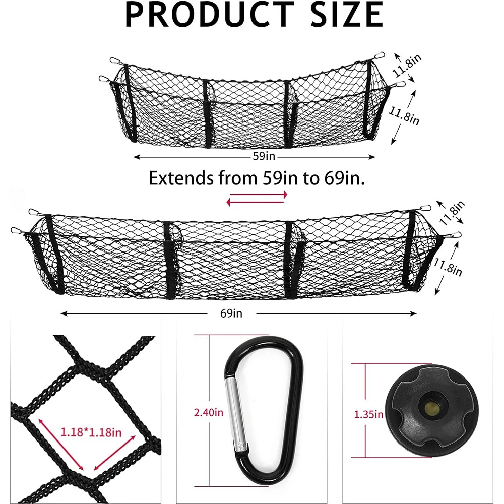For Dodge Dakota 1997-2012 Trunk Bed Cargo Net 3 Pocket Envelope Mesh Storage Specification Color: Black Suitable for type: direct replacement Material: Elastic, Nylon Placement on the vehicle: trunk, trunk area, trunk space Type: trunk cargo net pockets Number of cargo net pockets: 3 Feature 【Durable Material】 Truck bed cargo net is made of strong and durable heavy-duty nylon and rubber, with highly elastic and stretchable ropes, which has very good recovery properties. Unlike ordinary nets, it can put more things in it. High quality aluminum hooks are strong and durable. 【Enough Space】 Pickup truck net pocket size is 59*11.8*11.8in and can be stretched to fit the width of your pickup truck bed. It fits most car models, but definitely not all. It is suitable for car owners to use when traveling, self-driving, etc., allowing you to easily organize your car. Note: Please confirm the size of truck bed before purchasing. 【Neat and Organized Storage】 The truck net features three pockets to help organize or store sports gear, balls, groceries, emergency kits, tools, vehicle storage accessories and more. Three pocket cargo nets provide easy access to everything you stow in the trunk. And keep your storage area organized and tidy. 【Easy to Install】 2 installation methods. If your car comes with its own embedded hooks, you only need to connect the car's own hook, the metal hook and the rope on the cargo net. If your vehicle does not have embedded hooks, you can use four retrofit hooks included in the package. Complete installation instructions are in the pictures. 【Package Included】 You will receive 1 cargo net, 4 metal hooks, 4 plastic retrofit hooks, and 4 screws. For any reason you are not satisfied with the quality of your car trunk net, please feel free to contact us. We are trying our best to provide you with the best service. Package Included 1x Cargo Net 4x Metal Hooks 4x Plastic Retrofit Hooks 4x Screws •We accepted PayPal payment ONLY •We will ship your order within 24 hours after receiving your verified payment (Excluding Weekends and Public Holidays) •The estimated delivery time is within 3-7 working days(not including the weekend). •United States:3-5 working days(not including the weekend) •If you fail to receive over 7 days, please contact us and we will try our best to help •Return items must not be used or have any sign of abuse or intentional damage. •Buyer is responsible for all return shipping charges. •We reserve the right not to refund S&H when the item has been posted. We are a company run business with more than 10 years experience in whole sale of quality Motorcycle And Car Parts & Accessories Specification Color: Black Suitable for type: direct replacement Material: Elastic, Nylon Placement on the vehicle: trunk, trunk area, trunk space Type: trunk cargo net pockets Number of cargo net pockets: 3 Feature 【Durable Material】 Truck bed cargo net is made of strong and durable heavy-duty nylon and rubber, with highly elastic and stretchable ropes, which has very good recovery properties. Unlike ordinary nets, it can put more things in it. High quality aluminum hooks are strong and durable. 【Enough Space】 Pickup truck net pocket size is 59*11.8*11.8in and can be stretched to fit the width of your pickup truck bed. It fits most car models, but definitely not all. It is suitable for car owners to use when traveling, self-driving, etc., allowing you to easily organize your car. Note: Please confirm the size of truck bed before purchasing. 【Neat and Organized Storage】 The truck net features three pockets to help organize or store sports gear, balls, groceries, emergency kits, tools, vehicle storage accessories and more. Three pocket cargo nets provide easy access to everything you stow in the trunk. And keep your storage area organized and tidy. 【Easy to Install】 2 installation methods. If your car comes with its own embedded hooks, you only need to connect the car's own hook, the metal hook and the rope on the cargo net. If your vehicle does not have embedded hooks, you can use four retrofit hooks included in the package. Complete installation instructions are in the pictures. 【Package Included】 You will receive 1 cargo net, 4 metal hooks, 4 plastic retrofit hooks, and 4 screws. For any reason you are not satisfied with the quality of your car trunk net, please feel free to contact us. We are trying our best to provide you with the best service. Package Included 1x Cargo Net 4x Metal Hooks 4x Plastic Retrofit Hooks 4x Screws PAYMENT •We accepted PayPal payment ONLY SHIPPING •We will ship your order within 24 hours after receiving your verified payment (Excluding Weekends and Public Holidays) •The estimated delivery time is within 3-7 working days(not including the weekend). •United States:3-5 working days(not including the weekend) •If you fail to receive over 7 days, please contact us and we will try our best to help Terms of Sale •Return items must not be used or have any sign of abuse or intentional damage. •Buyer is responsible for all return shipping charges. •We reserve the right not to refund S&H when the item has been posted. ABOUT US We are a company run business with more than 10 years experience in whole sale of quality Motorcycle And Car Parts & Accessories On Feb 19, 2025 at 22:43:24 PST, seller added the following information: