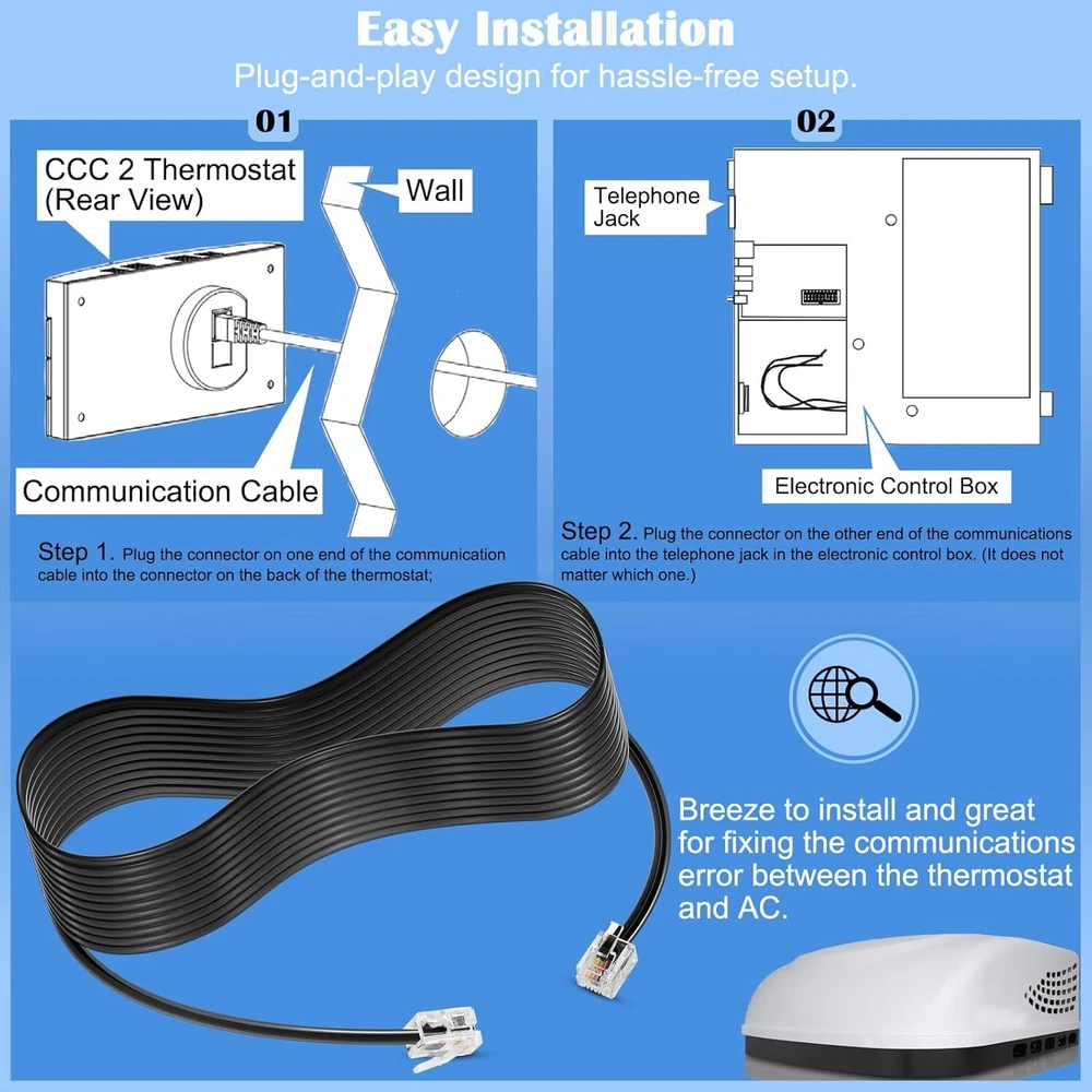 For Dometic RV Heat Pumps AC Control Boards Air Conditioner Communication Cable About this item 【Wide Application】 Compatible with select Dometic RV air conditioners with heat pumps systems. Fits for 3109228.001 and 3109228.019 CCC 5-Button T-Stats; Fits for 3314082.011 and 3314082.000 CCC2 10-Button T-Stats; Fits for Micro-Air 357 and 350 T-Stats. 【High Performance】 Used to easily & properly set up a new air conditioning system or replace the old/worn-out cable to restore the communication from the motorhome thermostat to the AC control boards, ensures the seamless connection between the air conditioner and wall-mounted control center for efficient operation and temperature regulation. 【Simple Installation】 Plug-and-play design for easy installation and setup. Features with two RJ-11-6CAP communication connectors, you can easily connect and disconnect the cable as needed. A must-have for maintaining a comfortable temperature inside your recreational vehicle. 【Proprietary Cable】 The cable is made from four conductors to transmit data at high-speeds as well as constructed with shielding to reduce interference and signal loss. Designed for use with Dometic air conditioning systems, facilitate the optimal communication and performance between components. 【100% Satisfaction Guarantee】 If you're not satisfied with this 3106614.013 Communication Data Cable for Dometic RV Thermostats and AC Control Boards, simply return it for getting refund in 30 days. While you have any questions about our products, please feel free to contact us Product Description A standard 6 pin telephone cable will not work in place of this 6 pin data cable. A 6 pin data cable is designed for transmitting digital data between devices, while a 6 pin telephone cable is designed for transmitting analog signals in telephone and telecommunications systems. Using this Air Conditioner Communication Cable for Dometic, allows easily set up a new air conditioning system or replace worn-out cables, effectively restore the communication from the motorhome thermostat to the overhead A/C, ensures the seamless operation and temperature control. Fits for Micro-Air 357 and 350 T-Stats; Fits for 3109228.001 and 3109228.019 CCC 5-Button T-Stats; Fits for 3314082.011 and 3314082.000 CCC2 10-Button T-Stats; Compatible with Dometic Multi-Zone Thermostats CCC and CCC II. Easy Installation: Plug-and-play design for hassle-free setup. Breeze to install and great for fixing the communications error between the thermostat and AC. 1.All Payments must be Confirmed (Shipping and billing addresses must match) Payment is required within 7 days from the date of the auction ending. 2.We accept PayPal, MasterCard, Visa, American Express, Discover and etc payment. 1.Orders will be ship out within 1 business days via USPS, Or UPS . (Orders from Saturdays, Sundays or holidays will process on next business day and will be ship within 24 hours. ) 2.All of the items are shipped from our Warehouse in USA.It will take about 3 to 5 business days to you. 3.Any defective items received can be replaced or refunded. Please contact us with the item number, eBay ID and defect description. 1.100% Satisfaction Guarantee: If you're not 100% satisfied with our items, simply return it for a full refund in 60 days (Items must be in new condition and in original package). Kindly please feel free to contact us before return. 2.Return or Replacements: Support 12 months' Warranty. All product will be tested in 100% before delivery. If the item is was damaged in transit, kindly please contact us for a replacement or refund (Excluding contrived damage or misuse). Any question, please don’t hesitate to let us know. We try our best to reply to your emails as soon as possible, due to high volume of daily incoming emails, we may not be able to reply your emails immediately. Please allow 24 hours for us to response. your understanding and patience is much appreciated!