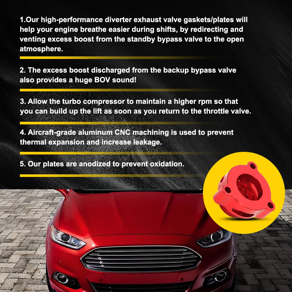 Fit for: Ford Escape 1.5L/1.6L EcoBoost models 2013-2018 Ford Fiesta ST 1.6L EcoBoost models 2014-2019 Ford Fusion 1.5L/1.6L EcoBoost models 2013-2019 Ford Fusion 2.0L EcoBoost models 2017-2019 Ford Fusion Sport 2.7L EcoBoost models 2017-2019 Ford Mustang 2.3L EcoBoost models 2015-2019 Specifications: Product Material: Aluminum Color: Red Features: *Function Blow off valve spacer/plate will help your engine breathe easier during shifts by redirecting and venting excess boost from the stock bypass valve to open atmosphere. *BOV Sound For Escape Ford Fiesta ST Fusion EcoBoost BOV Mustang Blow Off Valve Adapter Red Fit for: Ford Escape 1.5L/1.6L EcoBoost models 2013-2018 Ford Fiesta ST 1.6L EcoBoost models 2014-2019 Ford Fusion 1.5L/1.6L EcoBoost models 2013-2019 Ford Fusion 2.0L EcoBoost models 2017-2019 Ford Fusion Sport 2.7L EcoBoost models 2017-2019 Ford Mustang 2.3L EcoBoost models 2015-2019 Specifications: Product Material: Aluminum Color: Red Features: *Function Blow off valve spacer/plate will help your engine breathe easier during shifts by redirecting and venting excess boost from the stock bypass valve to open atmosphere. *BOV Sound The venting of the excess boost from the stock bypass valve also provides with the great BOV sound! Allows the turbo's compressor to maintain higher RPM so you can build boost as soon as your back on the throttle. *Perfect Fit The gasket is precisely matched to the size of the exhaust valve and the connecting interface, ensuring a tight fit of the sealing surface and avoiding leakage. *Advanced Technology Adopts aircraft-grade aluminum to prevent thermal expansion and boost leaks. *Anti-oxidation Our plates are anodized for additional protection from oxidation. Packaging Include: 1 set Blow off valve adapter with bolts Item Specifics Color Black Brand Unbranded Items Included Shift Knob Type Turbo Blow Off Valve Adapter Material Aluminum Manufacturer Part Number Does Not Apply Universal Fitment Yes Manufacturer Warranty 1 Year Packaging Include 1 set Blow off valve adapter with bolts Features Strength and long lasting durability Other Part Number Turbo Blow Off Valve Adapter with Bolts To Fit DOHC Turbocharged Engine Fit for For Ford Escape Fiesta Fusion Mustang EcoBoost Country/Region of Manufacture China Performance Part Yes Payment We accept PayPal via eBay Secure Check-Out only. Immediate payment needs to be processed for items with Add to Cart option so that any promotional discounts can be applied to your order immediately. Shipping 1 .We do everything we can to ship your orders out as soon as possible. 2. Shipping and Handling: We process orders within two business day after the payment was clear. Returns Our 30-day Satisfaction Guarantee assures our customers that they will receive all orders promptly and exactly as described. In addition, it allows customers to return new and unused products in their original factory condition for any reason within 30 days from the date of purchase. 1. All returns must be pre-approved by AUXITO and have a return merchandise authorization(RMA) number. Unauthorized returns will not be accepted. 2. Buyers are responsible for appropriate packing, returning shipping cost, insurance and returning the item in "new" condition. Used items will not be accepted for return. 3. We will replace the returning item with an identical item, issue a full store credit or a full refund. Contact Us Our Working Time:(GMT+8)Monday to Friday,9:00-18:00. For inquires and customer support, please send your email via ebay email system. All emails will be responded to within 24 hours during business days. Feedbacks 1. We appreciate your business and strived to improve our customer service and our commitment to quality. 2. We will leave a positive feedback immediately after payment is received. We appreciate a positive feedback as much as you do. 3. If for some reason there is any issue with the purchase, please contact us prior to leaving feedback, and we will be glad to work with you to have it resolved. DESCRIPTION PAYMENT SHIPPING RETURN POLICY CONTACT US Hot Item 146PCS For Toyota RAV4 Fender Door Hood Bumper Trim Clip Retainer Fastener Kit USD 10.92 Fit For 2015-2019 Hyundai Center Light Gray Sonata Armrest Console Lid Cover USD 13.29 4" Red Truck Long Performance High Flow Cold Air Intake Cone Dry Filter Cotton USD 27.54 Waterproof Motorcycle Handlebar Dual USB Phone Charger Cigarette Lighter Socket USD 13.29 AUXITO 7440/7443 Turn LED Signal Light Bulbs Anti Hyper Flash Amber Super Bright USD 21.84 Hot Item 146PCS For Toyota RAV4 Fender Door Hood Bumper Trim Clip Retainer Fastener Kit USD 10.92 Waterproof Motorcycle Handlebar Dual USB Phone Charger Cigarette Lighter Socket USD 13.29 4" Red Truck Long Performance High Flow Cold Air Intake Cone Dry Filter Cotton USD 27.54 AUXITO 7440/7443 Turn LED Signal Light Bulbs Anti Hyper Flash Amber Super Bright USD 21.84 Fit For 2015-2019 Hyundai Center Light Gray Sonata Armrest Console Lid Cover USD 13.29 For Escape Ford Fiesta ST Fusion EcoBoost BOV Mustang Blow Off Valve Adapter Red Fit for: Ford Escape 1.5L/1.6L EcoBoost models 2013-2018 Ford Fiesta ST 1.6L EcoBoost models 2014-2019 Ford Fusion 1.5L/1.6L EcoBoost models 2013-2019 Ford Fusion 2.0L EcoBoost models 2017-2019 Ford Fusion Sport 2.7L EcoBoost models 2017-2019 Ford Mustang 2.3L EcoBoost models 2015-2019 Specifications: Product Material: Aluminum Color: Red Features: *Function Blow off valve spacer/plate will help your engine breathe easier during shifts by redirecting and venting excess boost from the stock bypass valve to open atmosphere. *BOV Sound The venting of the excess boost from the stock bypass valve also provides with the great BOV sound! Allows the turbo's compressor to maintain higher RPM so you can build boost as soon as your back on the throttle. *Perfect Fit The gasket is precisely matched to the size of the exhaust valve and the connecting interface, ensuring a tight fit of the sealing surface and avoiding leakage