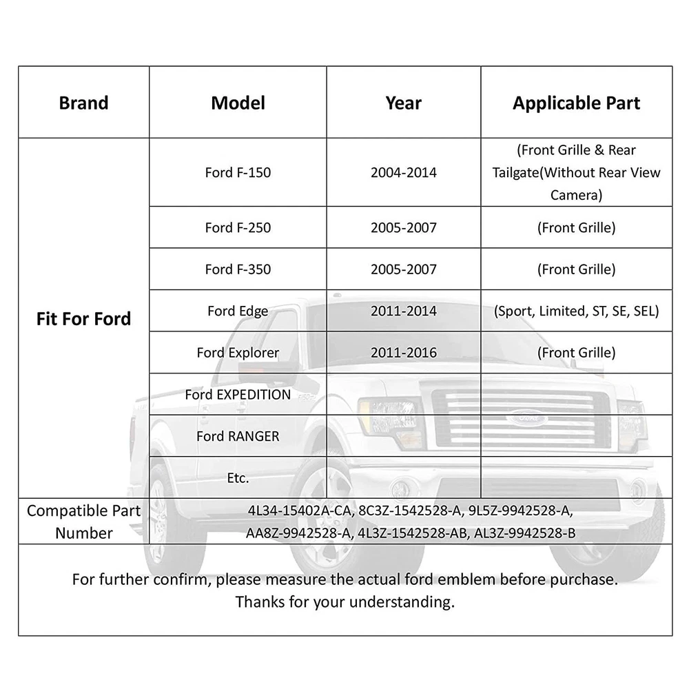 Silver&Black 9inch For Ford F150 Front Grille Tailgate Emblem US Flag Oval Badge Features Unique design for Most Ford Models . Design innovative, simple, beautiful. Good quality and durable. Can be used as car front hood grille and rear emblem. Made by high performance ABS&Aluminum. Easy installation, self adhesive tape is included on the back of the Badge. Fitment Note: Please check the measurements of your original emblem to verify if this emblem will work on your vehicle. For 9inch Emblem OEM Equivalent Part Number: 4L34-15402A-CA, 8C3Z-1542528-A,9L5Z-9942528-A, AA8Z-9942528-A, 4L3Z-1542528-AB, AL3Z-9942528-B For Ford F-150 2004-2014 (Front Grille & Tailgate(Without Rear View Camera) For Ford F-250 2005-2007 (Front Grille) For Ford F-350 2005-2007 (Front Grille) For Ford Edge 2011-2014 (Sport, Limited, ST, SE, SEL) (Front Grille) For Ford Explorer 2011-2016 (Front Grille) For Ford Expedition 2007-2009 (Front Grille) For Ford Ranger 2006-2011 (Front Grille & Tailgate) For Ford Sport Trac 2007-2008 (Front Grille) For Ford Flex 2010 (Rear Tailgate) For Ford Interceptor Utility 2019 (Front Grille) Specifications Type: Emblem for ford Material: ABS Base+Aluminum logo Overall size: 23*9cm Color: Silver+Balck Package Included 1 x Oval Front Grille Emblem Note: The surface of the sticker is protected by a film, and the back is glued. Clean the pasting part before pasting. Use a hair dryer to slightly heat the glue on the back of the sticker,the effect will be better. You'd better not to wash the car for 3 days after pasting it on the car. Payment We can accept payment of Paypal only. Payment should be made within 7 days after purchasing. (No payment orders eBay system will automatically open unpaid dispute, and this is not good to your account.) Shipping Item will be shipped out within 48 hours upon receipt of your cleared payment. We can not ship on Sundays and other public holidays. International Buyers Please Note: 1, Import duties, taxes and charges are not included in the item price or shipping charges. These charges are the buyer's responsibility. 2, Please check with your countrys customs office to determine what these additional costs will be prior to bidding/buying. Please make sure your address in paypal is correct. we will only follow your address listed in the Paypal payment for the shipment. Combine shipment is not allowed. If you want to combine all the items together, you should still pay for all of the shipping, insurance and handling fee! Returns We offer you 30 days return. The buyer is responsible for return shipping including a result of customer error or wrong item bought: 1) If you received an incorrect, damaged, defective, or item not as described, contact us for a partial/full refund or replacement on our cost. 2) If you want to return the item, please contact us within 60 days after package received. Return products must also be in its original condition: including box, packaging and all other accessories. Feedback 1.We are appreciated your business and to improve our customer service and our commitment to quality. 2.We will leave a positive feedback immediately after payment is received. We appreciate a positive feedback as much as you do. 3.If for some reason there is any issue with the purchase, please contact us prior to leaving feedback, and we will be glad to work with you to have it resolved. Contact Us We do appreciate your purchase from our store. If you are satisfied with the item as well as our service, please kindly leave us a Positive Feedback to help develop our business. Thank you in advance. Our office hours are MONDAY - FRIDAY 9:00PM - 18:00PM PST , we do not answer any E-mails or eBay messages on weekend. All E-mail or eBay message take us around 24 hours to respond. Thanks a lot. Silver&Black 9inch For Ford F150 Front Grille Tailgate Emblem US Flag Oval Badge Features Unique design for Most Ford Models . Design innovative, simple, beautiful. Good quality and durable. Can be used as car front hood grille and rear emblem. Made by high performance ABS&Aluminum. Easy installation, self adhesive tape is included on the back of the Badge. Fitment Note: Please check the measurements of your original emblem to verify if this emblem will work on your vehicle. For 9inch Emblem OEM Equivalent Part Number: 4L34-15402A-CA, 8C3Z-1542528-A,9L5Z-9942528-A, AA8Z-9942528-A, 4L3Z-1542528-AB, AL3Z-9942528-B For Ford F-150 2004-2014 (Front Grille & Tailgate(Without Rear View Camera) For Ford F-250 2005-2007 (Front Grille) For Ford F-350 2005-2007 (Front Grille) For Ford Edge 2011-2014 (Sport, Limited, ST, SE, SEL) (Front Grille) For Ford Explorer 2011-2016 (Front Grille) For Ford Expedition 2007-2009 (Front Grille) For Ford Ranger 2006-2011 (Front Grille & Tailgate) For Ford Sport Trac 2007-2008 (Front Grille) For Ford Flex 2010 (Rear Tailgate) For Ford Interceptor Utility 2019 (Front Grille) Specifications Type: Emblem for ford Material: ABS Base+Aluminum logo Overall size: 23*9cm Color: Silver+Balck Package Included 1 x Oval Front Grille Emblem Note: The surface of the sticker is protected by a film, and the back is glued. Clean the pasting part before pasting. Use a hair dryer to slightly heat the glue on the back of the sticker,the effect will be better. You'd better not to wash the car for 3 days after pasting it on the car. On Nov 21, 2024 at 02:08:19 PST, seller added the following information:
