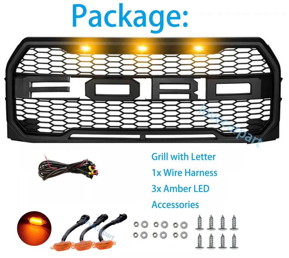 Product Description Specification: Color: Matte Black Material: Durbale ABS Plastic Part F&R Letters are detachable.You coud paint the grille in color you need. Feature: 1.Products: This grill fit for f150 2015-2017 Ford F150. 2.Fitment:Fits for 2009-2014 Ford F150 raptor grill comes with three LED lights and FORD logo letters. 3.Features: The grill is made of ABS plastic that is lightweight and durable, giving your vehicle full protection on-road and off-road. Provides better airflow to the radiator to help the cooling process better. 4.Color: Luxury matte black front grill add more aggressive and rugged style to your front end. 5.Easy to Install: This grill replacement is very easy to install, you just unscrew the old one, and replace it with the new grill. All needed wiring harness of LED Accents are provided, so simply splices into existing factory headlight harness. Installation can be completed with only essential hand tools. Package Include: 1x Front Grille 1x F&RLetters 3x Amber LED Lights 1x Wire Harness About Us Payment Terms Returns Contact Us Figocarpart is one of US’s fastest growing online retailersWith our best effort, we are now trusted by more than 100,000 customers nationwide. We are dedicated to offering you an unrivalled choice of products with unbeatable low price and best quality. We ONLY accept Paypal. We ship to your eBay or Paypal address. Please make sure your eBay ID、contact and Paypal address is correct before you pay. Thank you! 1.If item is defective and not working on arrival, please contact us within 7 days of receiving the defective for repair or refund. Item may be returned within 30 days of purchase upon your receipt.All items returned must contain all original packaging materials. 2.This item have 1Year warranty. We offer free repairing service within 6 months from the date of purchased. If damaged is caused by undue wear and tear, dirt, misused, improper installation/operation, accident or repaired by unauthorized person, the warranty becomes void. 3.All returns must have prior authorization. Please message us firstly if you have any problem. Please contact us before you return the item. 4.Buyer is responsible for the return postage. If you ask for a refund during valid period, we will offer you a refund without postage charges. Shipping and handling charges, insurance are not refundable in any case. We are only responsible for once re-sending expense for replacement due to defects. Please contact us firstly if you have any problem. * We give you a 30 days money-back guarantee to return any items purchased, no questions asked, hassle-free. * You can return for refund or exchange same product or different product (difference of price will be charged) within 30 days after you receive the item. * Any returning or exchanging items must be in the original package and new condition. We reserve rights to refuse refit or damaged items (caused by buyer) for return and exchange. * No returns will be accepted if you contacted us after 30 days of receiving the item. * Return fee: Buyers are responsible to pay the return shipping fee. 15% restocking fee on total price will be charged and be deducted from the refund total. * Exchange fee: No restocking fee will be charged, however Buyers are responsible to pay the return shipping fee and exchange reshipping fee, depending on the weight of merchandise. * Email our Customer Service Department first before return the item back. Please specify your item number, your eBay ID, and the reason for the return. Click here to contact us directly. Any questions, pls contact us via ebay message or email us.We will reply your message within 48 hours. If you do not receive our reply within 48 hours, pls post a message again because sometimes our message system may block some emails. About Us Figocarpart is one of US’s fastest growing online retailersWith our best effort, we are now trusted by more than 100,000 customers nationwide. We are dedicated to offering you an unrivalled choice of products with unbeatable low price and best quality. Payment We ONLY accept Paypal. We ship to your eBay or Paypal address. Please make sure your eBay ID、contact and Paypal address is correct before you pay. Thank you! Terms 1.If item is defective and not working on arrival, please contact us within 7 days of receiving the defective for repair or refund. Item may be returned within 30 days of purchase upon your receipt.All items returned must contain all original packaging materials. 2.This item have 1Year warranty. We offer free repairing service within 6 months from the date of purchased. If damaged is caused by undue wear and tear, dirt, misused, improper installation/operation, accident or repaired by unauthorized person, the warranty becomes void. 3.All returns must have prior authorization. Please message us firstly if you have any problem. Please contact us before you return the item. 4.Buyer is responsible for the return postage. If you ask for a refund during valid period, we will offer you a refund without postage charges. Shipping and handling charges, insurance are not refundable in any case. We are only responsible for once re-sending expense for replacement due to defects. Returns Please contact us firstly if you have any problem. * We give you a 30 days money-back guarantee to return any items purchased, no questions asked, hassle-free. * You can return for refund or exchange same product or different product (difference of price will be charged) within 30 days after you receive the item. * Any returning or exchanging items must be in the original package and new condition. We reserve rights to refuse refit or damaged items (caused by buyer) for return and exchange. * No returns will be accepted if you contacted us after 30 days of receiving the item. * Return fee: Buyers are responsible to pay the return shipping fee. 15% restocking fee on total price will be charged and be deducted from the refund total. * Exchange fee: N