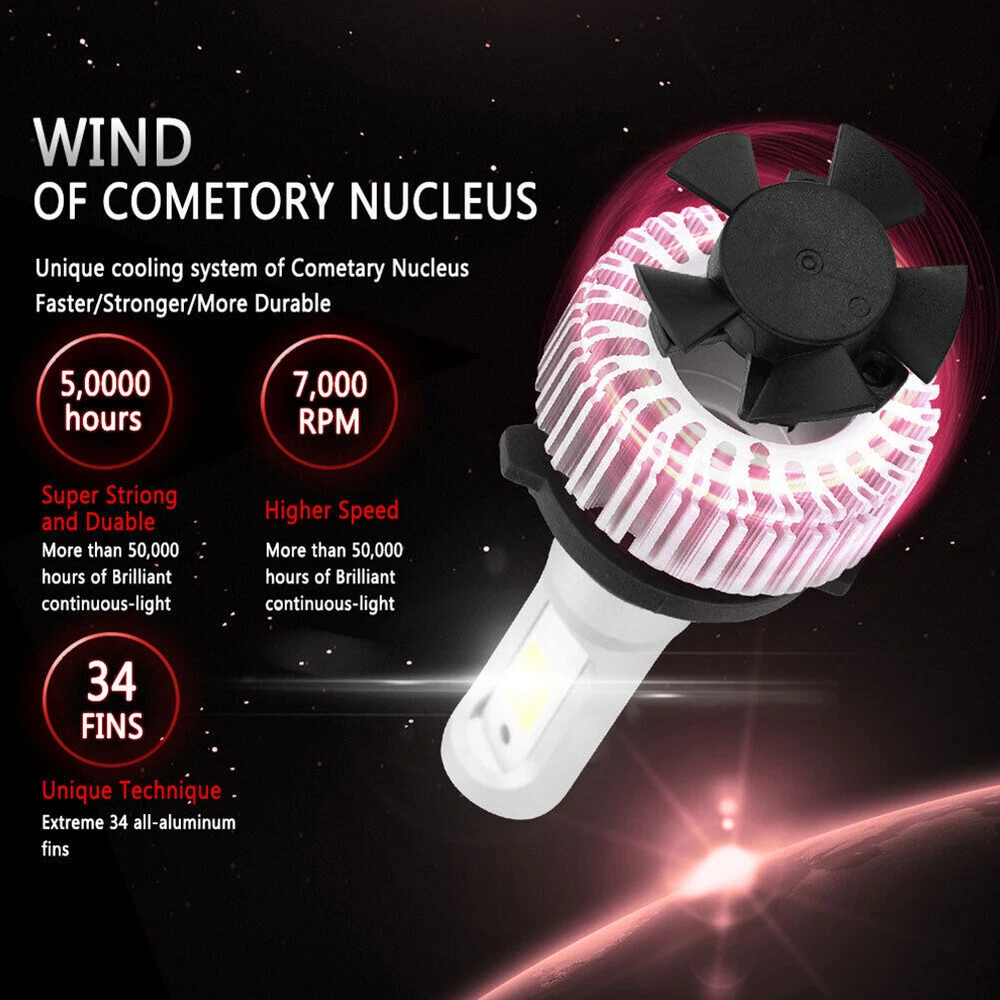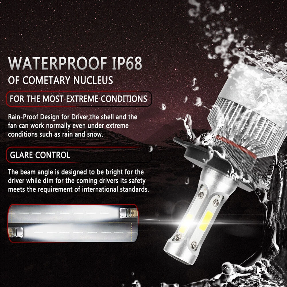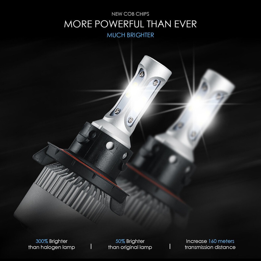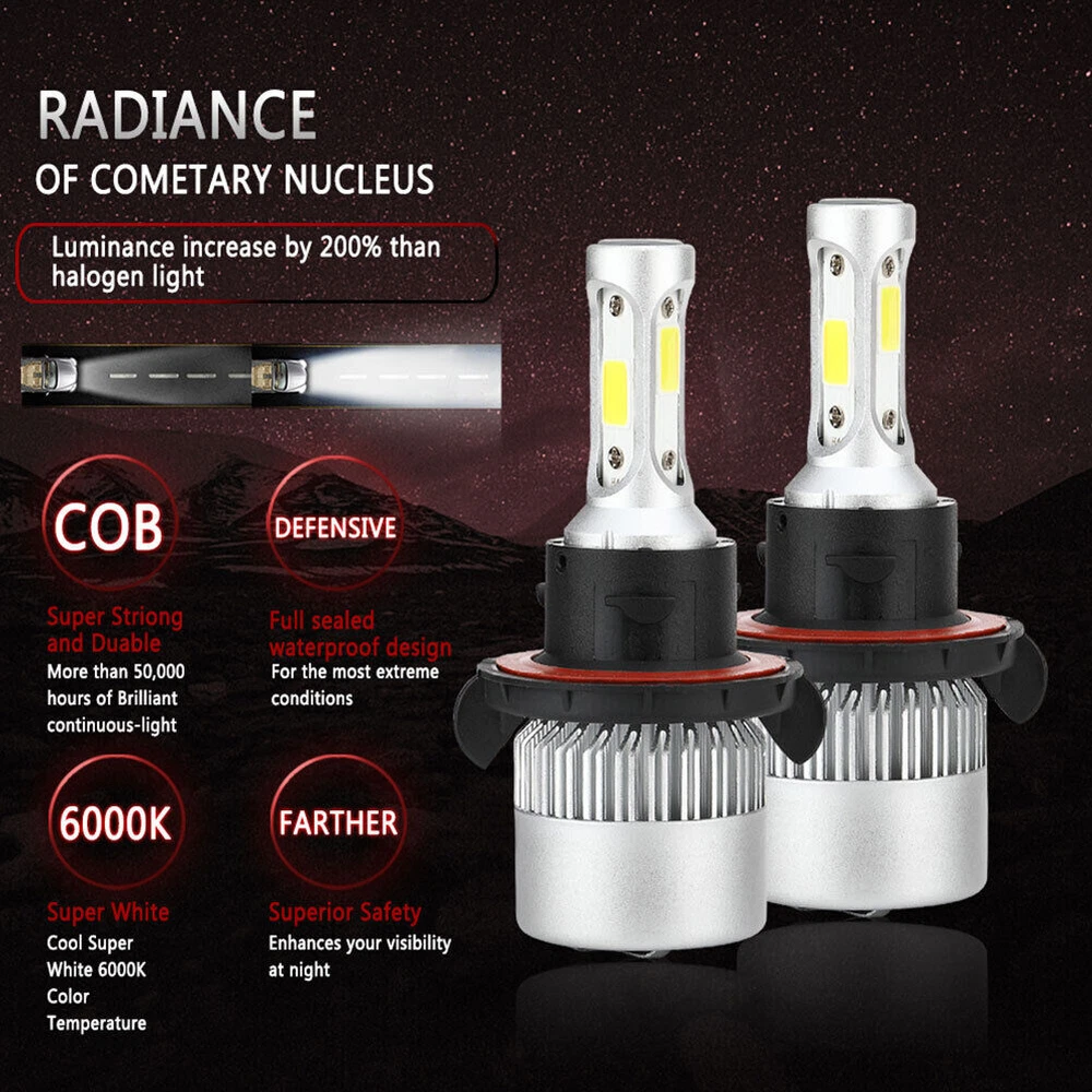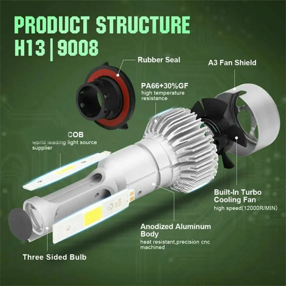H13(9008) + H13(9008) + 9145 Specifications 1. Light Type : H13(9008) + H13(9008) + 9145 2. Input Power : 100W/set (50W/bulb) 3. LED Type : COB LED Chips 4. Luminous Flux : approx.12000lm/set (6000lm/bulb) 5. Operating Voltage : DC 9V-32V (fits 12V/24V vehicle) 6. Color Temperature : Cool White 6000K 7. IP Rate : IP65 8. Operating Temperature : (-40C) to (+80C) 9. Material : Aviation 6063 Aluminum Profile 10. Life-Span : 50,000Hrs+ 11. Lamp base designed : Turbo designed 12. Installation : Plug and Play 13. Beam Angle : 360° 14. Warranty: 1 Years Warranty Package Content: 6pc led Bulb H13(9008) + H13(9008) + 9145