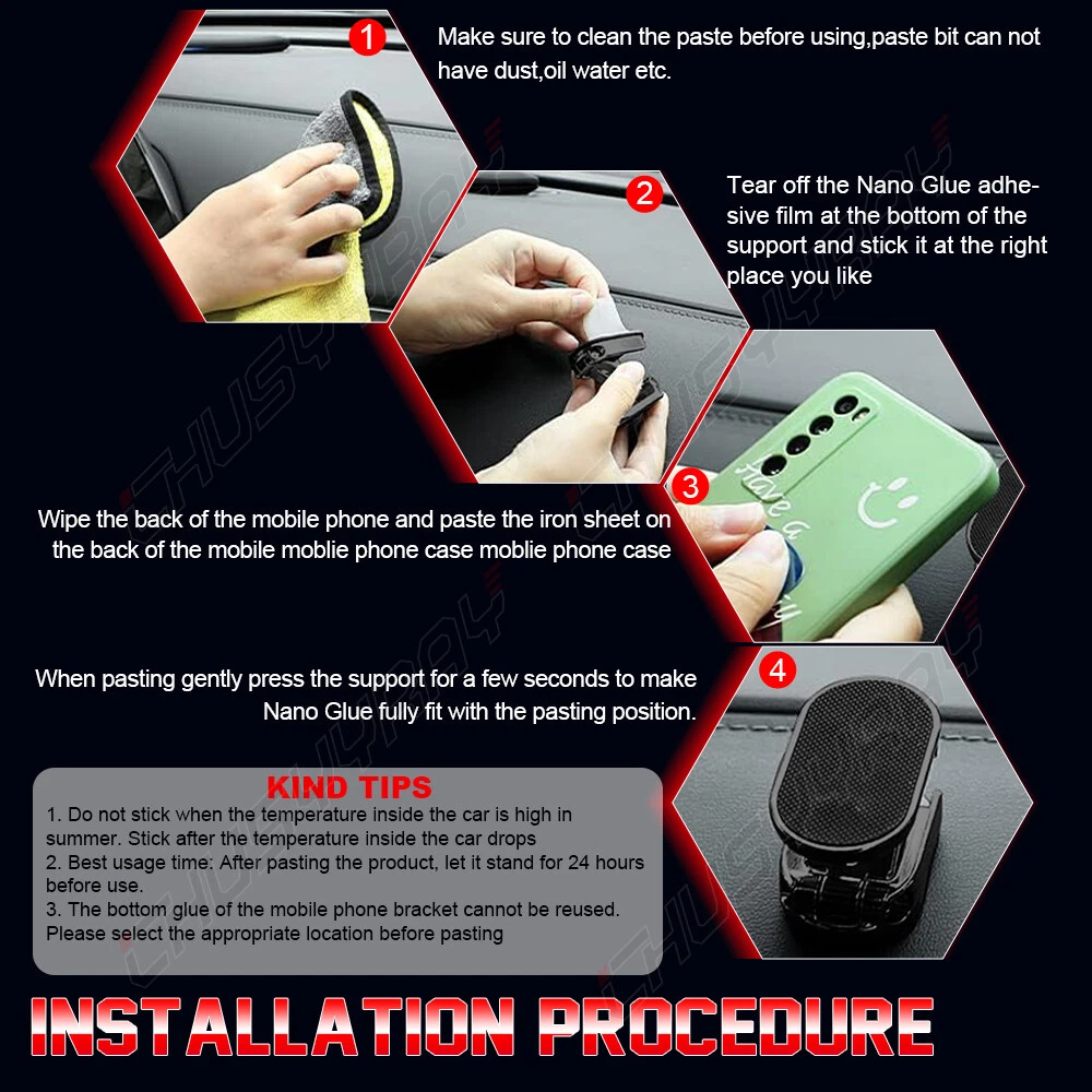1-Pack Magnetic Car Dashboard Mount Holder Stand With Metal Plate For Cell Mobile Phone GPS Product Features: · Compatible with Most Smart Phones, Mobile Cell Phone, GPS, PDA Devices · 100% Brand New and High Quality · Permanent Magnet Magnetic, High-grade Aluminum Alloy Decorative Outer Ring · 360 Degree Rotation, Suitable for Various Fields . · Easy to Mount and Release on Car Dashboard. Super Suction, Single-handed Access. · Place on Any Flat Surface and it Keeps your Cell Phone/GPS in Perfect Position for a Hands-free Phone Call, Navigation, Make your Driving Easily · 2Pieces Strong Powerful Magnet Inside the Mount, Support Most Cell Phone, GPS with No Problems · Rubber Grip on Magnetic Surface Offers Extra Protection · Mini Size, Made of Stainless Steel, Cool Appearance and High Quality, Never Waste the Space · Color: Black. Package Includes: 2* Magnetic Car Mount Holders 2* Metal Plates 1* Strong Double Sided Tape How to Use: Open the Package. There is One Magnetic Holder, One Round Metal Plate, and One round double-sided adhesive sticker. Peel off the Sticker from the Metal Plate and Stick it to the Cellphone, Apply Pressure for 60 seconds .Then Peel off the Sticker from round double-sided sticker and place it on back (non-magnetic side) of the Magnetic Holder. Apply the Pressure for 60 Seconds. Locate a FLAT and SMOOTH surface. Now peel off the film from the magnetic mount sticker and place down firmly to the location where you are installing to. After Mounting, Do not Use it for a Few Hours to Allow the Adhesive to Set Firmly. Do not use any Additional Adhesive. The Magnetic Holder is Ready for Use Now!!! Note: Metal plate may interfere with wireless charging (for devices such as iPhone 8, iPhone X, S8, S7/ S6/ Note 5, Nexus 6P/ 5X/ 6). Remove the metal plate before using a wireless charger. Attach metal plate directly to the back of thicker phone cases to avoid interference with magnetic attachment.