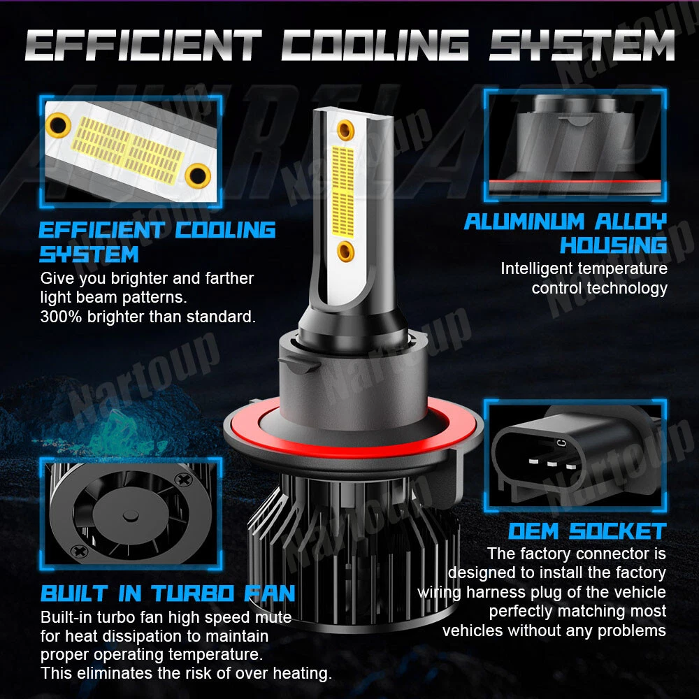 NOTES: Compatible list can not show up all car model,it is only for reference. It may exist someting error for some car model because of the car upgradtion and car modification. So please make 100% sure before you purchase. Otherwise, we are not responsibe for this, thanks for your cooperations! Professional installation is highly recommended if you have any difficult in installation. 1. Please check the size of your bulbs on your vehicle before purchasing. 2. Please make sure the headlight housing has enough space for installation before purchasing. LED Headlight Bulb Specifications: ---Model:H13/9008 ---light Source Model: LED Chip,2-side leds,super bright ---Power: 200w/Set ---Lumen: 20000LM/Set ---Operating voltage:DC 9-32V ( Fit 12V,24V Vehicle ) ---Beam Type:High beam & Low beam ---Beam Angle:360° ---Color Temperature: 6000K-6500K Cool White ---Lifespan:over 50000h ---Working Temperature: -40-+80 Centigrade ---Waterproof rate: IP 68 ---Plug for this listing: H13/9008 Plug High Low Beam LED Headlight Bulbs Kit ---Connector Type:Plug and Play ---Application: LED Headlights Headlamp Lamp Bulbs High and Low Beam LED Fog Light Bulb Specifications: Color: Super Bright 6000K-6500K Xenon white Bulb socket: 5202/2504/12276/H16 360 degrees illumination Heat resistant, prevent overheat problem Operating Voltage: 12-24V DC Wattage: 100W Actual Lumen: 10000 lm Voltage: DC 12-24V (fit 12V, 24V vehicles) Heat resistant, prevent overheat problem Easy installation, just plug and play, no polarity problem Much longer work life than halogen lights, approximately up to 50,000 hours Packed Include: 2 x H13/9008 LED Headlights Bulbs 2 x H16/5202/2504/12276 LED Fog Light Bulbs New and old packaging will be shipped randomly Features: ---High-power chips, ultra-thin board shape design makes the installation and fit better, the illumination is more uniform, and avoids the disadvantages of poor illumination width caused by the point light source; Our Lights suitable for use with 12-32V voltage. Our Lights has the characteristics of light diffusivity, wide-angle illumination and high lumen; ---The LED has high luminous purity, no need for lampshade filtering, and the light wavelength error is within 5 nanometers ---There is no delay when the LED lights up, while the traditional tungsten bulb has a delay of 0.3 seconds. ---LED has low power consumption. When it reaches the same brightness of traditional bulbs, it consumes only 6% of traditional bulbs, and it also saves electricity and fuel! ---It has a long life, its filament-free structure does not generate heat, and it can be used for more than 5 years under normal conditions ---LED car lights can make the vehicle control circuit not easy to oxidize, with a maximum load current of 0.1A. LED headlight advantages: ---LED lamps are more energy and power than conventional halogen lamps. The brightness is close to the xenon lamp, but the LED lights are illuminated without delay to enhance road safety. Instantly start without strong current impact, improve battery life by more than 30%. ---Fast cooling , using the most advanced, heat-dissipating structural design. The power driver adopts a wide voltage constant current mode which has a simple structure, so that the automobile can flexibly cope with various voltage unstable conditions, and has achieved the purpose of less component damage. Compared to HID ballast maintenance, The repair probability is very low which is less than 80%. ---Low heating temperature, The working temperature of helium can reach 800°-1000° ---LED headlight has a simple structure, and the parts are less than the xenon lamp, which is lower than the xenon lamp failure rate! ---Car LED headlight color temperature are balancing. Xenon bulbs are clear in the same color, about 6000K. Tip: Please ensure your vehicle equipped with factory xenon HID headlights This product will NOT work for halogen headlights or aftermarket HID headlights