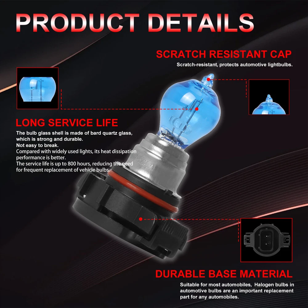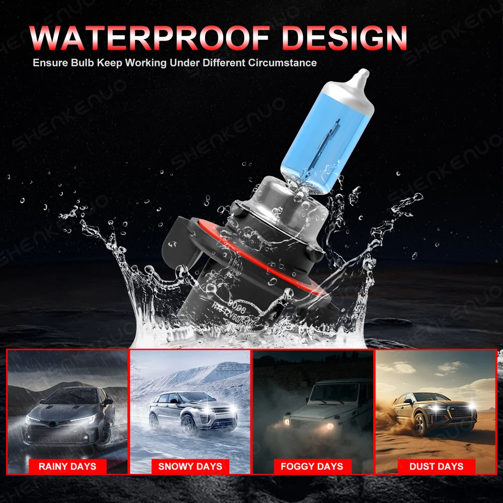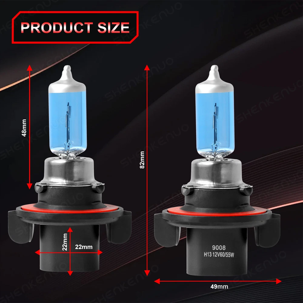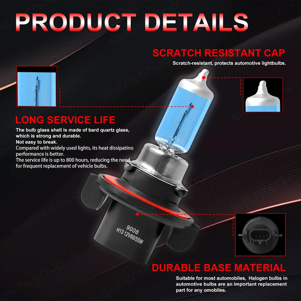 Manufacturer Part Number: SKN - H13 + 5202 Model: 9008/H13+5202 Halogen Bulbs Number of Bulbs: 4 Brand: SHENKENUO Lumens: 5000 lm Light Color: Warm White Country/Region of Manufacture: China Superseded Part Number: Replace Halogen Light Bulbs Suitable For: Fog Light, Headlight, High Beam, Low Beam Type: Light Bulb OE/OEM Part Number: DOES NOT APPLY Interchange Part Number: 9008/H13 High Low Beam+5202/PS24W Fog Light Bulb Fitment Code: H13 (9008) Placement on Vehicle: Front, Left, Right Voltage: 12 V Beam Angle: 360 degree Color Temperature: 4200K Wattage: 60/55W Lighting Technology: Halogen Fitment Type: Direct Replacement Manufacturer Warranty: 5 Years Bulb Life Hours: Up to 800 Hours (最长 800 小时) Features: Road Legal Sealed Housing: Dustproof and Waterproof