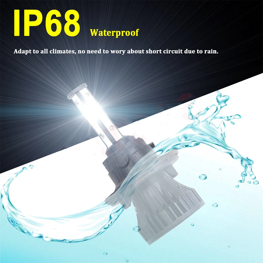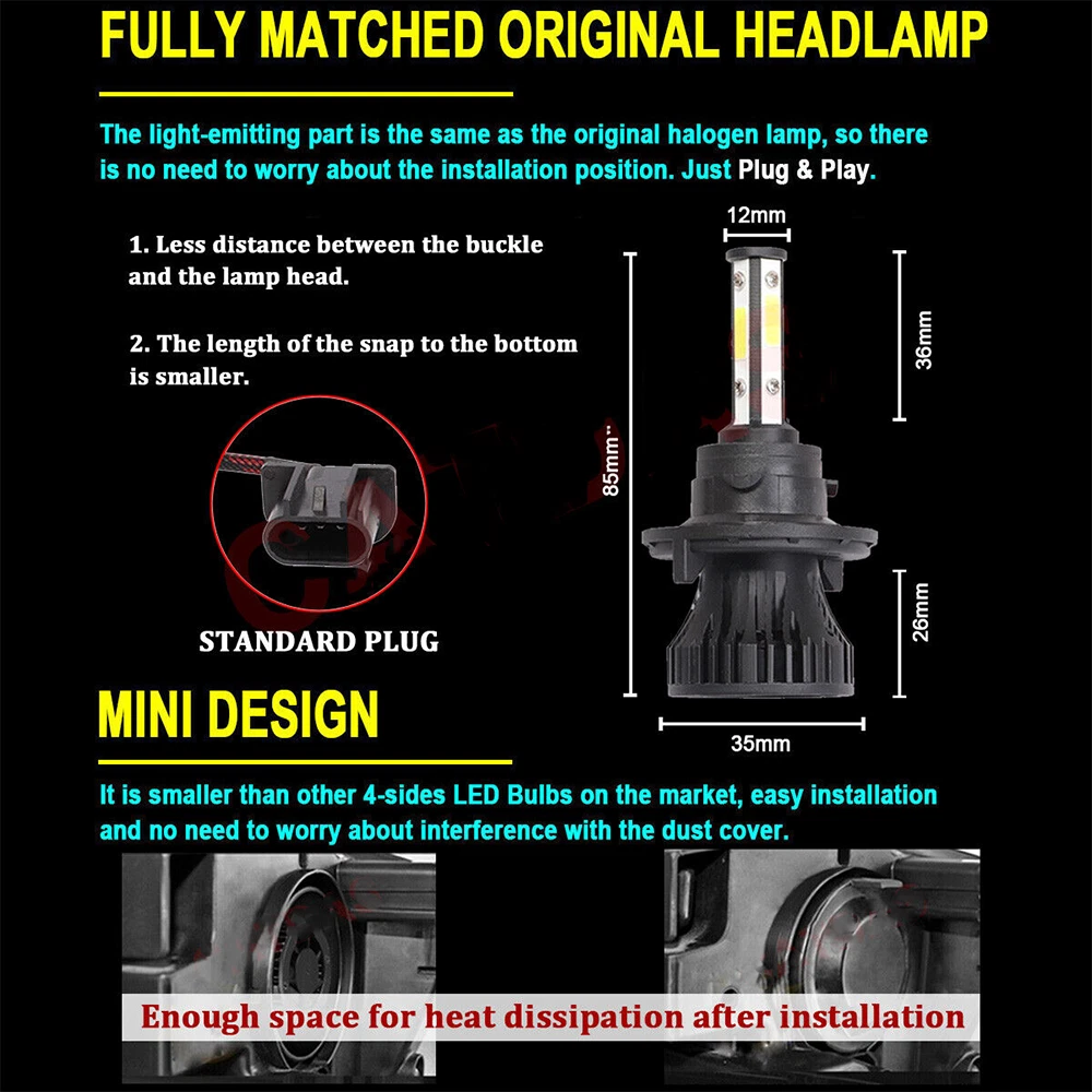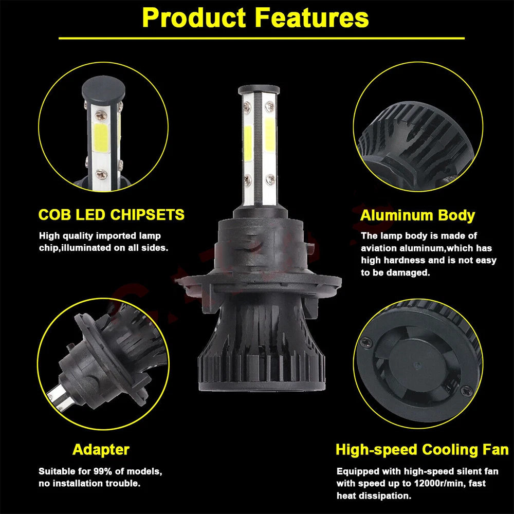 Note: ● Compatible List can not show up all Car model. Please confirm whether the item matches your car before you purchase. ● You also can send us your car informations (Maker, Model, Year), so we can find the right bulb size for you. This listing compatible with 2 pairs (9008/H13 + 5202/H16)6000K white super bright LED headlight high/low dual beam + fog light bulbs conversion kit. Headlight Bulbs Specifications: ● Bulb Socket: 9008 H13 ● LED Quantity(each bulb): 4pcs* COB chips (4-sides), 360 degree clear beam no blind zone ● Technology: Bulit in driver & cooling fan ● Connector(s): plug and play ● Operating Voltage: DC 9V ~ 32V , Fit for 12V & 24V vehicle. ● Wattage: 50W per bulb ● Luminous Flux: 20000 LM per set ● Color temperature: 6000K ● Light color: Cool White ● Material: Aviation 6063 aluminum profile ● Beam Angle: 360 degree ● Operating Temperature: -40 - +85 degree Celsius ● Waterproof Rate: IP68 rated Waterproof and dust seal, works well even in extreme weather ● Lifespan: over 50000 hours life time, stable quality and long service life ● Application: headlight high/low beam ● Built-in constant current CPU,instant full brightness without start-up relay ● Easy plug and play design, no resistor or modification needed. ● The bulb body size of our bulb is smaller than other 4-sided LED bulbs on the market, no need to worry about interference with the dust cover. Two-way heat dissipation channel: 1. All-in-one aluminum profile as heat conduction system, 360 degree heat radiating. 2.High speed mute fan(12000R/min), high air flow for faster cooling rate. Fog Light Bulbs Specifications: ● Bulb Size: 5202 H16 ● Color: 6000K Xenon White ● LED Quantiy: 10pcs Per Bulb ● LED Type: SMD LED High Power Chip ● Beam Type: 360° Beam Angle ● Operating Voltage: DC 9V ~ 32V , Fit for 12V & 24V vehicle. ● High Power: 50W/bulb ● Luminous Flux: 3200LM per set ● Material: Aaluminum profile and virtually unbreakable PMMA Lens ● Long-lasting Lifespan 50000 Hours ● Plug and Play Easy Installation ● Fast on/off Response Time and Vibration Resistant Package Include: ● 2x 9008 LED headlight bulbs ● 2x 5202 LED fog light bulbs On Nov 11, 2024 at 19:46:32 PST, seller added the following information: