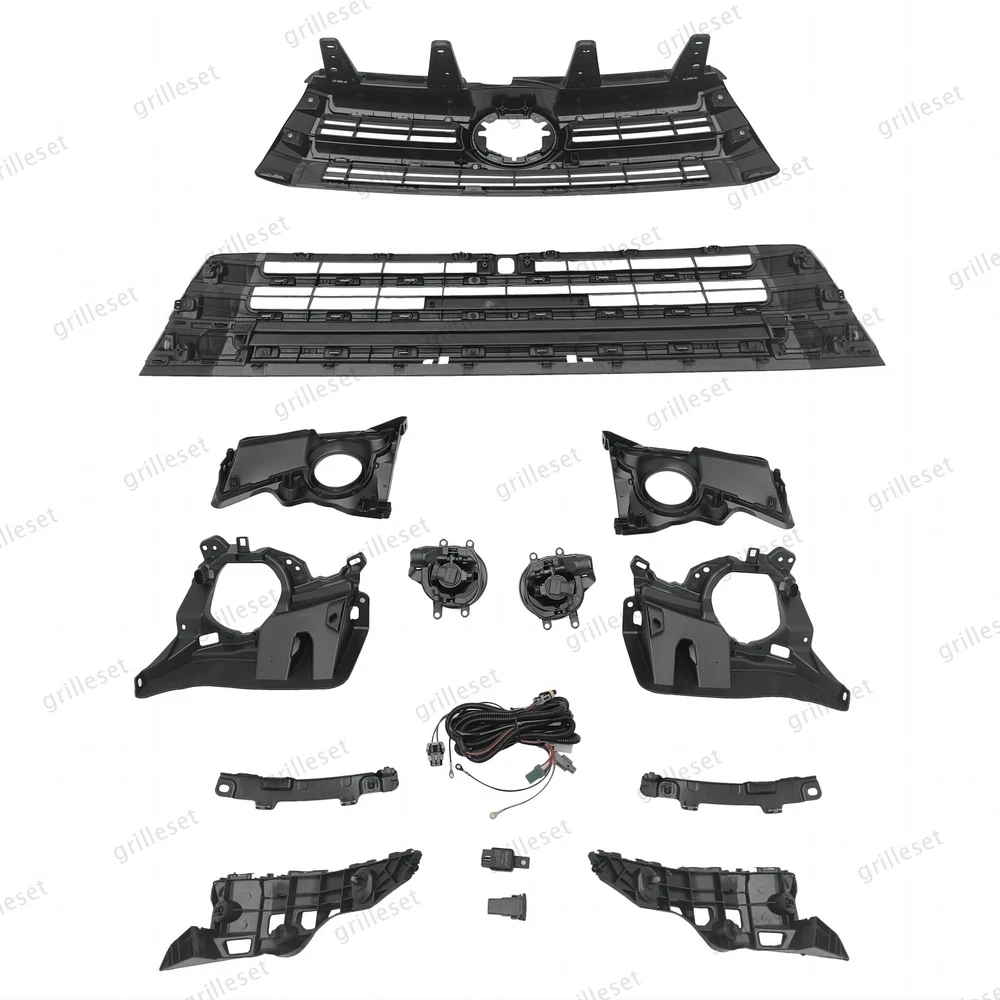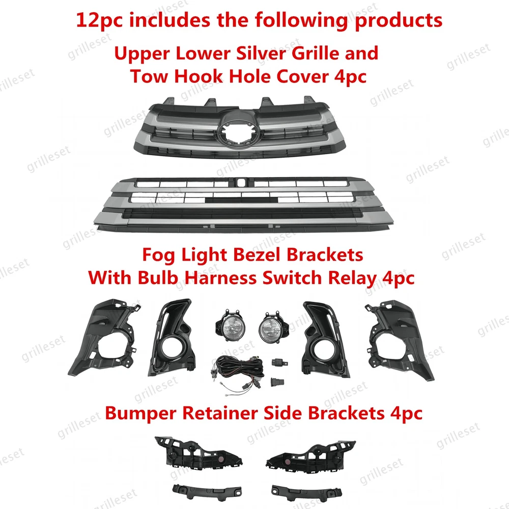 Fit for : 1 Set (12 PCS) Includes:(See more pictures for details) 1 Pc front upper gloss silver grille 1 Pc front lower gloss silver grille 2 Pcs front gloss silver tow hook hole cover 2 Pcs fog lights with bulb,switch,relay and Harness 2 Pcs fog light bezels 2 Pcs front bumper brackets 2 Pcs front bumper side brackets Item OE number : 53101-0E230;53102-0E070;53106-0E010;53105-0E010;52040-0E030;52030-0E030;81220-02160;81210-02160;52146-0E080;52145-0E080;52536-0E030;52535-0E050 Installation : Perfect fit direct replacement, no modifications required. Installation manual not provided; we recommend professional installation. Item's-Features : Superior quality kit 100% brand new Made from high-quality materials Excellent replacement part, no modifications needed Other parts fit for