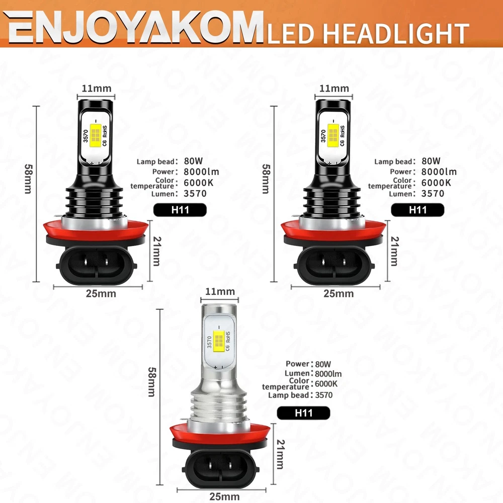 Superseded Part Number: Replacement Halogen Xenon Led Light Bulbs Size: the same as the car original light Wattage: 100W Voltage: 9V-36V Light Color: Cold White Universal Fitment: Yes To Fit: Headlight Model: LED Headlight Conversion Kit Lumens: 10000lm Lighting Technology: LED Bulb Fitment Code: H11/H9/H8 + H11/H9/H8+ H11/H9/H8/H16 Other Part Number: H11 high beam + H9 low beam + H11 Fog light gtin13: 865502472089 OE/OEM Part Number: 6000K LED Headlights Type: Headlight Kit EAN: Does not apply Chips Type: COB LED Chips, Super Bright Bulb Life Hours: Up to 50000 Hours Material: Aviation 6063 aluminum profile Fitment Type: Direct Replacement Performance Part: Yes Lighting Type: Specialty Head Light Bulb Brand: ENJOYAKOM Placement on Vehicle: Front, Left, Right Features: CAN bus Compatible, road Legal, Rust-Resistant Color Temperature: 6000K Manufacturer Warranty: 5 Year Ballast Included: Yes Number of Bulbs: 6 Vintage Part: Yes UPC: 865502472089 Interchange Part Number: H11 High beam + H11 Low beam+ H11 Fog light Suitable For: High Beam, Headlight, Low Beam, Fog Light Manufacturer Part Number: Mini-H11+H11+H11