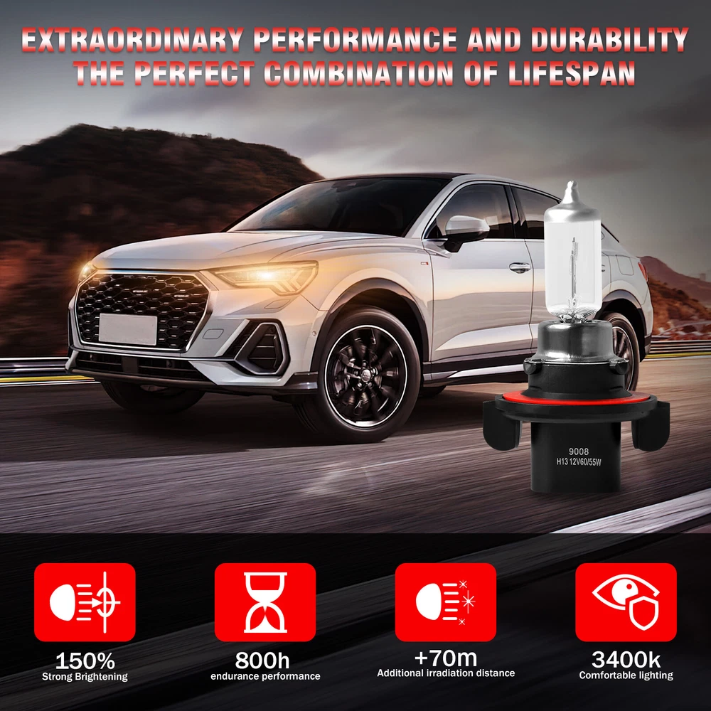 Specifications: • Bulb Socket: H13 9008 + 5202 PSX24W • Color Temperature: 3400K • Voltage(V): DC 12V • Working temperature: -40℃~+80℃ • Beam Angle: 360° • Waterproof Level: IP65 • Material: Aviation Aluminium • Super Long Service Life: ≥800 Hours • Warranty: 5 Year • Canbus Error Free: No. For most vehicles, just directly plug and play. Yet for some vehicles with CAN-BUS system, it may require install decoder or load resistor to avoid hyper flash or fast blinking. • Please Note: Please check your car manual or original bulb to confirm the bulb size, length is correct or not before purchasing to save your time. Package Included: • 2Pcs 9008/H13 Halogen Bulbs High and Low Beam • 2Pcs 5202/ PS24W Halogen Bulbs Fog Light ( Random shipment of new and old packaging ) Note: • Energy saving, environmental protection, Stable performance, through strict test, Use safer driving in the car • For most cars, just Plug-n-Play,no ballast required. Yet for some European vehicles or new vehicles, load resistors maybe required to avoid the error code or blinking. • When installing this bulb, please make sure to turn the car off, and key out. Bulbs are very easy to install. You just have to plug it in the socket. ( bulb has + AND -terminal. If it doesn't light up after inserting into the socket, all you need to do is insert it oppositely.) • The compatible vehicle list shows only partial cars due to the ebay limits, if your car plug is same with this bulb, the item will fit your car. • If you're not sure about it, please send us an ebay message and tell us your car year, make, model and the position you need to replace, we will help you check with it. • If you have a decoding problem or any other problems, please contact us first, we will help you with it. I'm a new seller, thanks a lot for your trust and convince! I will serve you with all my heart.