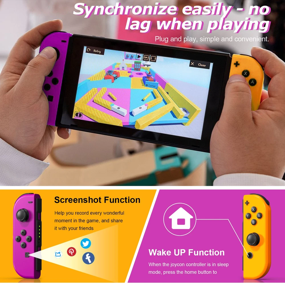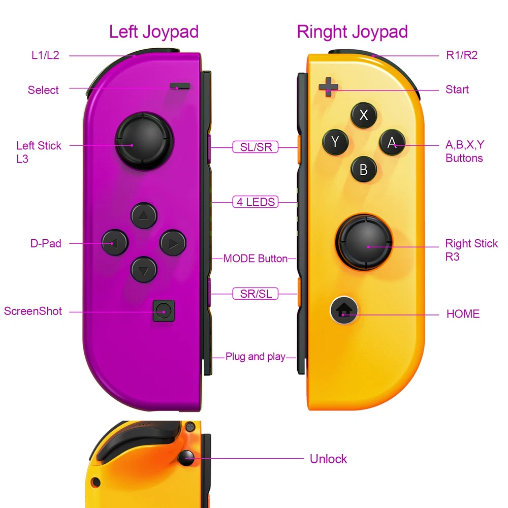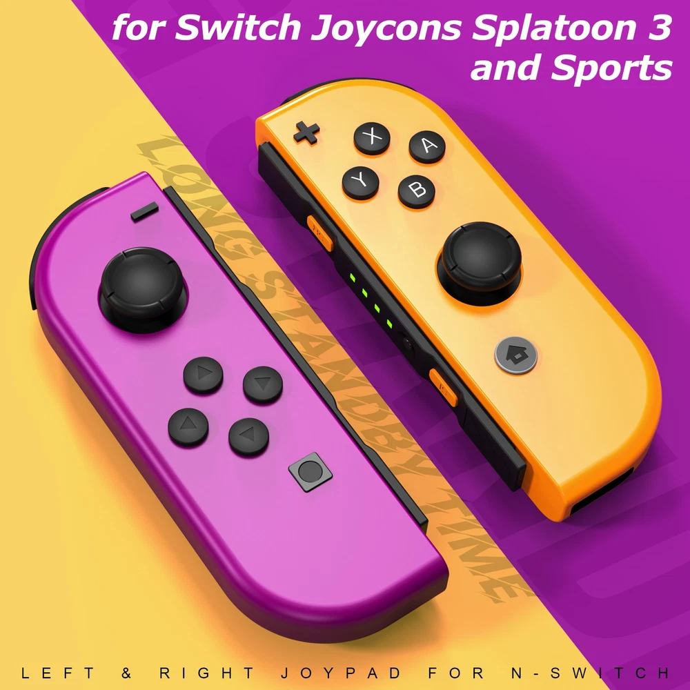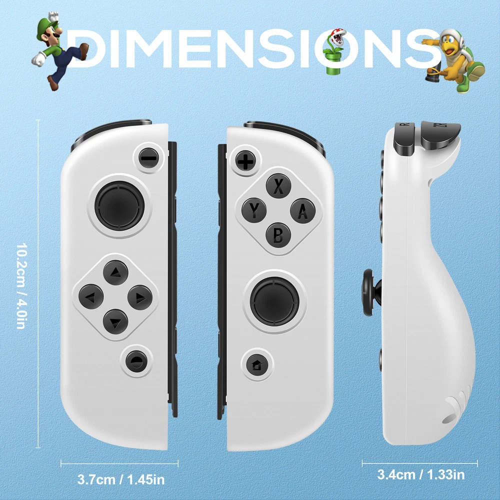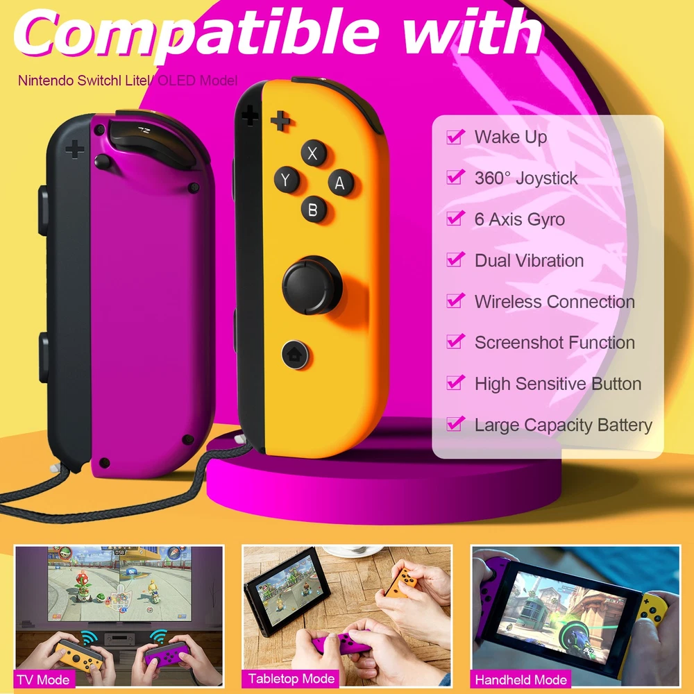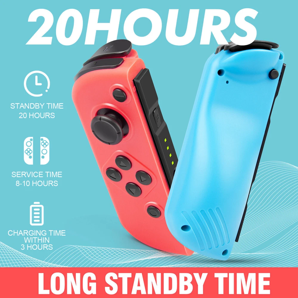 Multicolor For Nintendo Switch Wireless Controllers for Joycon Gamepad w/ Straps Pair Wireless Controller for Nintendo Switch for Switch Nintendo, Replacement for Nintendo Switch Controller, Compatible with Switch Controllers, Wireless Left and Right for Switch Nintendo, for Nintendo Switch Support Dual Vibration/ Wake-up/ Motion Control/ Screenshot 【Upgraded for Switch Nintendo】 The upgraded wireless left and right controller can replace For Nintendo switch controller, and fully compatible for Nintendo Switch/Lite/OLED console. High-performance wireless technology provides strong anti-interference and reliable signal, perfectly solves the problem of frequent dropouts and button unresponsiveness without latency and drift, providing you with smooth and enjoyable game time, Ideal replacement for switch controllers. 【Powerful Features & Real Gaming Experience】 As a replacement for Nintendo switch controller, controllers has 6-Axis gyro somatosensory and dual-motor vibration function excellent motion control and hand vibration shock response to provide real and stimulated gaming experience. Share your game with your friends through the screenshot function. When it is in sleep mode, press and hold the home button of the controllers for 1s~2s to wake up it. 【Easy to Use & Continuous Electricity】 The controllers is paired in the same way as the Nintendo switch controller, simply plug in the controller to use without any drivers. The left and right controllers can be used as a whole controller or as two independent controllers for switch. The single joypad controller has a built-in 500mAh lithium battery with a 2-3hour charge time and up to 18hours of use when fully charged, via a switch console or charging cradle. 【High Price–Performance Ratio】 The controllers is made of scratch-resistant, non-slip and durable high quality ABS material that ensures no fading. Each controller is equipped with a high-precision 360° joystick and a full set of buttons. After technical upgrades, the button life (number of presses) has reached the highest level in the industry, ensuring the long-lasting use of the controller, the skin-friendly rubber material significantly reduces finger fatigue during prolonged use. 【 Warm Tips & Services 】 Package includes: Left Controller * 1, Right Controller * 1 OR Left Controller * 1, Right Controller * 1 , Wirst Strap * 1 Wireless Pro Controller Gamepad Joypad Remote Joystick for Nintendo Switch/Switch Lite/Switch oled(Black) Features: [Flexible & Fluid Movement] The 360 Degree Rotatable Joysticks give you more control of how slowly you can move around or how aggressively you’re steering. 360 degree movement in games like dark souls and first person shooters provide you with a full range of movement in all possible directions [Dual Vibration Feedback] Asymmetric vibrating motor brings you different levels of vibration, including headshots, explosion, and collision, like you are right there in the battlefield. [Layout] The controller offers two analog sticks, a D-pad, 4 main action buttons on the face (A,B,X,Y), start, back, TURBO button, two shoulder triggers, and two smaller shoulder bumpers [Long Battery Life] The wireless game controller is rated for about 6- 8 hours of continuous play. If you do run low, simply plug the controller to power supply without needing to replace the battery [Wide Compatibility] 2.4G Wireless Game Controller works with PC running Windows XP/7/8/8.1/10, PS3 and Android 4.0 or above phone supporting OTG and tablet. iPhone and Mac computer are not supported. [Comfortable Gameplay for Long Sessions] Textured grip not only makes it more pleasant to hold the controller, but it is also much more stable in your hands New trouble shoot steps: Does not provide smooth action in the game.single interrupt 1. Plug the wireless receiver into another free USB 2.0 port 2. Press HOME Button for 5 seconds to force it to connect. 3. Move other wireless devices far away to reduce interference, such as Wifi router (Change a channel if the router is hard to move away) TURBO function: 1. The action keys include (A/B/X/Y/L/ZL/R/ZR) 8 keys, all of which can manually set the TURBO function; 2. Manual burst setting: Press one or several action keys at will, and then tap the TURBO button to turn on the manual burst function; 3. Automatic burst setting: Press the action button that has turned on the burst function again, and press the TURBO button again to turn on the automatic burst function; 4. Press and hold any action key for the third time and press the TURBO key to clear the burst function of this key; 5. Press "-" and the cross key "Down" at the same time to clear all burst functions 5V 2.6A Charger Material: ABS Input Power : 100-240V AC Output Power: 5V 2.6A Power: 12W / Frequency: 50/60HZ USB Interface: Type-C plug Plug Style: US Plug Fit for: For Nintendo Switch, Other Type-C tip product Will not work for the Nintendo Switch Dock and TV mode 4in1 Controller LED Light Charger Dock 7 Colors LED Switch Joy-Con Charging Station for Nintendo Switch/Switch OLED, Switch Controller Charger Dock Switch Joy-Con Charging Stand with LED Indicator Feature: 【4-IN-1 Charger】:This Switch Joy-Con Charging Dock designed for Nintendo Switch/Switch OLED. Available to charge 4 Joy-Con Controllers simultaneously, save time and increase efficiency. (Joycon Controllers NOT Included) 【Security Protection】:The Switch Joy-Con charging station built-in protection chip is with over-charge, over-voltage, over-Current, over circuit protection functions, more reliable and safer. 【Easy to Use】:Easy slide in design allows each controller JoyCon to be easily attached to the Switch charger. The corresonding LED indicator turn red when charging, and turn green when fully charged/standby. 【7 Colors LED】: This Joycon charger stand has individual transparent light bar, which can show beautiful effect of 7 different colors of light by touching the switch on. 【Sav