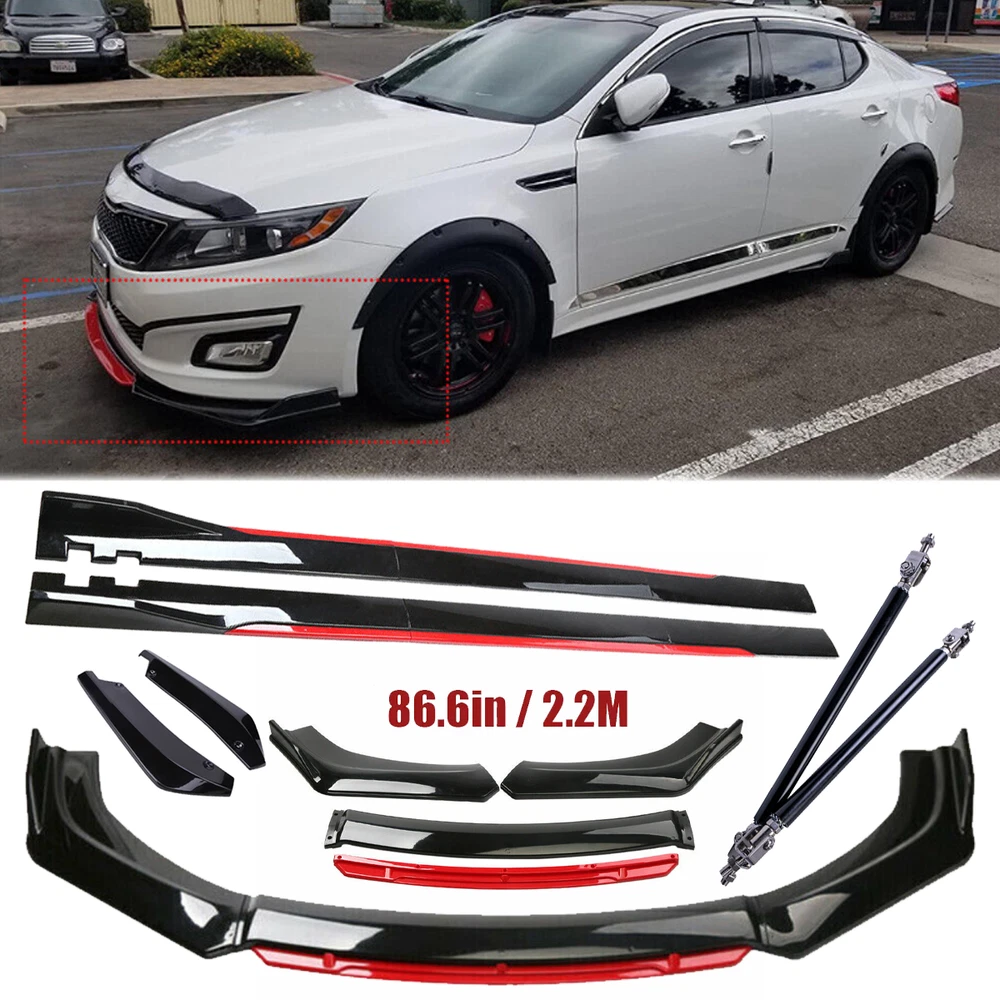 ackage 1. Front Bumper Lip Spoiler Splitter(5pcs) This front bumper lip splitter is fit for most models with front bumper size around 1750mm~1950mm. Feature: -Direct Fit. -Easy install and durable use. -Great quality and great Fitment. -Correct Connector No cutting or splicing. -Strict quality control standards to Build and test. -It'll give you a sporty look without making it too aggressive. -Light in weight and enduring, different optical line comes from different points of view. *Instruction Not Included, Professional Installation Is Highly Recommended.* Specification: -Type:Front Lip Chin Bumper Body Kit -Material:ABS -Color: Glossy Black +Red (as pictures show) -Placement on Vehicle:Front;;Lower -Fitment Type:Performance/Custom This front bumper lip body kit is suitable for most small cars and simple. And the flanks on both sides can be adjusted to make it more suitable for the width of the front of your car. Package 2. 2 x 86.6" Side Skirt Extension ( 6pcs ) Specification: Condition: 100% Brand New and High Quality Type: Car Body Side Skirts Material: Made of high quality PP plastic, Durable Color: Glossy Black +Red (as pictures show) Side Skirt Length: 86.6in / 2.2M Position: Side Skirt Extension Features: Universal modified side skirt for car sedan. While the side skirts don't affect the front ground clearance too much, it enhances the side extension of the in a very pure and exciting way. A Perfect Aftermarket Replacement. Professional Installation Is Highly Recommended. Package Included 3 Rear Lip Specification: Condition: 100% Brand New and High Quality Type: Car Body Rear Lip Material: Made of high quality PP plastic, Durable Color: Glossy Black (as pictures show) Surface Finish: Glossy Black Style Rear Lip Size:48cm/19“ Placement on Vehicle: Left, Right Package Included 4 2pcs Splitter Rods Material: premium quality aluminum alloy The length can be adjustable from 8" to 11" Fitment: Universal Note: Require drilling holes into the bumper lip diffuser to attach safely to the vehicle. Package Includes: 4 pcs /set Front Lip Chin Bumper Body Kits 2 x Side Skirts 2 x Rear Lip 2 X Splitter Strut Rods 1 x Screws kit Note: Installation instruction is not included, professional installation is recommended. Please allow 1-3CM differs due to manual measurement.