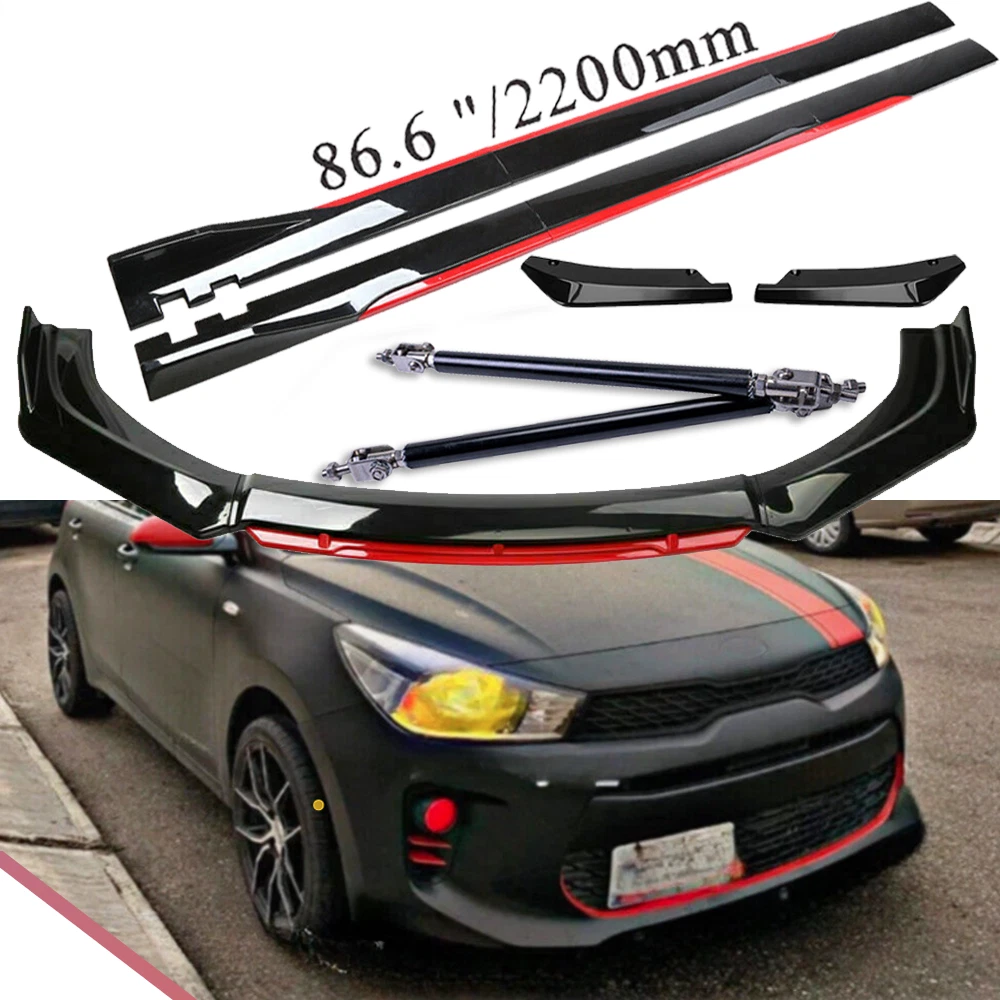ackage 1. Front Bumper Lip Spoiler Splitter(5pcs) This front bumper lip splitter is fit for most models with front bumper size around 1750mm~1950mm. Feature: -Direct Fit. -Easy install and durable use. -Great quality and great Fitment. -Correct Connector No cutting or splicing. -Strict quality control standards to Build and test. -It'll give you a sporty look without making it too aggressive. -Light in weight and enduring, different optical line comes from different points of view. *Instruction Not Included, Professional Installation Is Highly Recommended.* Specification: -Type:Front Lip Chin Bumper Body Kit -Material:ABS -Color: Glossy Black +Red (as pictures show) -Placement on Vehicle:Front;;Lower -Fitment Type:Performance/Custom This front bumper lip body kit is suitable for most small cars and simple. And the flanks on both sides can be adjusted to make it more suitable for the width of the front of your car. Package 2. 2 x 86.6" Side Skirt Extension ( 6pcs ) Specification: Condition: 100% Brand New and High Quality Type: Car Body Side Skirts Material: Made of high quality PP plastic, Durable Color: Glossy Black +Red (as pictures show) Side Skirt Length: 86.6in / 2.2M Position: Side Skirt Extension Features: Universal modified side skirt for car sedan. While the side skirts don't affect the front ground clearance too much, it enhances the side extension of the in a very pure and exciting way. A Perfect Aftermarket Replacement. Professional Installation Is Highly Recommended. Package Included 3 Rear Lip Specification: Condition: 100% Brand New and High Quality Type: Car Body Rear Lip Material: Made of high quality PP plastic, Durable Color: Glossy Black (as pictures show) Surface Finish: Glossy Black Style Rear Lip Size:48cm/19“ Placement on Vehicle: Left, Right Package Included 4 2pcs Splitter Rods Material: premium quality aluminum alloy The length can be adjustable from 8" to 11" Fitment: Universal Note: Require drilling holes into the bumper lip diffuser to attach safely to the vehicle. Package Includes: 4 pcs /set Front Lip Chin Bumper Body Kits 2 x Side Skirts 2 x Rear Lip 2 X Splitter Strut Rods 1 x Screws kit Note: Installation instruction is not included, professional installation is recommended. Please allow 1-3CM differs due to manual measurement.