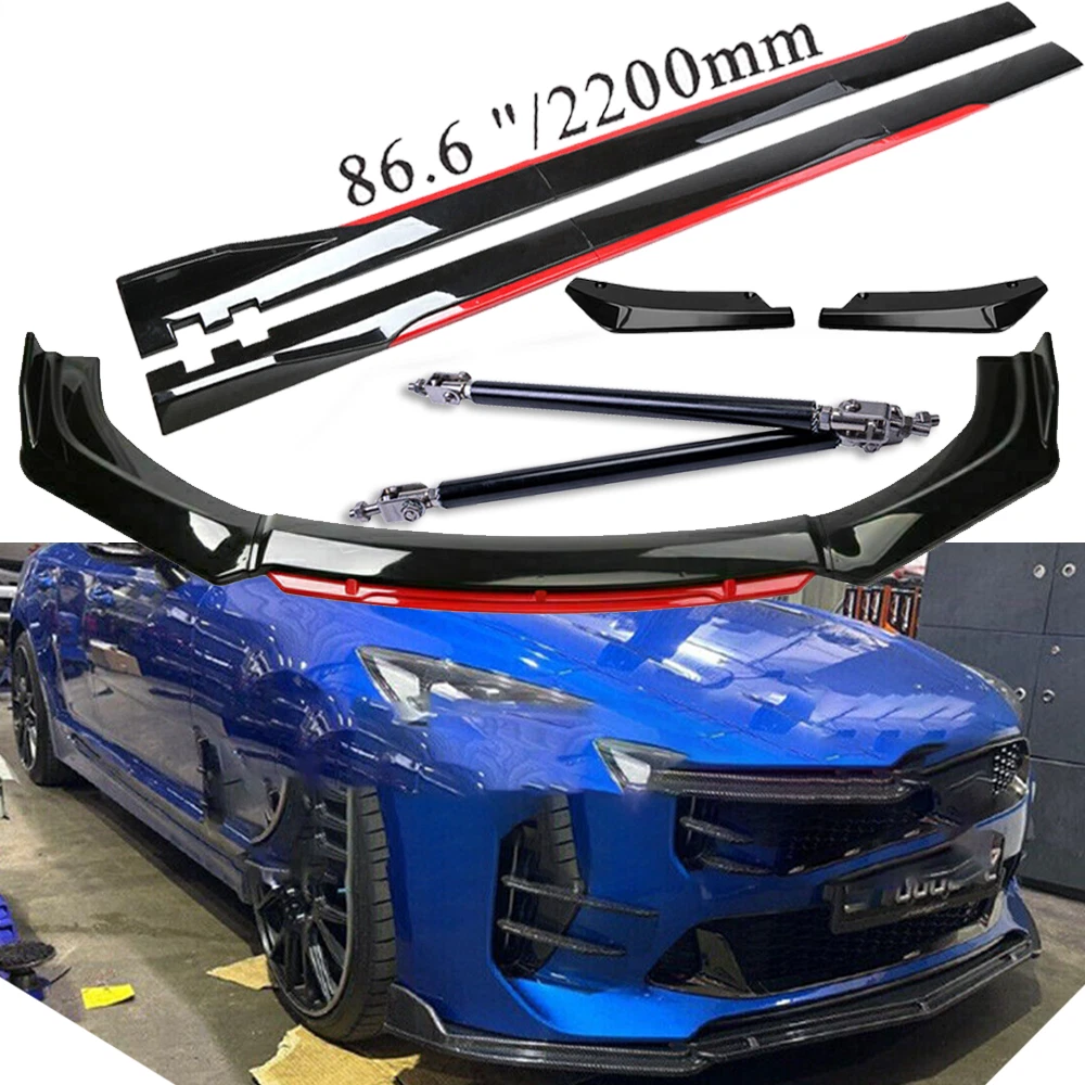 ackage 1. Front Bumper Lip Spoiler Splitter(5pcs) This front bumper lip splitter is fit for most models with front bumper size around 1750mm~1950mm. Feature: -Direct Fit. -Easy install and durable use. -Great quality and great Fitment. -Correct Connector No cutting or splicing. -Strict quality control standards to Build and test. -It'll give you a sporty look without making it too aggressive. -Light in weight and enduring, different optical line comes from different points of view. *Instruction Not Included, Professional Installation Is Highly Recommended.* Specification: -Type:Front Lip Chin Bumper Body Kit -Material:ABS -Color: Glossy Black +Red (as pictures show) -Placement on Vehicle:Front;;Lower -Fitment Type:Performance/Custom This front bumper lip body kit is suitable for most small cars and simple. And the flanks on both sides can be adjusted to make it more suitable for the width of the front of your car. Package 2. 2 x 86.6" Side Skirt Extension ( 6pcs ) Specification: Condition: 100% Brand New and High Quality Type: Car Body Side Skirts Material: Made of high quality PP plastic, Durable Color: Glossy Black +Red (as pictures show) Side Skirt Length: 86.6in / 2.2M Position: Side Skirt Extension Features: Universal modified side skirt for car sedan. While the side skirts don't affect the front ground clearance too much, it enhances the side extension of the in a very pure and exciting way. A Perfect Aftermarket Replacement. Professional Installation Is Highly Recommended. Package Included 3 Rear Lip Specification: Condition: 100% Brand New and High Quality Type: Car Body Rear Lip Material: Made of high quality PP plastic, Durable Color: Glossy Black (as pictures show) Surface Finish: Glossy Black Style Rear Lip Size:48cm/19“ Placement on Vehicle: Left, Right Package Included 4 2pcs Splitter Rods Material: premium quality aluminum alloy The length can be adjustable from 8" to 11" Fitment: Universal Note: Require drilling holes into the bumper lip diffuser to attach safely to the vehicle. Package Includes: 4 pcs /set Front Lip Chin Bumper Body Kits 2 x Side Skirts 2 x Rear Lip 2 X Splitter Strut Rods 1 x Screws kit Note: Installation instruction is not included, professional installation is recommended. Please allow 1-3CM differs due to manual measurement.