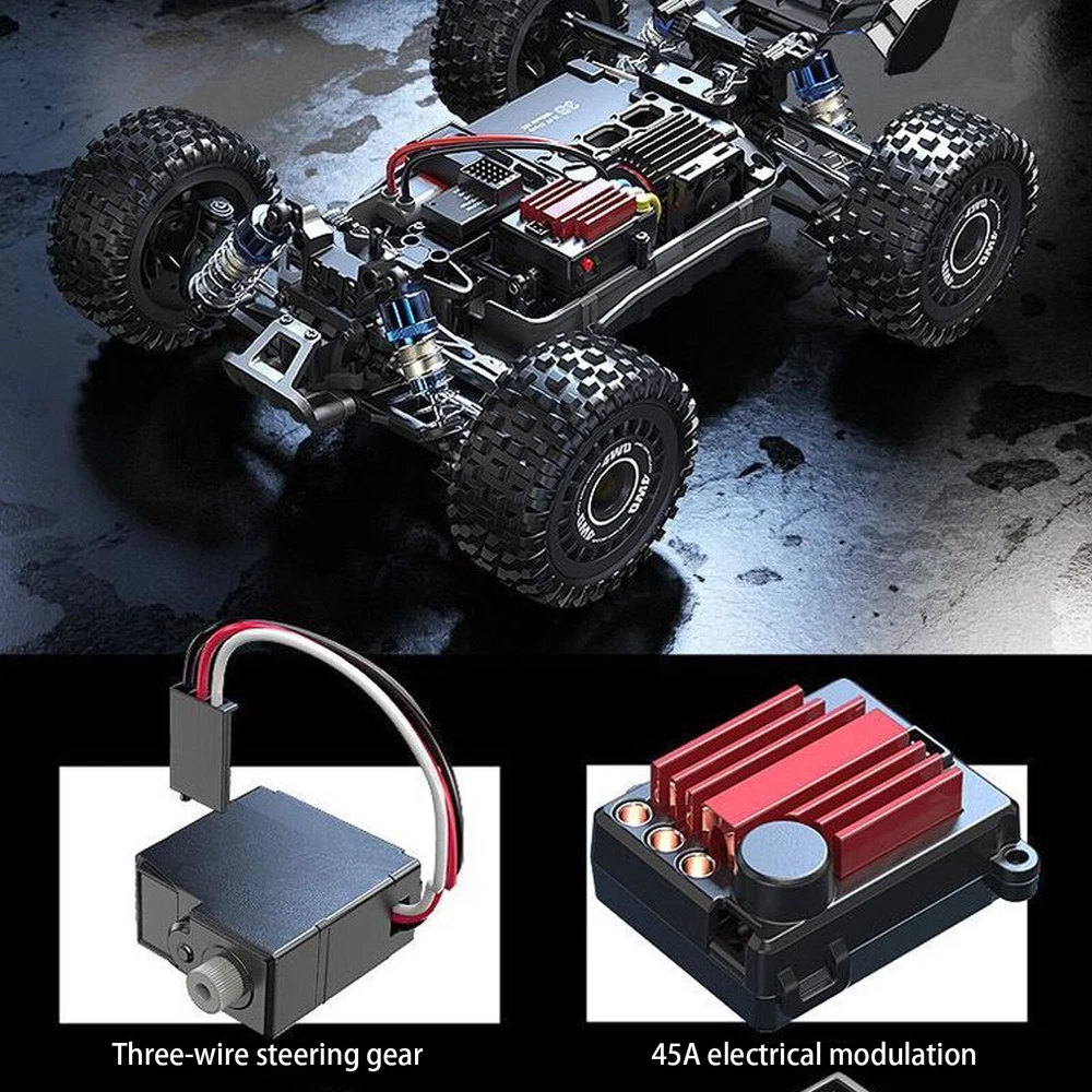 Features: 1. All-metal hydraulic shock absorber; 2. Standard 3S battery 65km/h 3. 45A independent brushless ESC + 2845 four-pole brushless motor; 4. Metal anti-collision head; 5. All-metal transmission system (metal gear differential); 6. Standard independent receiver, easy to modify. " Basic parameters : Product model : 16207 body color : blue Scale : 1/16 Maximum speed : 62km/h Remote control distance : 45m Maximum use time : 12.5min Charging time : 3h (using 5V 2A charger) Charging method : USB charging cable Wheelbase (mm) : 175mm Wheel base (mm) : 182mm Tire diameter (mm) : 77mm Vehicle weight : 1030g configure: Motor Specifications : Brushless Motor Motor cooling aluminum heat sink + fan ESC 45A brushless ESC (metal heat sink) Servo specification : 17g digital servo Remote control : 2.4G Remote control battery : AA*2 Battery Specifications : 11.1V 1050mAh 25C packing list: Car body (remote control)*1 battery*1; rear wing*1; Manual*1; USB charging cable*1; Hexagon wrench*1; Head-up wheel accessories*1; Screwdriver*1