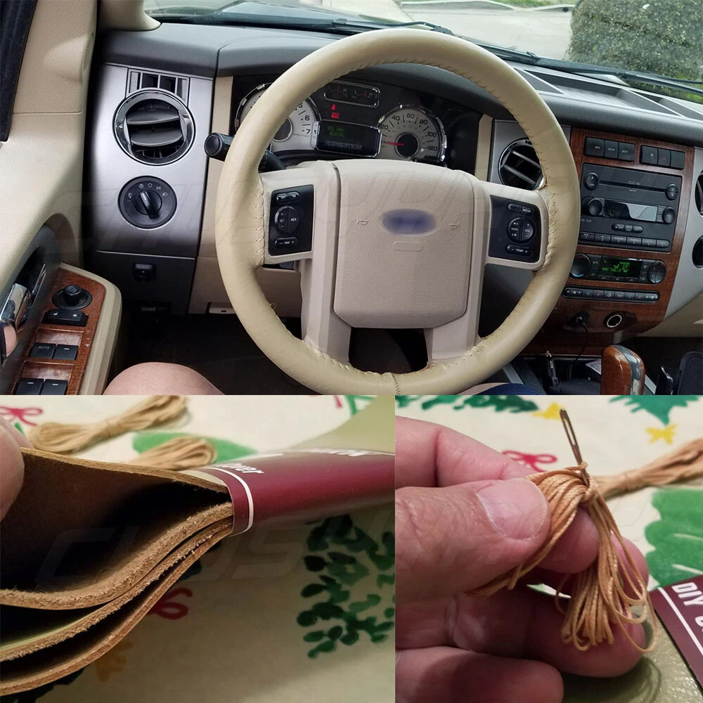 If the product is not suitable or there is a quality problem, please contact our customer service directly to solve the problem. We will give you a satisfactory solution. Brand New and Never been Used Color: Fashion Beige with Needle Elegance and Luxury Design, Fashion and Practical Combination Top Quality Soft Touch Leather, add Comfort, Safty and Protection for your Journey Ergonomic Design Provides Excellent Grip, Skidproof with Tyre Pattern and dotted Design Comfortable Hand Feel, massage your Palm to Relieve Drive Fatigue, Suitable for all Season Easy to Install Description: Steering Wheel Outer Diameter: 37-38cm(14.5"-15") cover size: 38cm(L) x 10.5cm(W) Compatible:Almost 90% car models with 37-38CM outside diameter steering wheel Item included: Steering wheel cover *1 Thread and needle tool set *1 Color: Beige Condition: 100% new (The picture and the actual product have some color difference, the actual color shall prevail in kind) Features: 1.Sewing it by yourself with thread and needle,enjoy DIY pleasure! 2.Provide extra comfortable feeling all round steering wheel. 3.Offer unique decoration for your car 4.No unpleasant smell. 5.No quarantine/customs problem. The package has: 1 leather steering wheel cover 2 needles 2 ties On Jan 23, 2025 at 00:49:46 PST, seller added the following information: