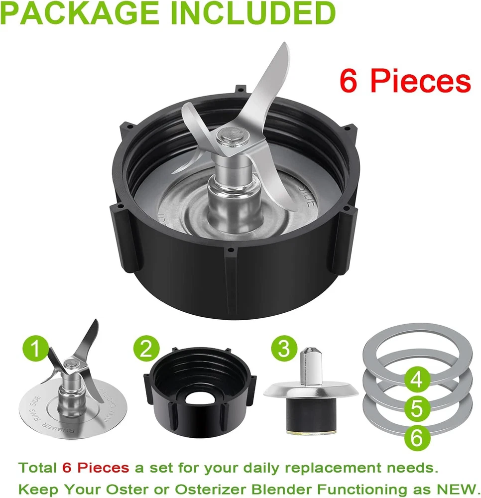 For Oster Blender Replacement Parts 6 Pieces with Gasket Rubber Seal Ring... 【Material】-- Food-grade Stainless Steel+ Plastic Silicone Rubber Ring. 【Compatibility】-- The blender parts for Oster / Osterizer fit most 5 & 6 cup glass or plastic jars. NOT Compatible with Oster Pro, Master, In2uitive Series, Versa or Xpert models. 【Ensure Your Blender Performs Like New】 -- With the 4-point stainless steel design, the blender cutter can blend and chop ingredients with ease, ensuring that your Oster or Osterizer blender runs smoothly and powerfully for years to come. Plus, the cuchilla licuadora is dishwasher safe for effortless cleaning, and it comes with 5 x blender sealing rings to make maintenance a breeze. 【Package Included】-- 1 x 4-point blender blade replacement, 1 x blender jar base bottom, 3 x rubber o-ring, 1x Coupling Stud Slinger Pin. Total 6 pieces a set for your Oster or Osterizer blender replacement parts. Shipping We offer FREE shipping on all orders! We ship within Three business days of payment, usually sooner. We use a selection of shipping services such as UPS, FedEx, USPS etc. We only ship to the lower 48 states, no APO/FPO addresses or PO Boxes allowed. Local pickups and combined shipping options are not provided at this time. Return You can return a product for up to 30 days from the date you purchased it. Any product you return must be in the same condition you received it and in the original packaging. Please keep the receipt. Customer satisfaction is very important to us. If you have any problem with your order, please contact us and we will do our best to make you satisfied. Contact Us If you have any queries, please contact us via ebay. We usually respond within 24 hours on weekdays. Please visit our eBay store to check out other items for sale! Thank you for shopping at our store.