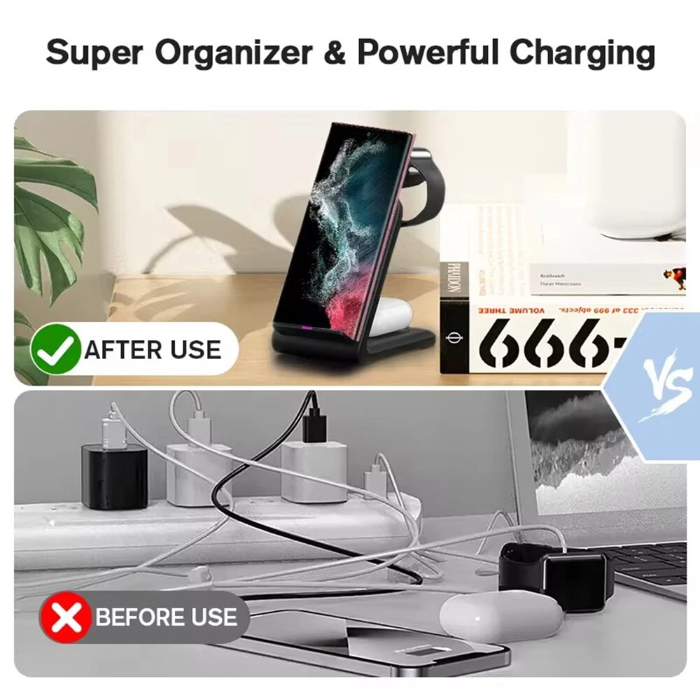 Picture Gallery Description Features: The 3-IN1 wireless charger is specifically designed for charging Samsung devices. Adopting a dual charging coil design, the new 2024 three in one wireless charging station can provide a more stable charging experience without intermittent charging or overheating caused by mismatches. Improved charging speed and eliminated the hassle of finding the "best location". The wireless mobile phone charger provides temperature control and voltage protection to prevent short circuits. The back of the charger is equipped with ventilation holes to ensure safe and stable charging. This wireless charger is certified, providing you with a dual guarantee and dual safety experience. The anti slip silicone pads on the base and bottom can protect your device from scratches and slipping during charging. 【 Compatible with Samsung 】 Suitable for Samsung Galaxy Z Fold 5/4/3/Z Flip 5/4/3 phones, For W23/W22/W21, For Galaxy S23 S22 S21 S20/Super/Plus/FE, For S10/S10e/S10+/S9/S9+, For Note 20/10/9/8, For Galaxy Watch 6/6 Classic/5 Professional/5/4 Classic/3/Active2/1. For Galaxy Buds/Pro/Buds+/Buds2/Live。 (Note: Not applicable to Apple Watch or other brands of watches). Specifications: *Product Name: 3 IN1 Wireless Charger *Mobile output: 5W/7.5W/10W/15W/30W *Watch output: 5W (maximum) *Earphone output: 5W (maximum) *Transmission distance: ≤ 6MM *Charging efficiency: ≥ 73% *Product Material: ABS *Product color: Black/White Package List: 1 * 3-in-1 wireless charger 1 * Type-C cable 1 * User Manual Attention: For a fast charging experience, please use the QC 3.0 power adapter (excluding QC 3.0 adapter). Shipping Policy Payment Policy Return Policy Shipping Policy 1. We only ship to confirmed PayPal addresses. 2. Economy Shipping, with no tracking number. Standard Shipping, with tracking number. Express (Expedited) Shipping, with tracking number. 3. Economy shipping needs 2-5 weeks to arrive mostly. In rare case, it can take up to 6-8 weeks. It depends on your location and local postal service, as well as the weather condition along the shipping. 4. If you need a faster delivery time, you could choose Express (Expedited) Shipping. If you need a tracking number, you could choose Standard Shipping. Payment Policy We accept PayPal only. We only ship item to your PayPal verified address. Please pay attention that import duties, taxes and charges are not included in the item price or shipping charges. These charges are the buyer's responsibility. Please check with your country's customs office to determine what these additional costs will be prior to bidding/buying. Return Policy 1. We offer 60 day money back or replacement guarantee. In addition, it allows customers to return new and unused products in their original factory condition for any reason within 60 days from the date of purchase. 2. Although we test each item and they are packed professionally, few item (less than 0.1%) might be damaged during the shipping. Please feel free to contact us within 4 days after you receive your package about replacement. 3. If you don't receive items over 35 days, please make sure to contact us before leaving any neutral or negative feedback. We'll try our best to help you solve the problem. If we authorized the return, customers will get an email with instructions for returning the item. Email will be replied within 24 hours on Chinese business hours. On Jan 25, 2025 at 11:02:14 PST, seller added the following information: