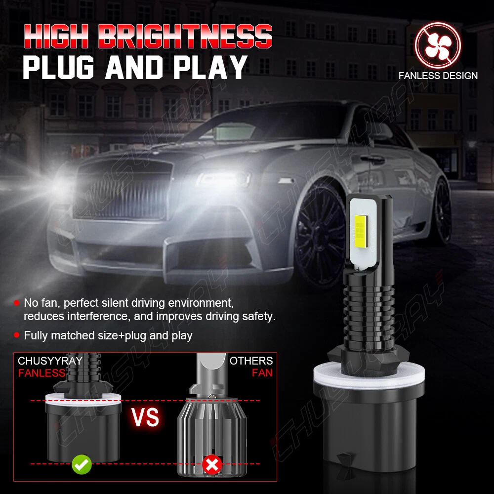 Headlight: Plug Type: 9005/HB3 + 9006/HB4,High Beam + Low Beam chips type: 2-sided CSP chips Wattage: 100W Hight luminous efficacy Flux:10000LM/Pair Color Temperature: White 6000K Waterproof: Aviation 6063 aluminum profile Operating Temperature: -40-+150 degree Celsius Voltage:9V to 32V NEW Mini Hi-Low Beam headlight conversion kit Description: 💎 High brightness: The latest CSP with 6000K cold white chip; 500% brighter than the existing halogen headlights. 💎Simple Installation: Installation only takes 10 minutes. There is no relay. There is no capacitor. No additional wiring. Plug and play. 💎IP67 waterproof: using integrated radiator and aluminium body self-cooling, waterproof and heat-proof. Even in extreme cases, the enclosure of the rainproof driver can work properly. Automatic short circuit protection. Fog Light: Voltage: DC12V Wattage: 80W/bulb LED Quantiy: 2-sided CSP chips Brightness: 8000Lumens Life span: 50,000hrs Mail color: Black Shell. Socket: 880,893,881,881L,881X,889,862,894,894X,896,898,886,888, etc. Application: Fog light, DRL( daytimerunning light) Installation: plug and play Package Included: 4pcs 9005+9006 Headlight Bulbs 2Pcs 880 Fog Bulbs Boxes are shipped randomly Install Caution 1. As a safety precaution, make sure that the car has had time to cool down properly before starting the installation process. 2. Put the vehicle into park or make sure it is securely in gear. 3. Make sure to have the ignition turned off and the keys removed. 4. Be careful to avoid burns, especially when turning on or off the vehicles lighting. 5. Be careful to avoid crushing or cutting the bulbs. Also make sure to not touch the bulbs with your fingers, as this will cause blotting. 6. Fully examine the connection of the contact points, ports and the wires as faulty connections can cause lighting problems. 7. Make certain that the end of the bulb does not come in contact with the interior light shield of the headlight when adjusting the bulb. 8.Please install car headlight dust cover to ensure the normal operation of the lamp (to prevent dust and small ribbons to reduce the chances of bulb cooling fan broken to ensure the normal operation of the cooling system). Information: a)Compatible List can not show up all Car model. Please check the Correct item size of your vechicle. it will work and fit.Thank you! b)If you are unsure the item fit or not , please do remember send message to tell us your car make, model, year and other information which is helpful to check the item fit or not. For example: For 2004 Ford F150, high/low beam For 2015 RAM 1500 with projector-type, high beam For 2019 Ford F150 ,XL Crew Cab Pickup 4-Door 2.7L