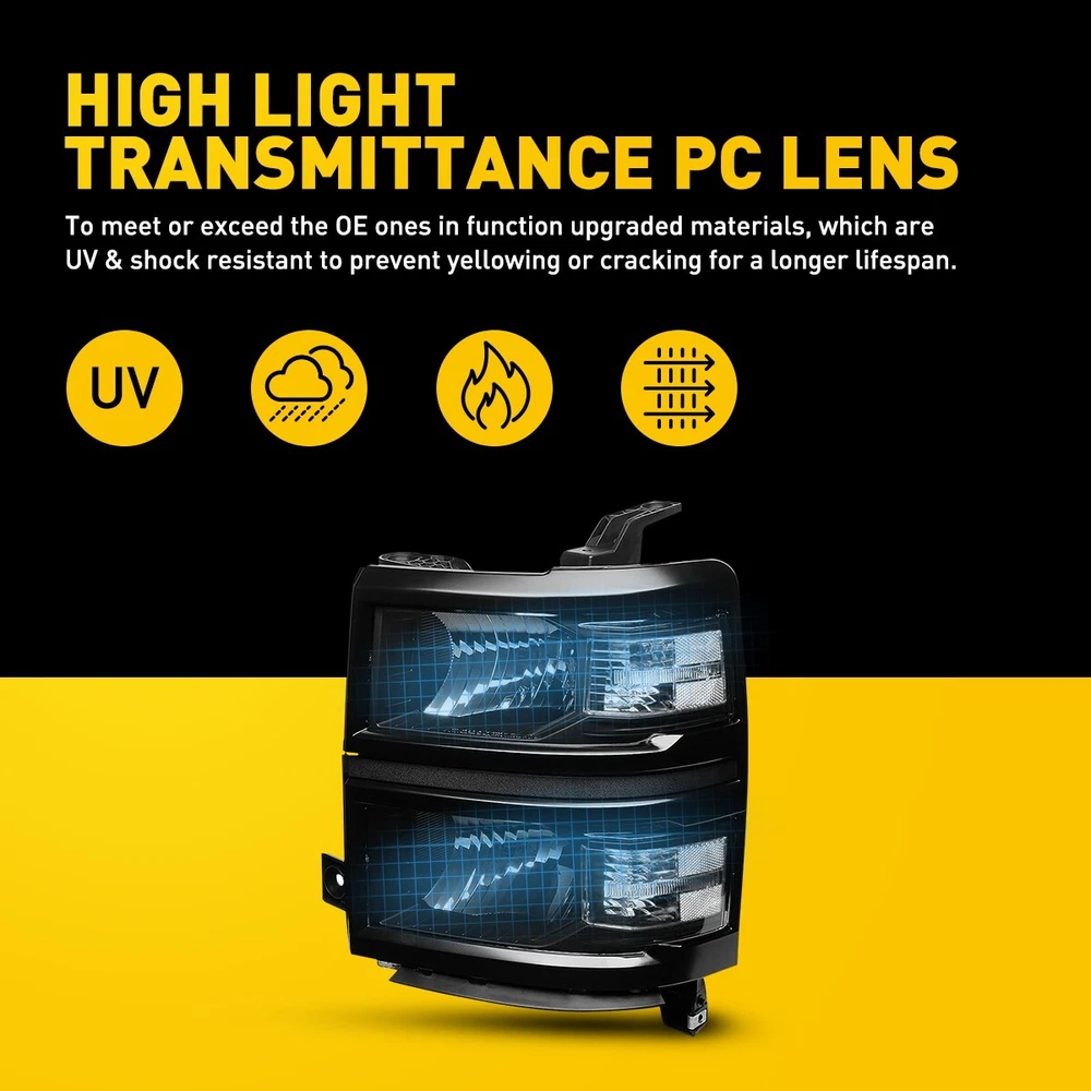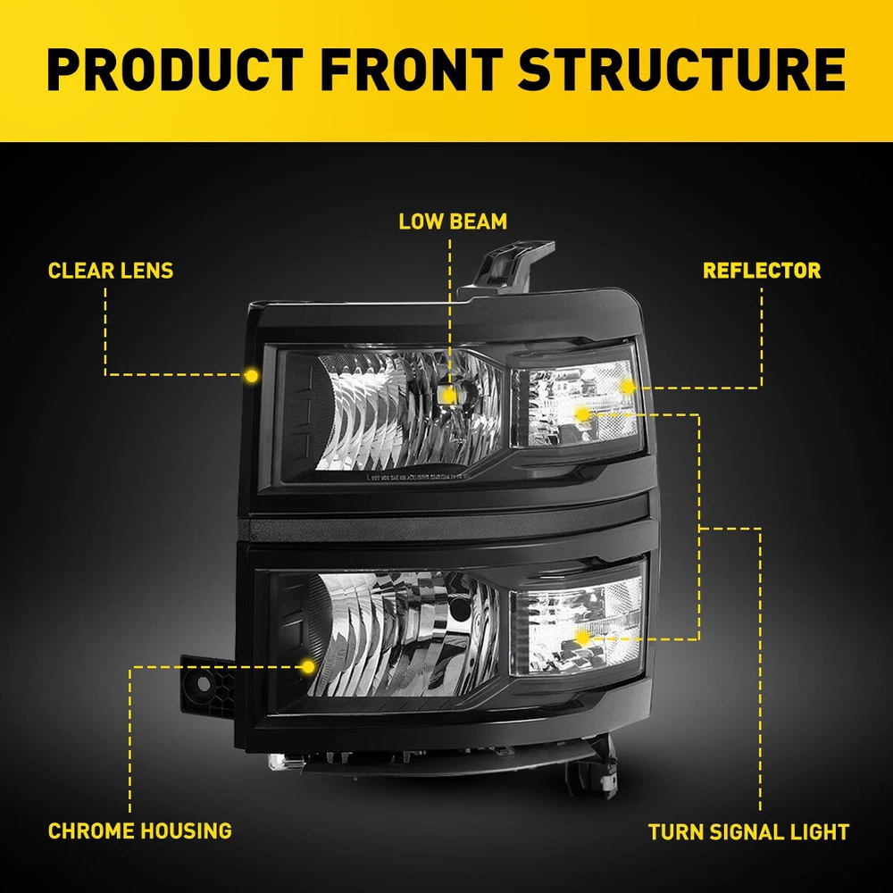 Headlights Headlamps Fit For 2014-2015 Chevy Silverado 1500 models only Fit for: 2014-2015 Chevy Silverado 1500 Models Only (Fit 2014 New Body Style Models Only; Does NOT Fit HD Models) Specifications: OE number: 20933724, 20933725, 20933722, 20933723, 23172782, 23172783 GM2502389, GM2503389, GM2502395, GM2503395, GM2502410 Material: ABS+PC (ABS Plastic Housing/Polycarbonate lens) Appearance color: 1.Housing Color: Black 2.Lens Color:Clear 3.Reflector Color:White Note: Projector ×(Not include) DRL ×( Not Include) For Silverado 1500 2014-2015 Chevy Factory Style Headlights Headlamps Pair L+R Headlights Headlamps Fit For 2014-2015 Chevy Silverado 1500 models only Fit for: 2014-2015 Chevy Silverado 1500 Models Only (Fit 2014 New Body Style Models Only; Does NOT Fit HD Models) Specifications: OE number: 20933724, 20933725, 20933722, 20933723, 23172782, 23172783 GM2502389, GM2503389, GM2502395, GM2503395, GM2502410 Material: ABS+PC (ABS Plastic Housing/Polycarbonate lens) Appearance color: 1.Housing Color: Black 2.Lens Color:Clear 3.Reflector Color:White Note: Projector ×(Not include) DRL ×( Not Include) Bulb × (Not include) Features: *Easy to install: Direct replacement, drilling and cutting are not required. *Superior quality: Made of ABS and PC materials with toughness and heat resistance functions to ensure its long service life and durability. *Angle adjustment: Equipped with a headlamp Angle adjustment knob, you can adjust the best Angle of view through the knob. *Suggestion: 1.Please confirm the OE number before purchasing!!! 2.Professional installation is required!!! Packaging include: Headlights*2(Left+Right) Item Specifics Mounting Style Screws Bulbs Included No Fitment Type Direct Replacement Items Included Driver & Passenger Side Headlgihts Manufacturer Part Number DDZC-SILVERADO-14-15-BC-EOOH Material ABS Plastic / Polycarbonate Lens Superseded Part Number SDD-HLOHCSIL14BKCL1 Placement on Vehicle Front, Left, Right California Prop 65 Warning This product contains chemicals known to the State. Brand AUXITO Bulb Shape Code 9005 High / H11 Low Beam Type Headlight Assembly Interchange Part Number 20933724 20933725 20933722 20933723 23172782 23172783 2014 2015 Parking Light 7443 OE/OEM Part Number GM2502389 GM2503389 GM2502395 GM2503395 GM2502410 Housing Color Black Style OE Features Reflector Housing Lens Color Clear Lens / Clear Reflector Turn Signal 7443A Lighting Technology Halogen Payment Returns DESCRIPTION PAYMENT SHIPPING RETURN POLICY CONTACT US Shop Category Store Home LED Headlight ◈ H4 ◈ H13 LED Reverse Light ◈ T15/921/W16W LED License Plate Light LED Side Marker Light Car Parts & Accessories Tail Light assemblies Other Hot Item Picture New List Item 4PC Smoked Lens LED Front Side Lamp Marker White For 2003-09 Dodge Ram 2500 3500 USD 15.99 For 2016-2018 Honda HRV HR-V Chrome Housing Headlights Assembly Left&Right Pair USD 145.99 For 2015-2020 Chevy Tahoe Suburban [OE Style] LED DRL Headlights Headlamps LH USD 139.99 Pair Halogen Headlight Set For 2011-2015 Chevrolet Chevy Cruze 4-Door Sedan EOV USD 113.99 Smoked Lens White LED Bumper Rear Side Marker Lights For 1993-2002 Chevy Camaro USD 22.29 Help & Info Payment Policy Shipping Policy Return Policy FAQ About Us For Silverado 1500 2014-2015 Chevy Factory Style Headlights Headlamps Pair L+R Headlights Headlamps Fit For 2014-2015 Chevy Silverado 1500 models only Fit for: 2014-2015 Chevy Silverado 1500 Models Only (Fit 2014 New Body Style Models Only; Does NOT Fit HD Models) Specifications: OE number: 20933724, 20933725, 20933722, 20933723, 23172782, 23172783 GM2502389, GM2503389, GM2502395, GM2503395, GM2502410 Material: ABS+PC (ABS Plastic Housing/Polycarbonate lens) Appearance color: 1.Housing Color: Black 2.Lens Color:Clear 3.Reflector Color:White Note: Projector ×(Not include) DRL ×( Not Include) Bulb × (Not include) Features: *Easy to install: Direct replacement, drilling and cutting are not required. *Superior quality: Made of ABS and PC materials with toughness and heat resistance functions to ensure its long service life and durability. *Angle adjustment: Equipped with a headlamp Angle adjustment knob, you can adjust the best Angle of view through the knob. *Suggestion: 1.Please confirm the OE number before purchasing!!! 2.Professional installation is required!!! Packaging include: Headlights*2(Left+Right) Payment Returns All rights reserved. On Dec 17, 2024 at 07:13:28 PST, seller added the following information: