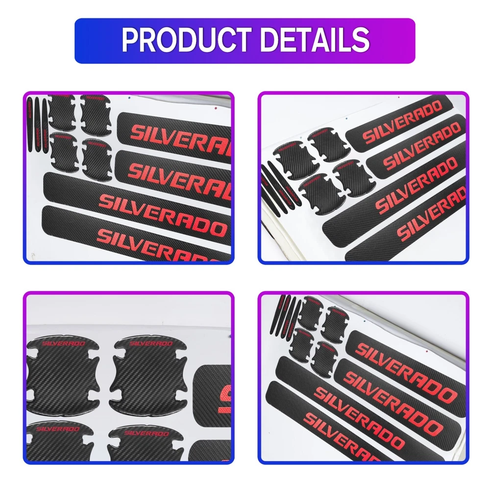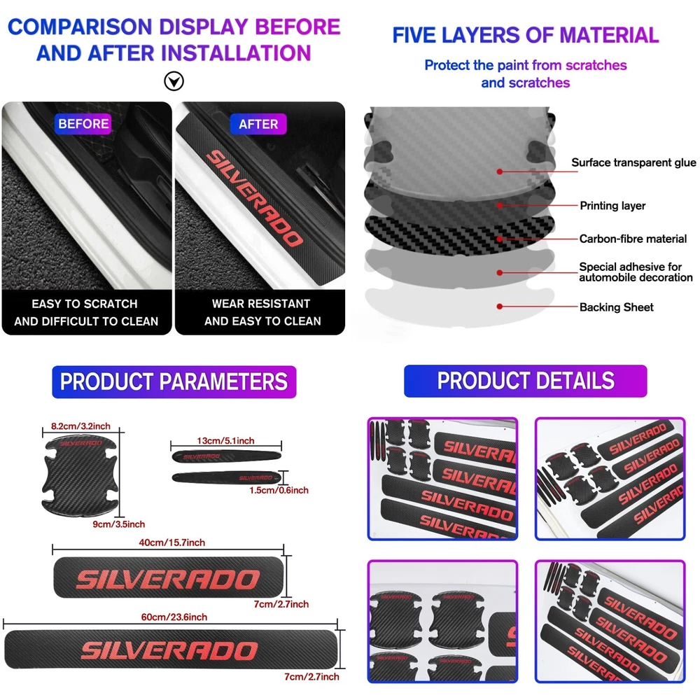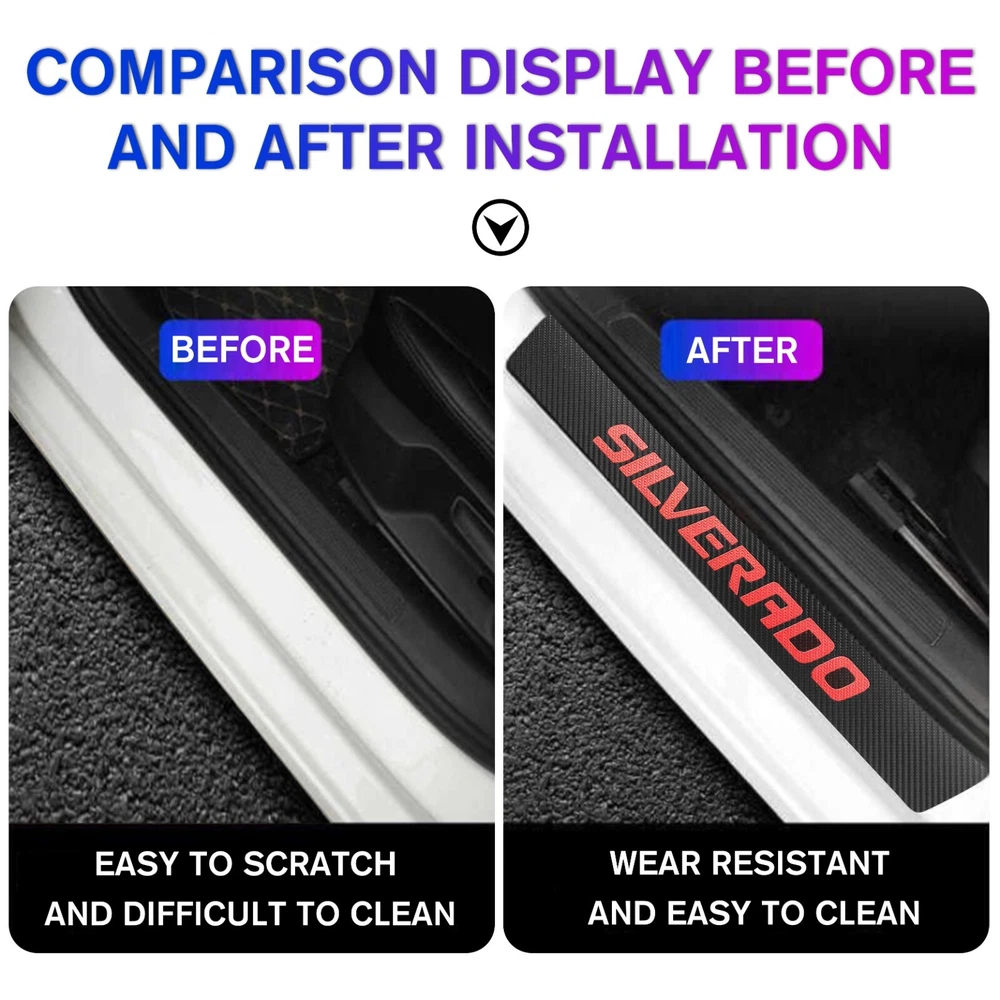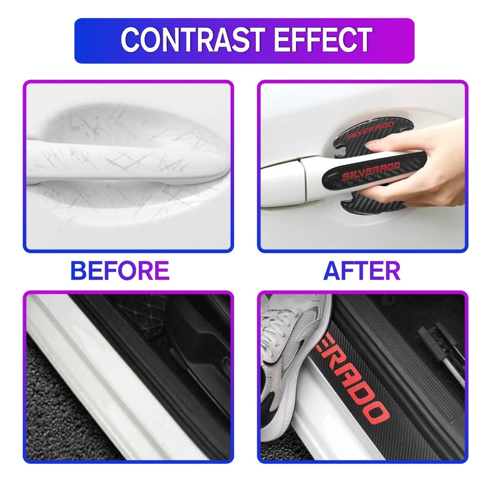 Door Sill Scuff Cover Stickers Made of high quality Carbon Fiber Textured Faux Leather, Anti Scratch and abrasion resistant, durable and effective in protecting car door sills. Easy Installation: P lease wipe the car door sill clean before installing, to ensure that there is no oil and dust first, then remove the protective paper on the back of the sticker, gently stick on the door sill above to ensure that no air bubbles are generated. Simple Maintenance: When the car door sill protector reflective sticker is stained with dirt or oil, simply wipe it with a damp rag and it will look like new with a gentle wipe. Door Cup Stickers & Door Handle Stickers Material: Carbon Fiber Texture Vinyl Stickers + Epoxy Resin Self adhesive , won’t fall of easily, will keep your door cups looking like new, without changing the appearance in any weather. No more scratches to the door handle cups Easy to Install: Clean car door handle cup and let it dry, then tear off the protector film from adhesive backing, stick film onto the cup and adjust the perfect position. Package Included : 4PCS Door Sill Scuff Cover Stickers (2 Front + 2 Rear) 4PCS Door Cup Stickers 4PCS Door Handle Stickers