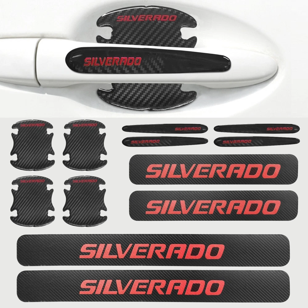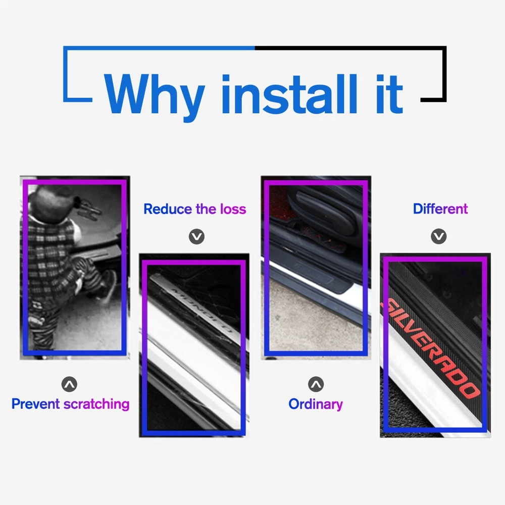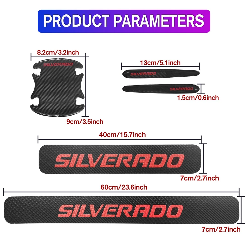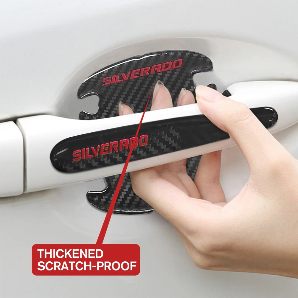 Door Sill Scuff Cover Stickers Made of high quality Carbon Fiber Textured Faux Leather, Anti Scratch and abrasion resistant, durable and effective in protecting car door sills. Easy Installation: P lease wipe the car door sill clean before installing, to ensure that there is no oil and dust first, then remove the protective paper on the back of the sticker, gently stick on the door sill above to ensure that no air bubbles are generated. Simple Maintenance: When the car door sill protector reflective sticker is stained with dirt or oil, simply wipe it with a damp rag and it will look like new with a gentle wipe. Door Cup Stickers & Door Handle Stickers Material: Carbon Fiber Texture Vinyl Stickers + Epoxy Resin Self adhesive , won’t fall of easily, will keep your door cups looking like new, without changing the appearance in any weather. No more scratches to the door handle cups Easy to Install: Clean car door handle cup and let it dry, then tear off the protector film from adhesive backing, stick film onto the cup and adjust the perfect position. Package Included : 4PCS Door Sill Scuff Cover Stickers (2 Front + 2 Rear) 4PCS Door Cup Stickers 4PCS Door Handle Stickers
