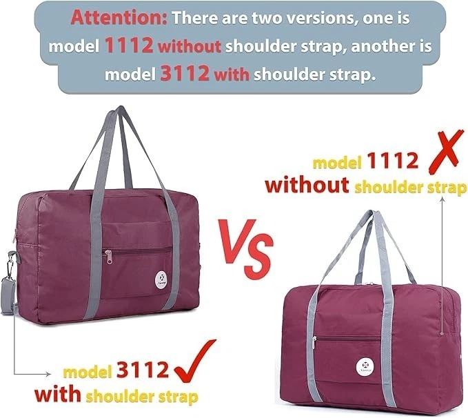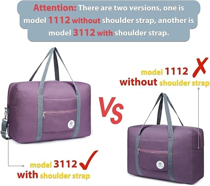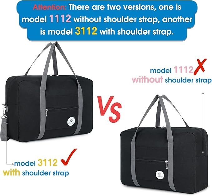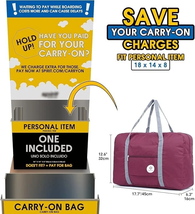 For Spirit Airlines Personal Item Bag 18x14x8 Foldable Travel Duffel Bag Tote Carry on Luggage Duffle Overnight for Women and Men About this item WATERPROOF - Solid straps bear the weight more than 45 pounds, no need to worry any ripping or break during trips. Made of waterproof fabric to protect your gears well from rain or wet. No extra shoulder strap is included for model 1112. If you prefer to have a strap, pls refer to model 3112 or 1109 Important:【Model:T1112】The bag size is 17.7 x 12.6 x 6.3 inch fits personal item size 18 x 14 x 8 inch of Spirit Airlines & Frontier Airlines, which can be placed under seat and no need to pay carry-on. We compare the bag to 15.6 inch laptop for you to better understand real bag size, pls double check the size before purchase to ensure it meets your expectation PACKABLE & LIGHTWEIGHT - Folding up when not use. Capacity 25L yet only 7.2 ounce offer the same packing space as a small suitcase - minus the weight and bulkiness EASY CARRYING - Its external storage pocket offers quick access to small items. The pouch as a strap enables the duffel to fit over the handle of common suitcase 18 20 24 26 28 32 inch for easy carrying VERSATILE - Easily held all your gym or travel items, ideal for garment bag, sports, gym use, yoga, travel, weekend shopping, overnight, camping and picnic